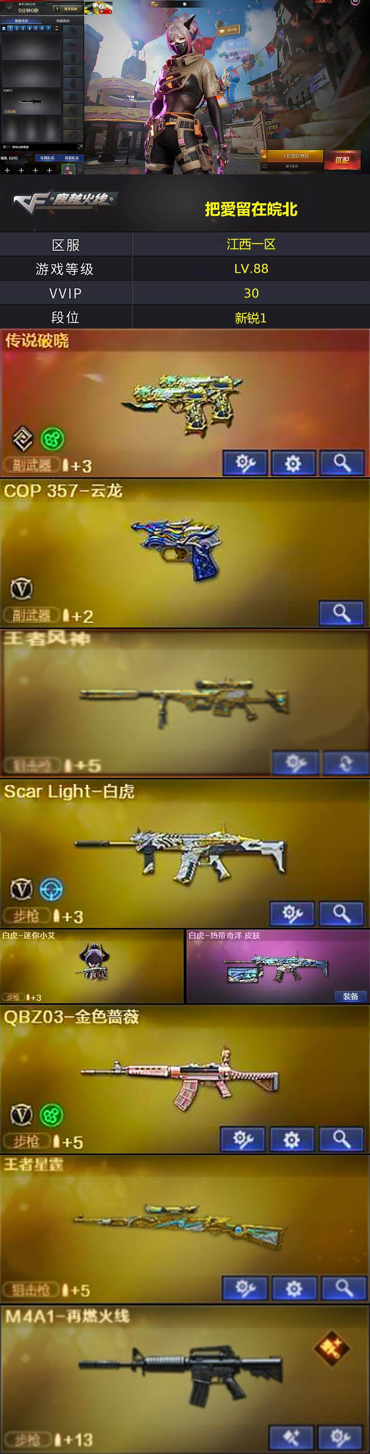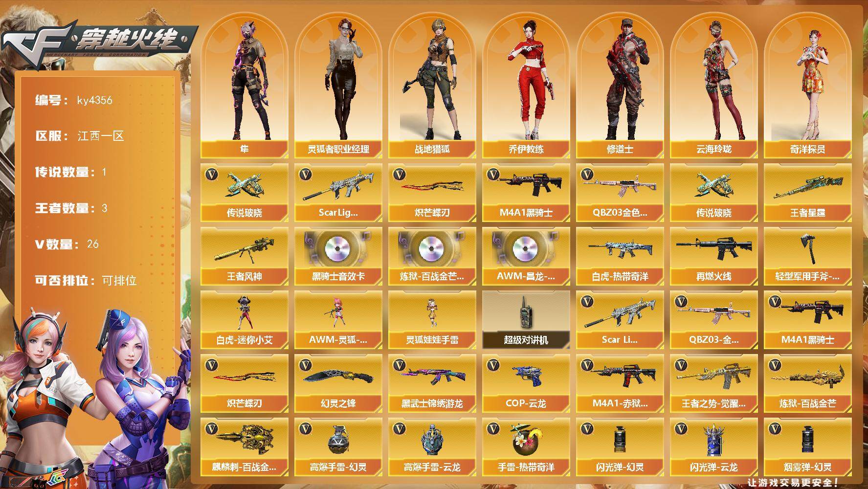 [15247614]江西一区-26V-3王者-0炫金 【传说武器】:传说破晓 【热门武器】:传说破晓,QBZ03-金色蔷薇,Scar Light-白虎,M4A1-黑骑士,炽芒蝶刃 【王者炫金武器】:王者风神,王者星霆 【音效卡】:M4A1-黑骑士音效卡,炼狱-百战金芒-庆典舞曲音效卡,AWM-昌龙-怀旧音效卡 【皮肤】:白虎-热带奇洋 皮肤,M4A1-再燃火线,轻型军用手斧-再燃火线 【角色】:隼,战地猎狐,奇洋探员,乔伊教练,修道士,云海玲珑,初恋灵狐,风暴女,灵狐者-黄金海岸,灵狐者-职业经理,斯沃特-X 【人偶武器】:白虎-迷你小艾,AWM-灵狐-15周年嘉年华,灵狐娃娃手雷 【暴走生化】:超级对讲机 【英雄级武器】:M4A1-黑骑士,Scar Light-白虎,黑武士-锦绣游龙,QBZ03-金色蔷薇,王者之势-觉醒版,炼狱-百战金芒,COP 357-云龙,幻灵之锋*2,炽芒蝶刃,麒麟刺-百战金芒,高爆手雷-幻灵*2,高爆手雷-云龙,手雷-热带奇洋,闪光弹-幻灵,闪光弹-云龙*2,烟雾弹-幻灵*3,烟雾弹-云龙,M4A1-赤狱骑士 【道具】:CFS限定背包,云山科技背包,亚洲杯纪念炫彩背包,百战金芒炫彩背包,黑桃战神背包,女皇终结者-魔龙之吻,救世主-黑桃战神,黄金生化钩,绿色巨人,灵魂忍者*3,变异宝贝,迷雾幽灵*2,夺命之镰,防化服*3,金色流光-枪王排位,星辰流光-枪王排位,流光-鎏金之域,流光-再燃火线,枪王排位28赛季金色流光,枪王排位29赛季金色流光,语音特效-盛典烟火,萌萌小葵表情,热带奇洋表情,动感闪耀表情,云海游龙表情,EP战队名片,EP战队喷图,C4-再燃火线*2,防弹头盔*3,防弹衣*3,C4工具钳*2,手雷包*3 【特殊枪械】:1白虎,1黑骑士