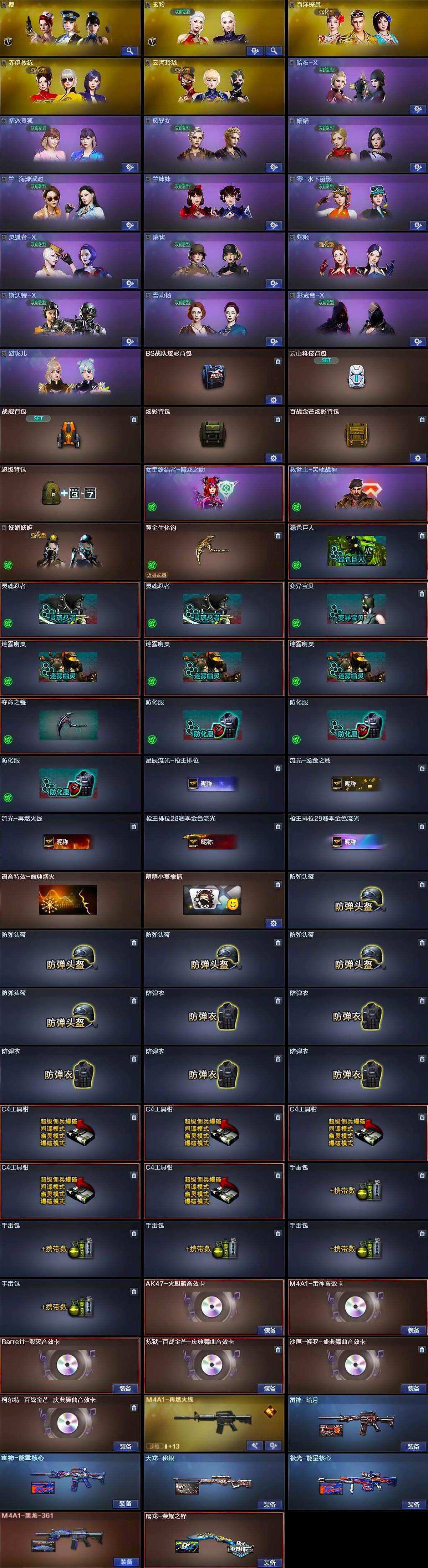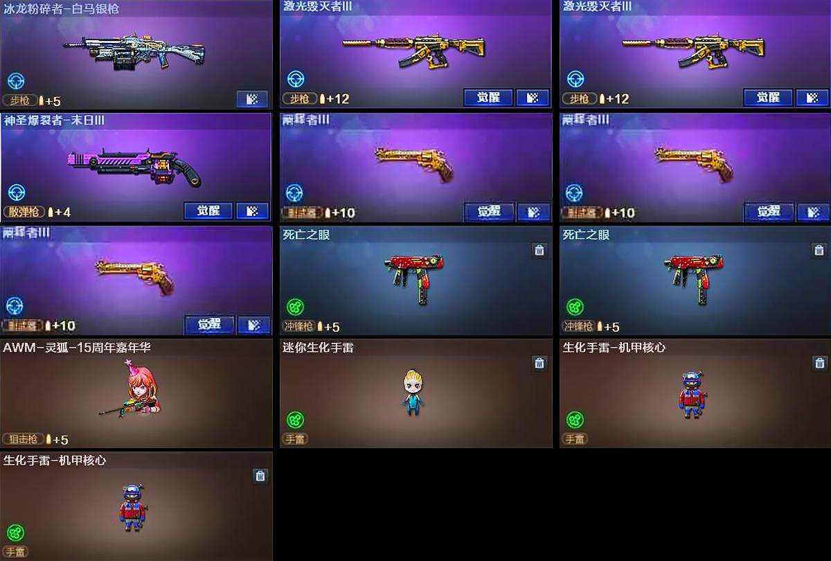 【英雄级武器】:AK47-火麒麟*2,AK47-麒麟,M4A1-黑龙*3,M4A1-雷神*2,M4A1-黑骑士*2,AK47-无影*2,M4A1-死神,AK47-黑武士*2,AK12-天启,AN94-超新星,AK47-机械迷城*3,AK47-黑鲨*3,M4A1-龙血*3,SCAR Light-玄豹,M4A1-玫瑰精灵,QBZ03-金色蔷薇,王者之魄-觉醒版,王者之戮-觉醒版,AWM-天龙,Barrett-毁灭*5,Barrett-极光,AWM-裁决,Barrett-金色蔷薇*3,RPK-盘龙*2,加特林-炼狱*4,炼狱-百战金芒,炼狱-悦蓝-觉醒版,汤姆逊-烈龙*8,沙鹰-修罗*8,沙鹰-天神*4,沙鹰-幻兽,Anaconda-玄豹,屠龙*5,龙啸*3,擎天,麒麟刺*3,女皇利刃-幻兽,麒麟刺-百战金芒,丛林匕首-玄豹*2,高爆手雷-幻兽,高爆手雷-玄豹*8,闪光弹-幻兽,闪光弹-玄豹*9,烟雾弹-幻兽,烟雾弹-玄豹*7,M4A1-赤狱骑士