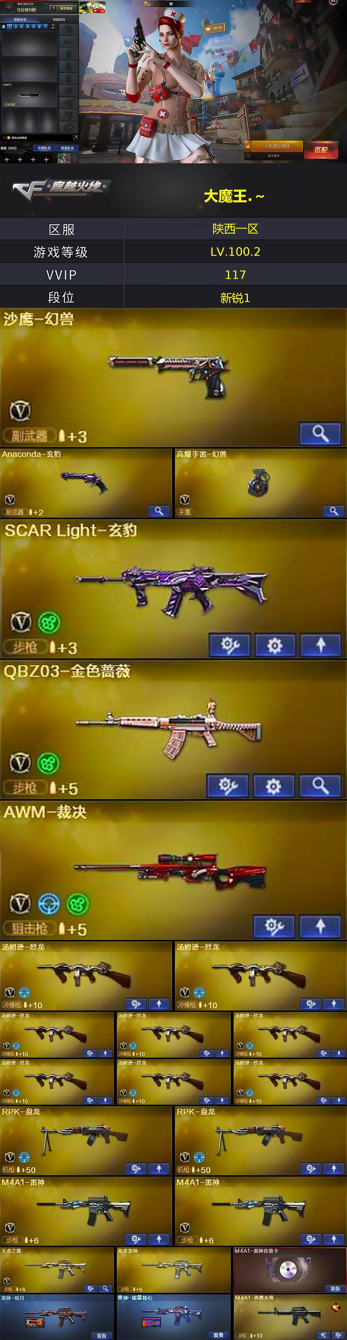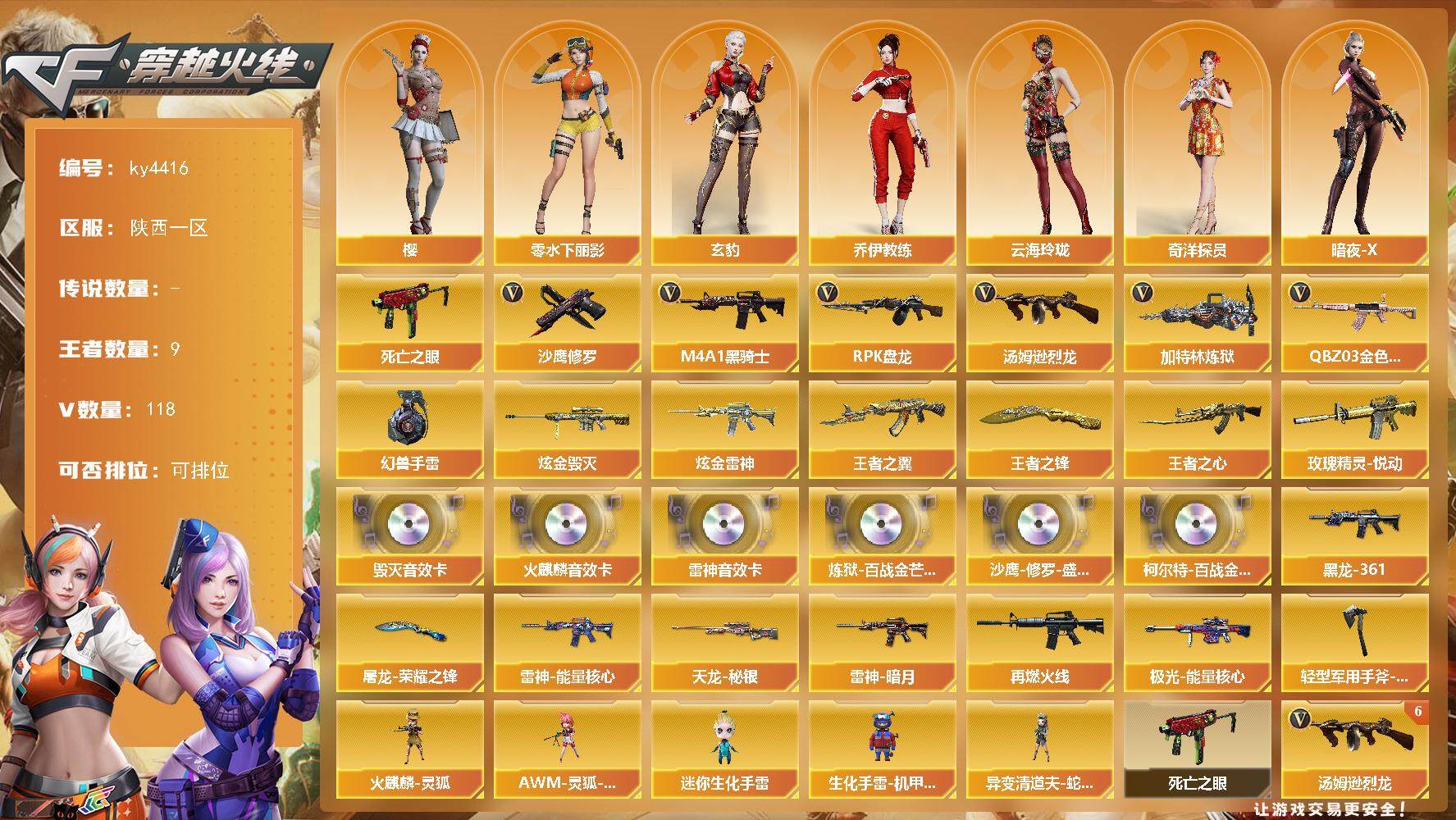 [15247936]陕西一区-118V-9王者-2炫金 【热门武器】:QBZ03-金色蔷薇,死亡之眼*2,M4A1-黑骑士*2,汤姆逊-烈龙*8,RPK-盘龙*2,加特林-炼狱*4,沙鹰-修罗*8,高爆手雷-幻兽 【王者炫金武器】:王者之翼*2,玫瑰精灵-悦动,王者之心,王者之锋*2,炫金雷神,炫金毁灭 【音效卡】:AK47-火麒麟音效卡,M4A1-雷神音效卡,Barrett-毁灭音效卡,炼狱-百战金芒-庆典舞曲音效卡,沙鹰-修罗-盛典舞曲音效卡,柯尔特-百战金芒-庆典舞曲音效卡 【皮肤】:雷神-暗月,雷神-能量核心,M4A1-再燃火线,M4A1-黑龙-361,天龙-秘银,极光-能量核心,屠龙-荣耀之锋,轻型军用手斧-再燃火线 【角色】:樱,玄豹,奇洋探员,乔伊教练,云海玲珑,暗夜-X,初恋灵狐,风暴女,娟娟,兰-海滩派对,兰妹妹,零-水下丽影,灵狐者-X,麻雀,蛇姬,斯沃特-X,雪莉杨,影武者-X,游珑儿 【人偶武器】:火麒麟-灵狐,异变清道夫-蛇影双骄,AWM-灵狐-15周年嘉年华,迷你生化手雷,生化手雷-机甲核心*2 【暴走生化】:死亡之眼*2 【挑战大师】:冰龙粉碎者-白马银枪,激光毁灭者III*2,神圣爆裂者-末日III,阐释者III*3 【英雄级武器】:AK47-火麒麟*2,AK47-麒麟,M4A1-黑龙*3,M4A1-雷神*2,M4A1-黑骑士*2,AK47-无影*2,M4A1-死神,AK47-黑武士*2,AK12-天启,AN94-超新星,AK47-机械迷城*3,AK47-黑鲨*3,M4A1-龙血*3,SCAR Light-玄豹,M4A1-玫瑰精灵,QBZ03-金色蔷薇,王者之魄-觉醒版,王者之戮-觉醒版,AWM-天龙,Barrett-毁灭*5,Barrett-极光,AWM-裁决,Barrett-金色蔷薇*3,RPK-盘龙*2,加特林-炼狱*4,炼狱-百战金芒,炼狱-悦蓝-觉醒版,汤姆逊-烈龙*8,沙鹰-修罗*8,沙鹰-天神*4,沙鹰-幻兽,Anaconda-玄豹,屠龙*5,龙啸*3,擎天,麒麟刺*3,女皇利刃-幻兽,麒麟刺-百战金芒,丛林匕首-玄豹*2,高爆手雷-幻兽,高爆手雷-玄豹*8,闪光弹-幻兽,闪光弹-玄豹*9,烟雾弹-幻兽,烟雾弹-玄豹*7,M4A1-赤狱骑士 【道具】:BS战队炫彩背包,云山科技背包,战舰背包,炫彩背包,百战金芒炫彩背包,超级背包,女皇终结