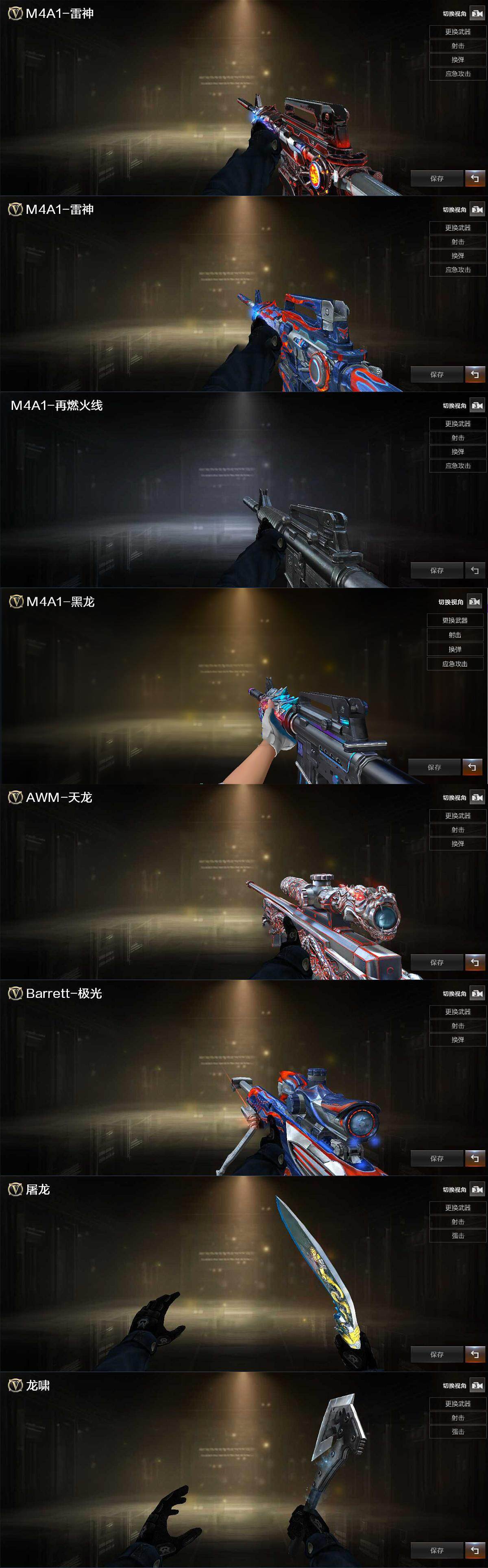 【皮肤】:雷神-暗月,雷神-能量核心,M4A1-再燃火线,M4A1-黑龙-361,天龙-秘银,极光-能量核心,屠龙-荣耀之锋,轻型军用手斧-再燃火线