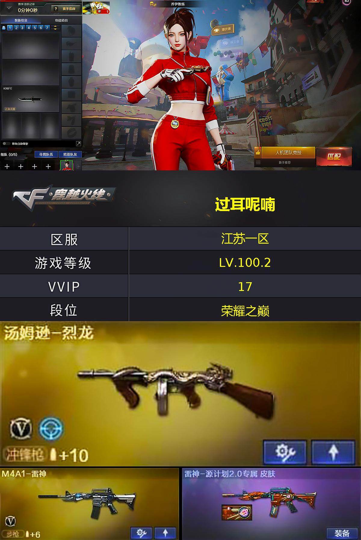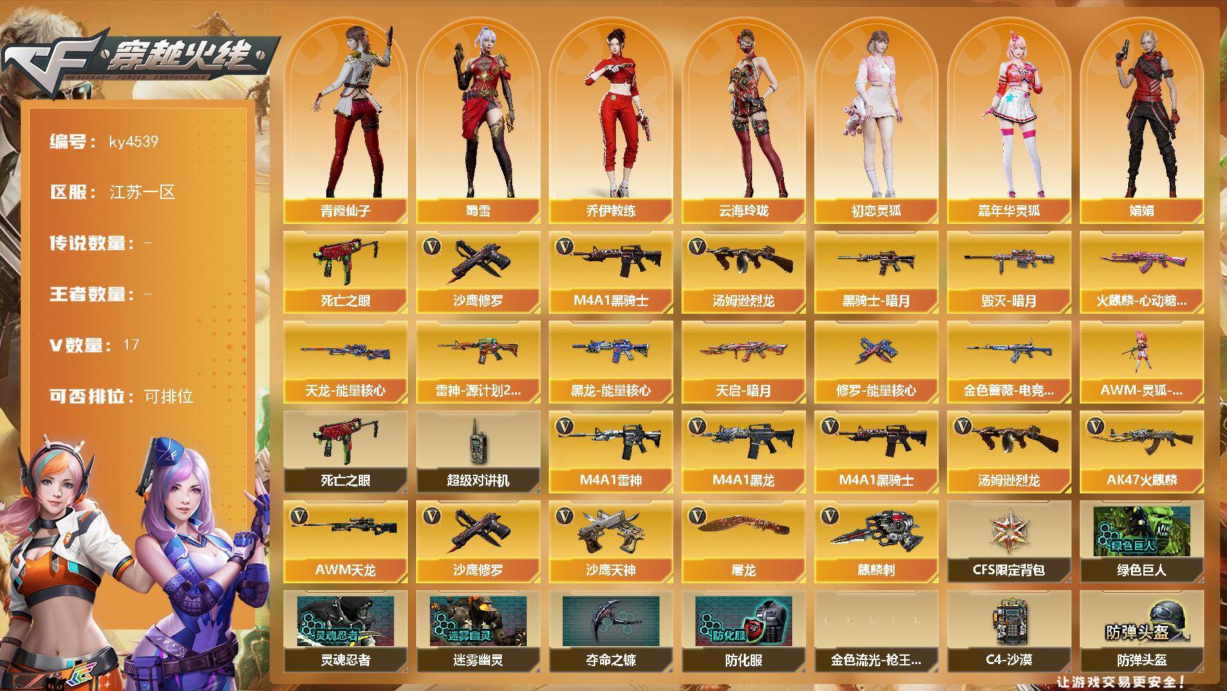 [15249195]江苏一区-17V-0王者-0炫金 【热门武器】:死亡之眼,M4A1-黑骑士,汤姆逊-烈龙,沙鹰-修罗*2 【皮肤】:金色蔷薇-电竞之星 皮肤,雷神-源计划2.0专属 皮肤,火麒麟-心动糖果,毁灭-暗月,黑龙-能量核心,黑骑士-暗月,天启-暗月*2,天龙-能量核心,修罗-能量核心 【角色】:乔伊教练,云海玲珑,初恋灵狐,嘉年华灵狐,娟娟,潘多拉-甜心教官,青霞仙子,斯沃特-X,蜀雪,影武者-X 【人偶武器】:AWM-灵狐-15周年嘉年华 【暴走生化】:死亡之眼,超级对讲机 【英雄级武器】:AK47-火麒麟*2,M4A1-黑龙*2,M4A1-雷神,M4A1-黑骑士,AWM-天龙,汤姆逊-烈龙,沙鹰-修罗*2,沙鹰-天神,屠龙*2,麒麟刺 【道具】:CFS限定背包,绿色巨人,灵魂忍者,迷雾幽灵,夺命之镰,防化服*2,金色流光-枪王排位,星辰流光-枪王排位,枪王排位28赛季金色流光,C4-沙漠,防弹头盔,防弹衣,C4工具钳,手雷包 【特殊枪械】:1黑骑士,1烈龙