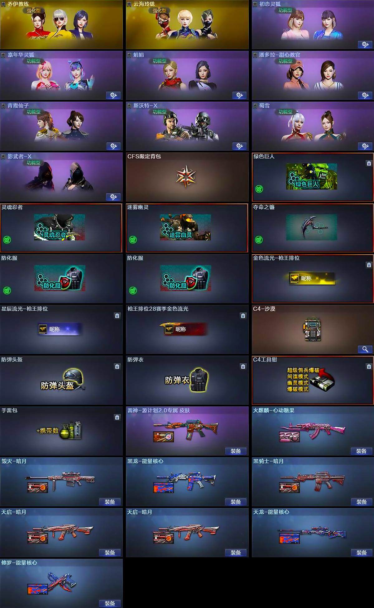 【道具】:CFS限定背包,绿色巨人,灵魂忍者,迷雾幽灵,夺命之镰,防化服*2,金色流光-枪王排位,星辰流光-枪王排位,枪王排位28赛季金色流光,C4-沙漠,防弹头盔,防弹衣,C4工具钳,手雷包
