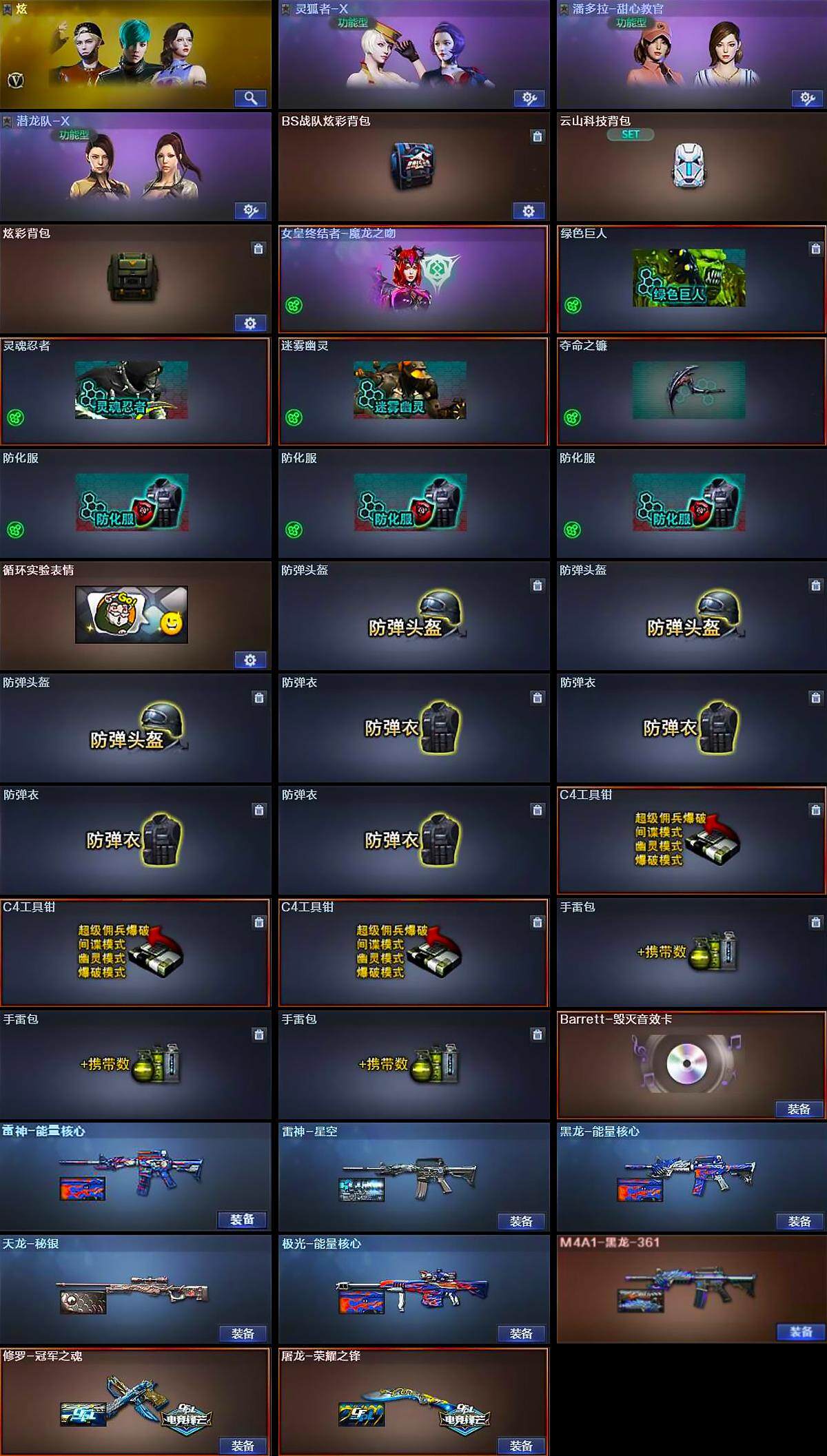 【道具】:BS战队炫彩背包,云山科技背包,炫彩背包,女皇终结者-魔龙之吻,绿色巨人,灵魂忍者,迷雾幽灵,夺命之镰,防化服*3,循环实验表情,防弹头盔*3,防弹衣*4,C4工具钳*3,手雷包*3