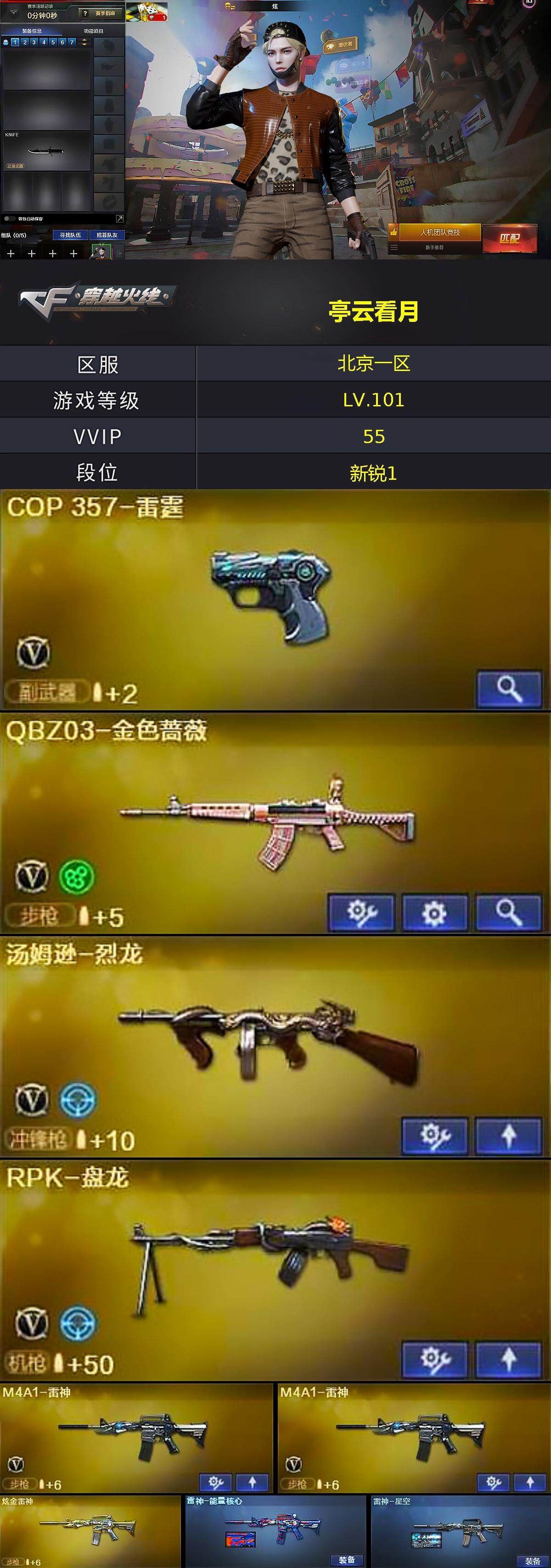 [15249447]北京一区-55V-4王者-6炫金 【热门武器】:QBZ03-金色蔷薇,M4A1-黑骑士,汤姆逊-烈龙,RPK-盘龙,沙鹰-修罗*3 【王者炫金武器】:王者之心,王者之光,王者之力,炫金雷神,炫金超新星*2,炫金毁灭*3 【音效卡】:Barrett-毁灭音效卡 【皮肤】:雷神-能量核心,雷神-星空,黑龙-能量核心,M4A1-黑龙-361,天龙-秘银,极光-能量核心,修罗-冠军之魂,屠龙-荣耀之锋 【角色】:炫,灵狐者-X,潘多拉-甜心教官,潜龙队-X 【人偶武器】:火麒麟-灵狐 【英雄级武器】:AK47-火麒麟*2,M4A1-黑龙,M4A1-雷神*2,M4A1-黑骑士,AK47-无影,M4A1-死神*2,AK47-黑武士*3,M4A1-武圣*2,AK47-黑鲨,M4A1-龙血*2,M4A1-雷霆,QBZ03-金色蔷薇,王者之翼-觉醒版,AK-47-猩红传说*2,AWM-天龙,Barrett-毁灭*3,Barrett-极光,RPK-盘龙,汤姆逊-烈龙,AA-12-雷霆,沙鹰-修罗*3,COP-雷霆,屠龙*5,龙啸,麒麟刺*4,高爆手雷-雷霆,烟雾弹-雷霆*6 【道具】:BS战队炫彩背包,云山科技背包,炫彩背包,女皇终结者-魔龙之吻,绿色巨人,灵魂忍者,迷雾幽灵,夺命之镰,防化服*3,循环实验表情,防弹头盔*3,防弹衣*4,C4工具钳*3,手雷包*3 【特殊枪械】:1黑骑士,1烈龙,1盘龙
