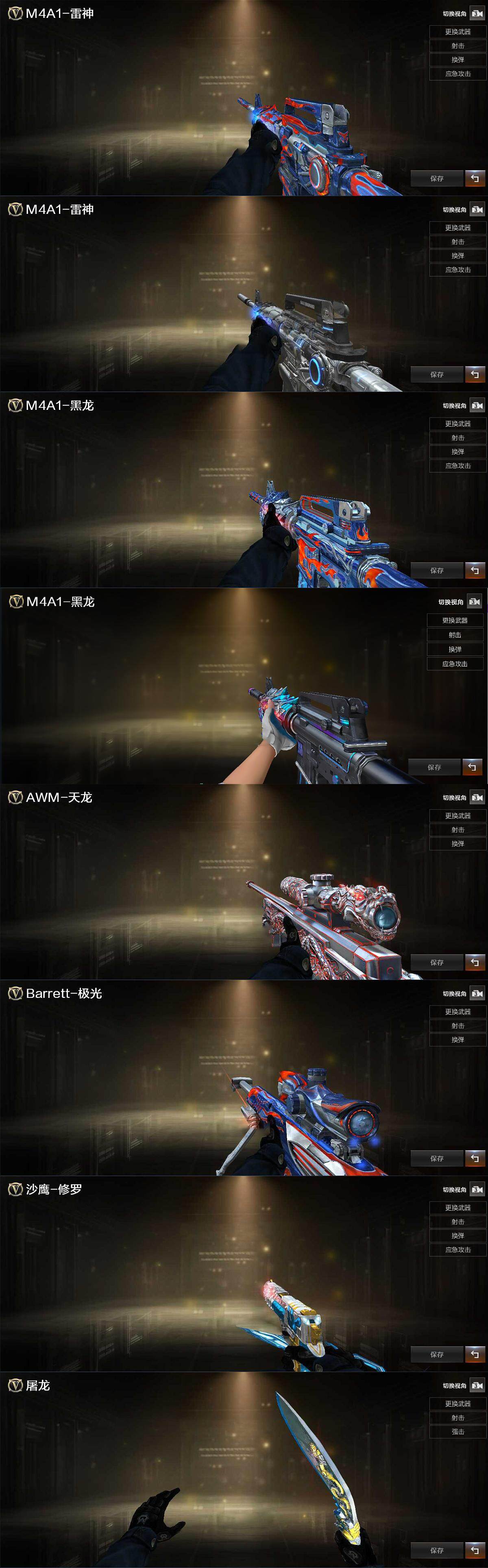 【皮肤】:雷神-能量核心,雷神-星空,黑龙-能量核心,M4A1-黑龙-361,天龙-秘银,极光-能量核心,修罗-冠军之魂,屠龙-荣耀之锋