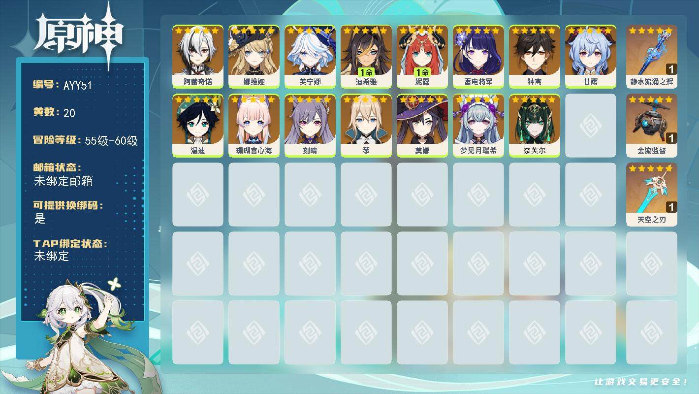 [15262546]56级/20黄/女主/15个五星角色/3个五星武器 0命阿蕾奇诺,0命娜维娅,0命芙宁娜,1命迪希雅,1命妮露,0命雷电将军,0命钟离,0命甘雨,0命温迪,0命珊瑚宫心海,0命刻晴,0命琴,0命莫娜,0命梦见月瑞希,0命奈芙尔,精1静水流涌之辉,精1金流监督,精1天空之刃