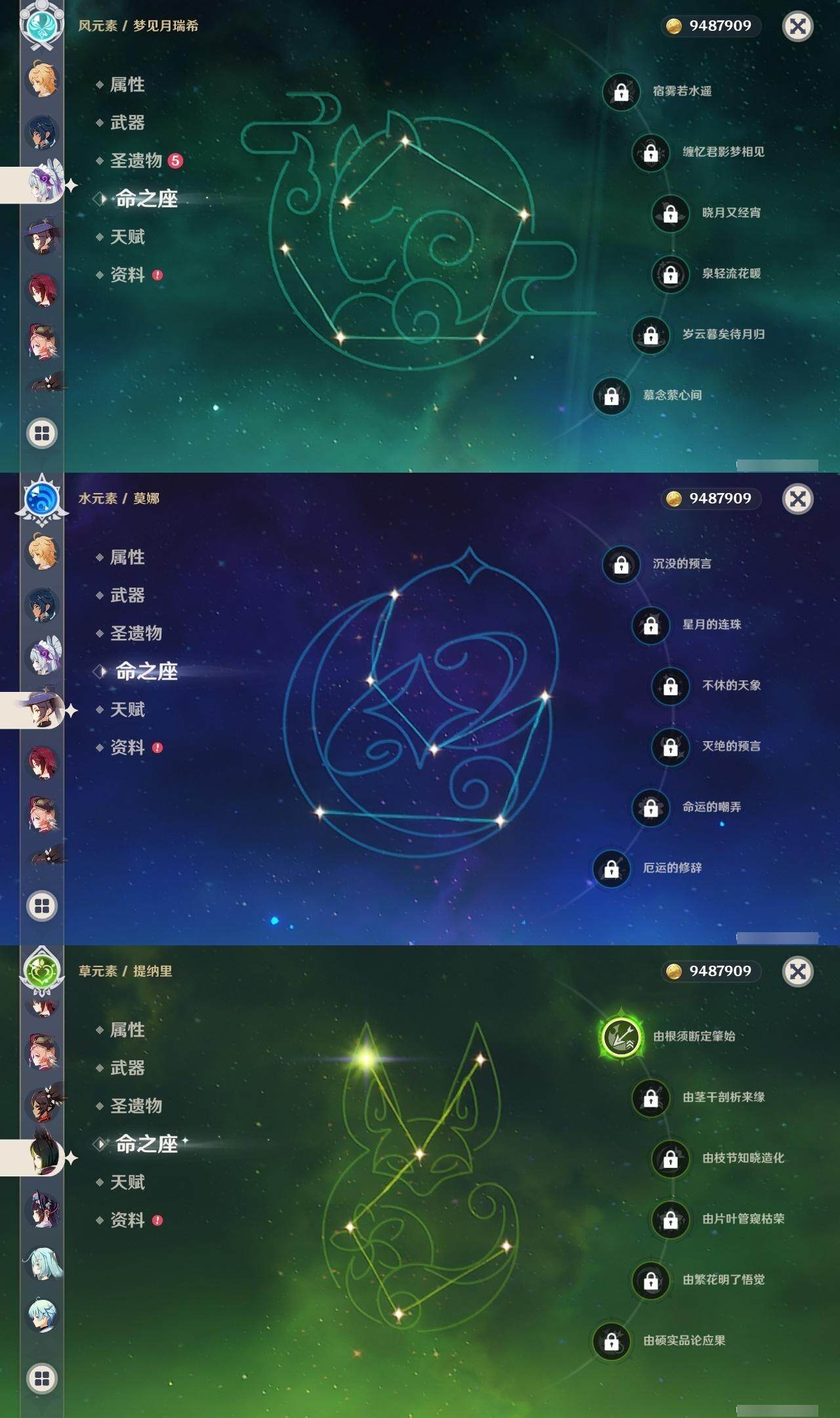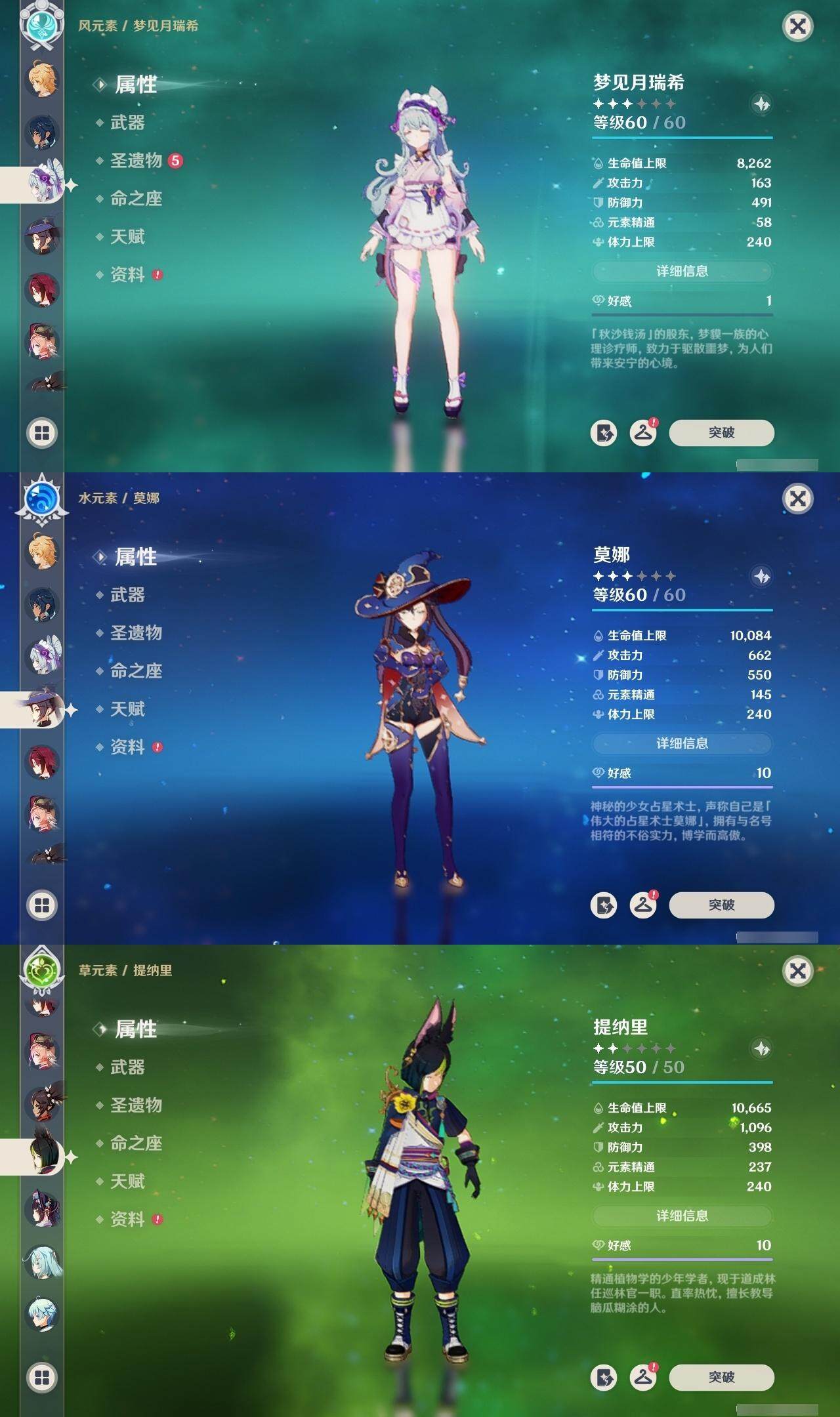 0命阿蕾奇诺,0命芙宁娜,0命迪希雅,0命纳西妲,1命提纳里,0命雷电将军,0命枫原万叶,0命神里绫华,0命钟离,0命胡桃,0命甘雨,0命可莉,0命刻晴,1命七七,1命琴,0命莫娜,2命迪卢克,0命玛拉妮,0命梦见月瑞希,精1裁断,精1静水流涌之辉,精1雾切之回光,精1护摩之杖,精2四风原典,精1和璞鸢,精1天空之刃,精1岩峰巡歌,精1山王长牙,精1冲浪时光