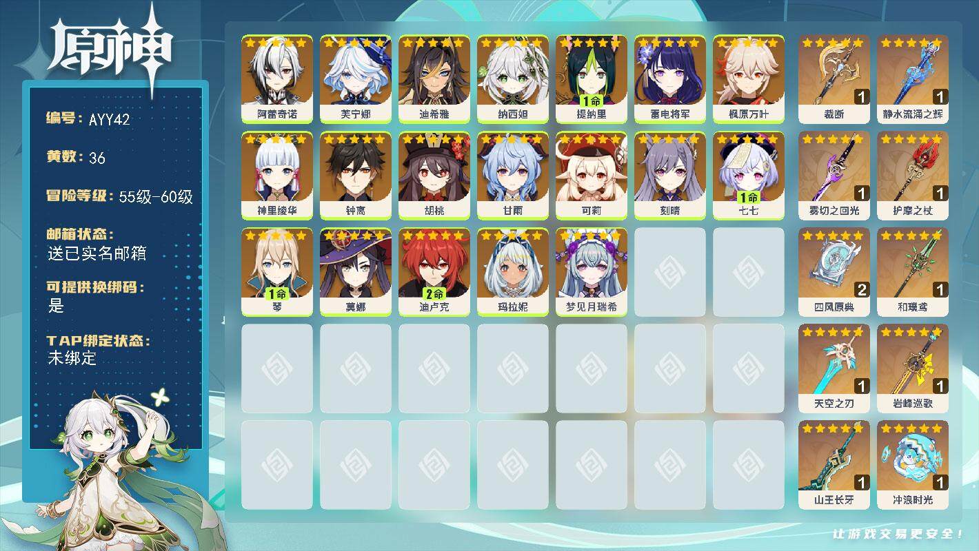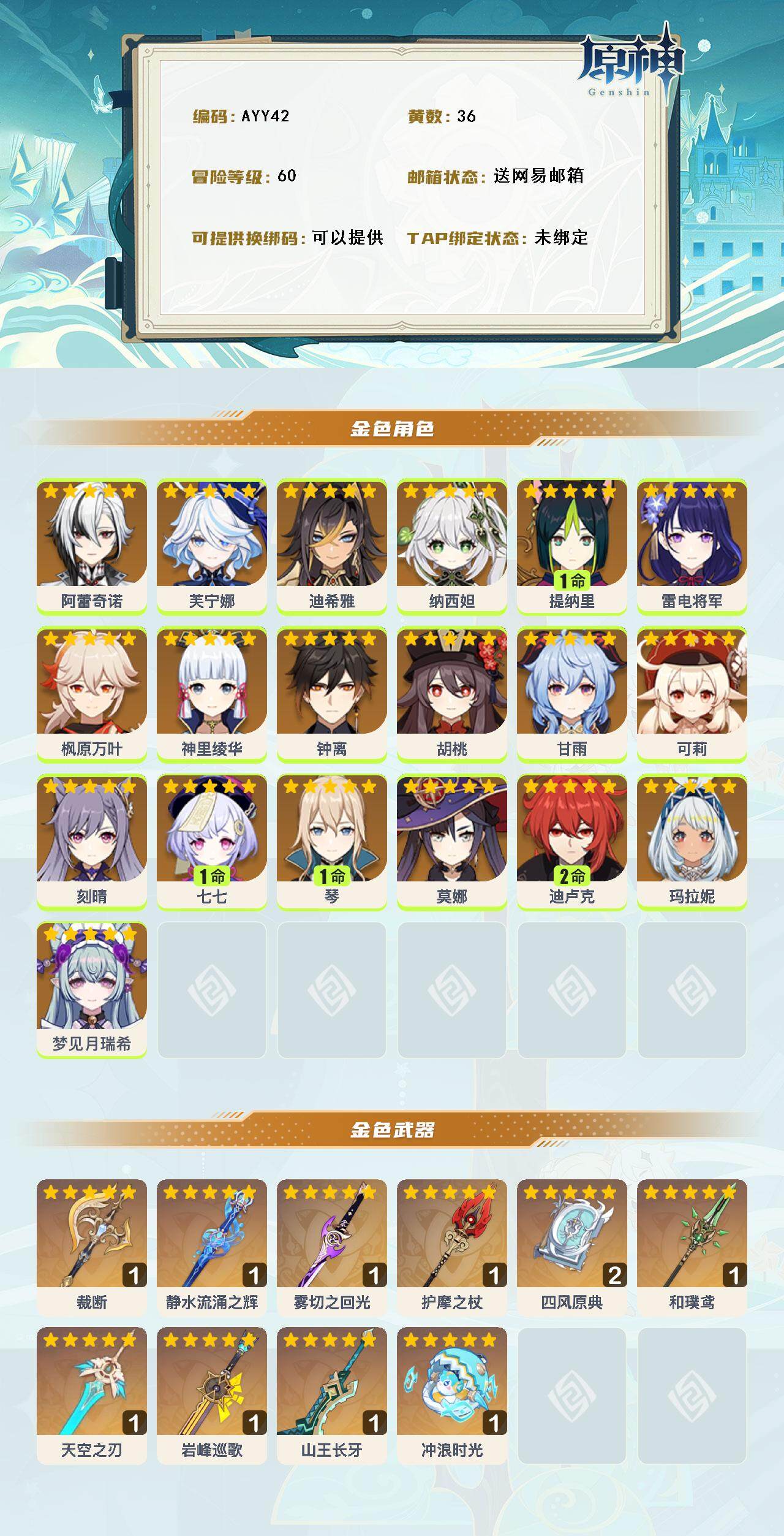 [15263283]60级/36黄/男主/19个五星角色/11个五星武器 0命阿蕾奇诺,0命芙宁娜,0命迪希雅,0命纳西妲,1命提纳里,0命雷电将军,0命枫原万叶,0命神里绫华,0命钟离,0命胡桃,0命甘雨,0命可莉,0命刻晴,1命七七,1命琴,0命莫娜,2命迪卢克,0命玛拉妮,0命梦见月瑞希,精1裁断,精1静水流涌之辉,精1雾切之回光,精1护摩之杖,精2四风原典,精1和璞鸢,精1天空之刃,精1岩峰巡歌,精1山王长牙,精1冲浪时光