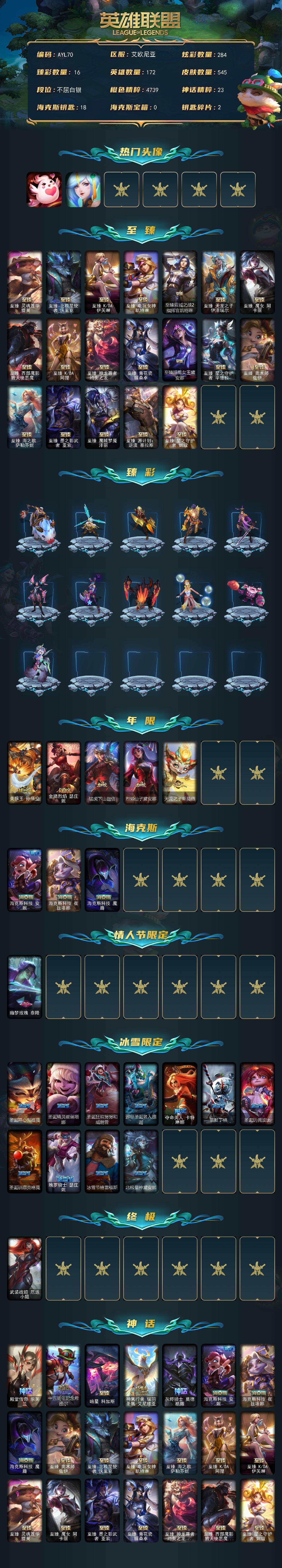 [15263700]【店主推荐捡漏价!可直接换绑】白银段位-172英雄-545皮肤-284炫彩-1终极-27神话-64限定-77传说-89史诗