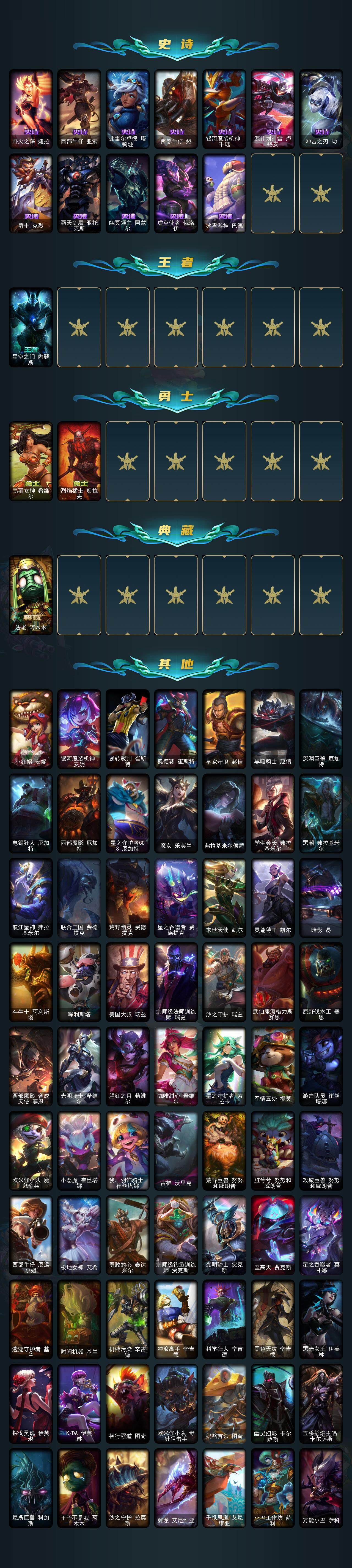 【神话皮肤】:殿堂传奇乐芙兰,十五周年纪念希维尔,暗星科加斯,神凰行者瑞羽圣凰艾尼维亚,灰烬骑士莫德凯撒,海克斯科技安妮,海克斯科技崔丝塔娜,海克斯科技魔腾,至臻天龙之子伊泽瑞尔,至臻奥术师佐伊,至臻北极星使者沃里克,至臻电玩女神凯特琳,至臻海之歌萨勒芬妮,至臻KDA阿狸,至臻KDA伊芙琳,至臻灵魂莲华提莫,至臻魔女阿卡丽,至臻墨之影武者亚索,至臻青花瓷丽桑卓,至臻神龙尊者均衡之龙沃利贝尔,至臻西部魔影猎天使恶魔泰隆,至臻星之守护者妮蔻,至臻星之守护者辛德拉,至臻源计划逆流塞拉斯