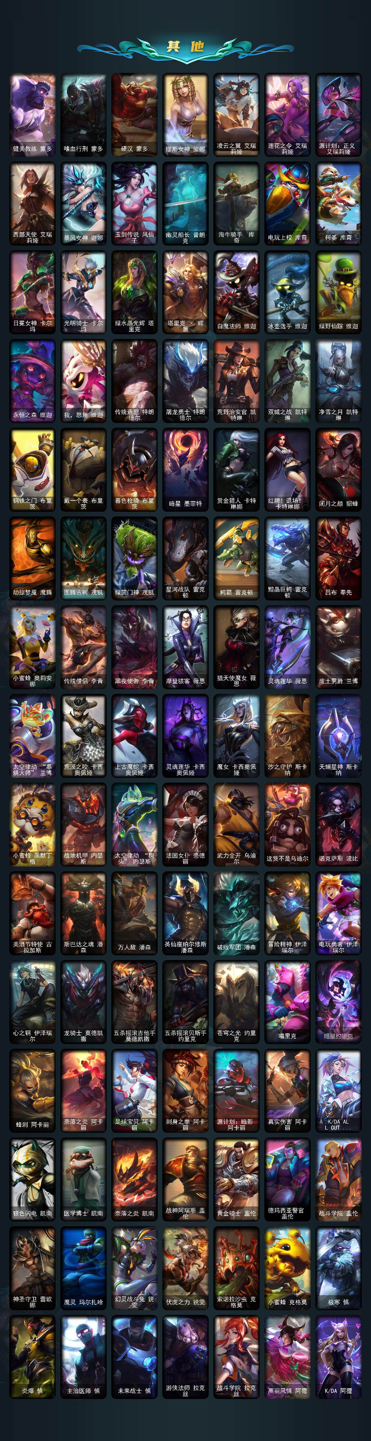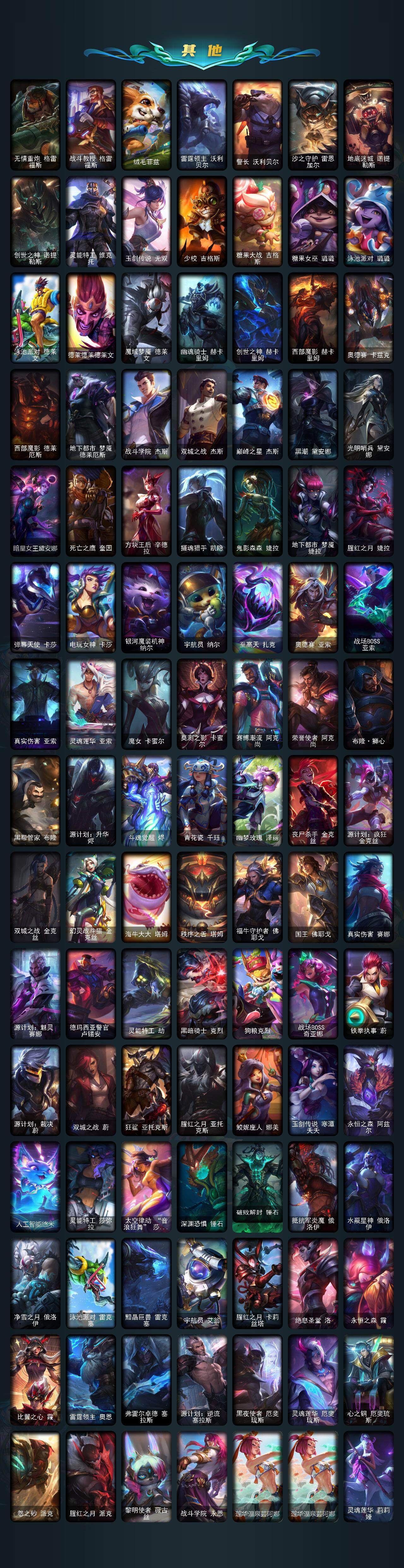 【冰雪限定】:圣诞开心鬼提莫,圣诞精灵崔丝塔娜,圣诞狂欢努努和威朗普,邪恶圣诞老人维迦,夺命美人卡特琳娜,雪默丁格,圣诞玩偶波比,圣诞驯鹿克格莫,魄罗骑士瑟庄妮,冰雪节格雷福斯,北极星神黛安娜