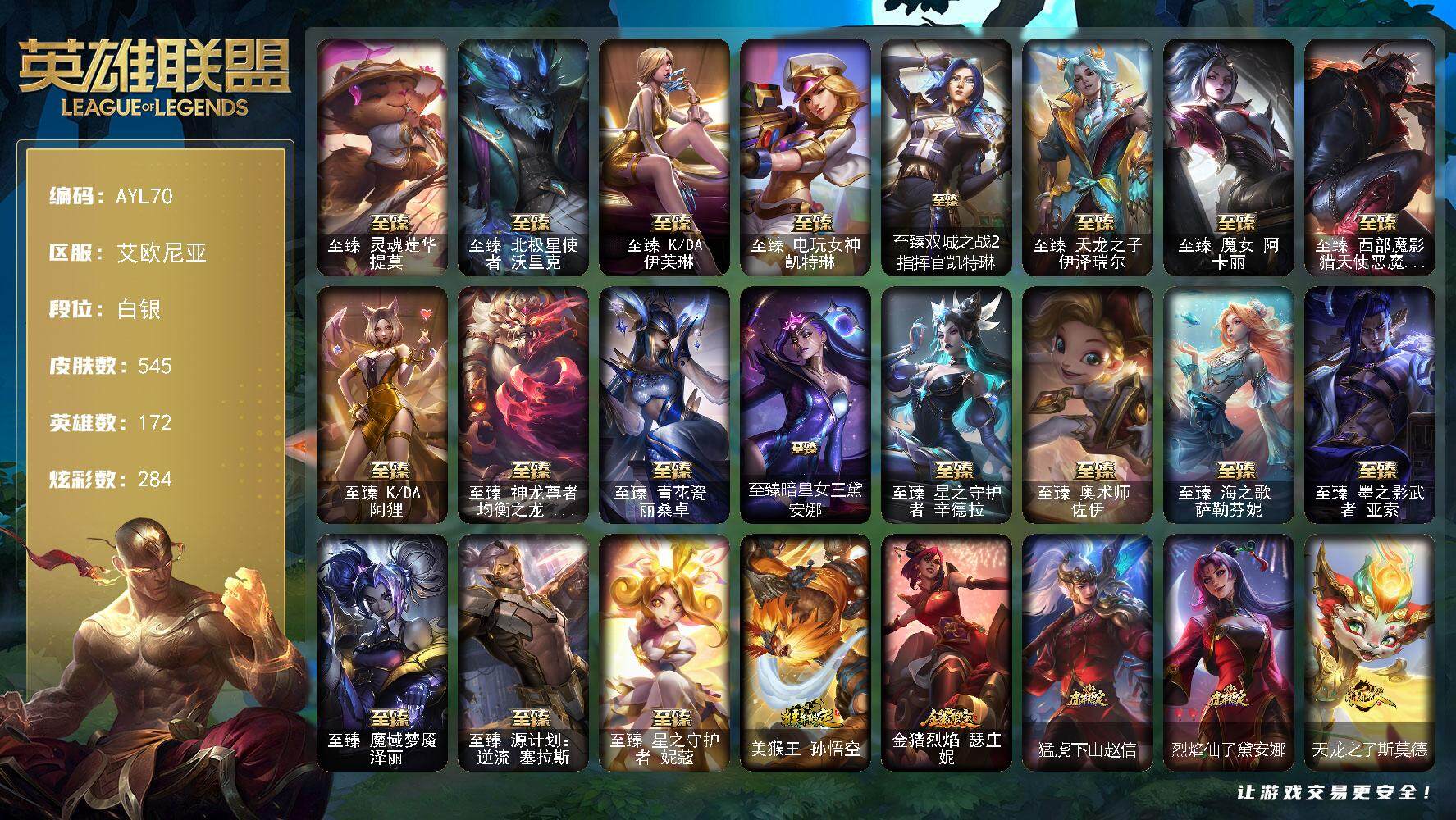 [15263700]【店主推荐捡漏价!可直接换绑】白银段位-172英雄-545皮肤-284炫彩-1终极-27神话-64限定-77传说-89史诗 【热门头像】:爱情鸽头像,春晖神女头像 【至臻皮肤】:至臻灵魂莲华提莫,至臻北极星使者沃里克,至臻KDA伊芙琳,至臻电玩女神凯特琳,至臻双城之战2指挥官凯特琳,至臻天龙之子伊泽瑞尔,至臻魔女阿卡丽,至臻西部魔影猎天使恶魔泰隆,至臻KDA阿狸,至臻神龙尊者均衡之龙沃利贝尔,至臻青花瓷丽桑卓,至臻暗星女王黛安娜,至臻星之守护者辛德拉,至臻奥术师佐伊,至臻海之歌萨勒芬妮,至臻墨之影武者亚索,至臻魔域梦魇泽丽,至臻源计划逆流塞拉斯,至臻星之守护者妮蔻 【臻彩皮肤】:天龙之子卡莎飞龙乘云,无畏骑士瑟庄妮赤子初心,冰霜之刃艾瑞莉娅炫金,墨之影武者亚索金墨耀影,征服者韦鲁斯炫金,神龙尊者圣龙李青龙腾云起,玉剑传说无极麒麟,弹幕天使卡莎炽天使勇敢,星之守护者金克丝黑洞,山海绘卷科加斯朱红,泳池派对辛德拉荔枝枝连击,可爱可爱粉红红布里茨,殿堂传奇乐芙兰登神,魔女阿卡丽虚荣,净雪之月莫甘娜冬虹,心之钢伊泽瑞尔天纵才华 【年限皮肤】:美猴王孙悟空,金猪烈焰瑟庄妮,猛虎下山赵信,烈焰仙子黛安娜,天龙之子斯莫德 【海克斯皮肤】:海克斯科技安妮,海克斯科技崔丝塔娜,海克斯科技魔腾 【情人节限定】:幽梦玫瑰泰隆 【冰雪限定】:圣诞开心鬼提莫,圣诞精灵崔丝塔娜,圣诞狂欢努努和威朗普,邪恶圣诞老人维迦,夺命美人卡特琳娜,雪默丁格,圣诞玩偶波比,圣诞驯鹿克格莫,魄罗骑士瑟庄妮,冰雪节格雷福斯,北极星神黛安娜 【终极皮肤】:武装战姬厄运小姐 【神话皮肤】:殿堂传奇乐芙兰,十五周年纪念希维尔,暗星科加斯,神凰行者瑞羽圣凰艾尼维亚,灰烬骑士莫德凯撒,海克斯科技安妮,海克斯科技崔丝塔娜,海克斯科技魔腾,至臻天龙之子伊泽瑞尔,至臻奥术师佐伊,至臻北极星使者沃里克,至臻电玩女神凯特琳,至臻海之歌萨勒芬妮,至臻KDA阿狸,至臻KDA伊芙琳,至臻灵魂莲华提莫,至臻魔女阿卡丽,至臻墨之影武者亚索,至臻青花瓷丽桑卓,至臻神龙尊者均衡之龙沃利贝尔,至臻西部魔影猎天使恶魔泰隆,至臻星之守护者妮蔻,至臻星之守护者辛德拉,至臻源计划逆流塞拉斯 【限定皮肤】:舞会公主安妮,冠军典狱长锤石,冠军之刃锐雯2016,Fnatic迦娜,暗杀星蒙多,暗杀星慎,暗杀星伊泽瑞尔,SKTT1劫,SSW辛吉德,SSW雷恩加尔
