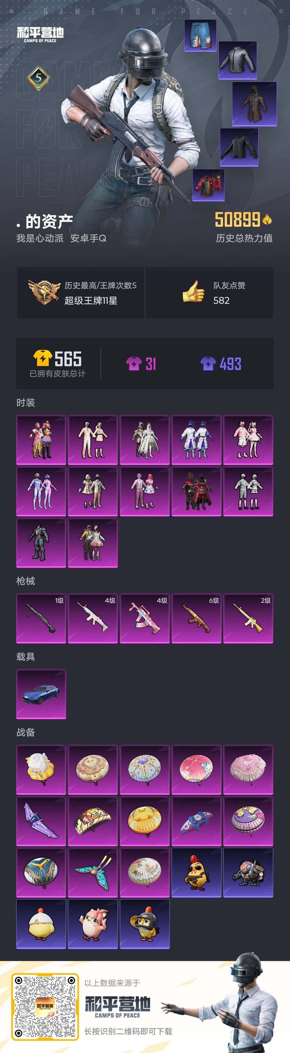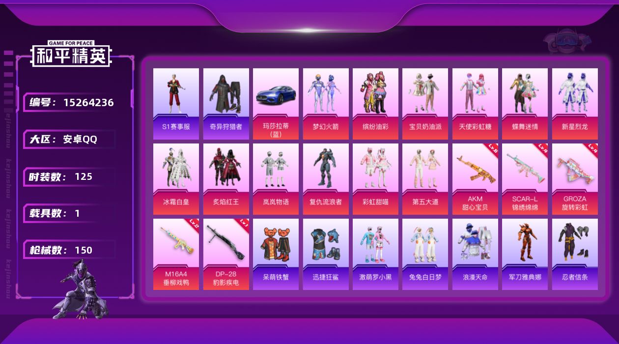 - [15649965]【店主推荐捡漏号!可直接换绑】安卓 手Q-2神装-36粉装-13特效枪-14载具-6粉色飞行器-110618热力值-13王牌印记-197套装-237枪皮 【红色载具】:宾利欧陆GT敞篷(深空蓝)(五级) 【红色神装等级】:沙丘之主-图卡盟(二级),角色-银枪赵云(一级) 【红色角色神装】:沙丘之主-图卡盟,角色-银枪赵云 【热门品类】:粉装-雪国幻梦,粉装-梦幻火箭,粉装-缤纷油彩,套装-都市猎人,套装-冥河战士,套装-小丑鱼,套装-奇异狩猎者,角色-军刀雅典娜,套装-动感兔斯基人偶服,角色-2B战斗服款,角色-忠猛周仓,角色-忠真马岱,角色-忠义严颜,套装-龟仙人,套装-潮萌小黄鸭,套装-暗影哥特,大砍刀-青龙偃月刀 【粉色套装】:粉装-宝贝奶油派,粉装-天使彩虹糖,粉装-雪国幻梦,粉装-梦幻火箭,粉装-智能音符,粉装-缤纷油彩,粉装-草莓生巧,粉装-炙焰红王,粉装-暗夜玫瑰,角色-洛天依,粉装-俏雪含霜,角色-零号机款机体服,角色-初号机款机体服,角色-2号机款机体服,粉装-傲雪凌霜,粉装-冰川粉黛,粉装-冰川幽秘,粉装-冰川红玫,粉装-绿野邂逅,角色-白勺歌姬,角色-呆萌星弥,角色-小可学妹,粉装-玉鳞金羽,粉装-天星战神,粉装-未来歌姬,角色-水仙星,角色-星云暗核,粉装-暖暖奶龙,角色-冰炎战车,角色-紫钛骑兵,角色-圣堂之誓,角色-小叽联名款,角色-电磁星,角色-狂魅哈莉,角色-狂魇小丑,角色-冷漠罗丽【粉色枪皮等级】:AKM-甜心宝贝(五级),SCAR-L-梦幻火箭(七级),SCAR-L-机甲封神(四级),M416-五爪金龙(七级),AUG-南国舞曲(四级),P90-沙丘之主(三级),Kar98K-未来歌姬(三级),Kar98K-巳巳如意(五级),AWM-橘柚倾心(三级),SLR-暗夜玫瑰(二级),AMR-智耀战神(四级),DP-28-豹影疾电(二级),PKM-天星战神(二级)【粉色载具】:路特斯EVIJA(星际黄),路特斯ELETRE(冰川蓝),玛莎拉蒂Quattroporte(夜幕蓝),玛莎拉蒂Ghibli(粉),宾利欧陆GT敞篷(深空蓝),布加迪威龙(海洋蓝),幻影随行,海龙奔腾,飞驰奶龙龙,俏皮小熊猫,糖心拉力赛车(波动紫),双人摩托-梦幻火箭,僚机-萌兔起飞,赤兔,照夜玉狮子【粉色枪皮】:AKM-甜心宝贝,SCAR-L-梦幻火箭,SCAR-