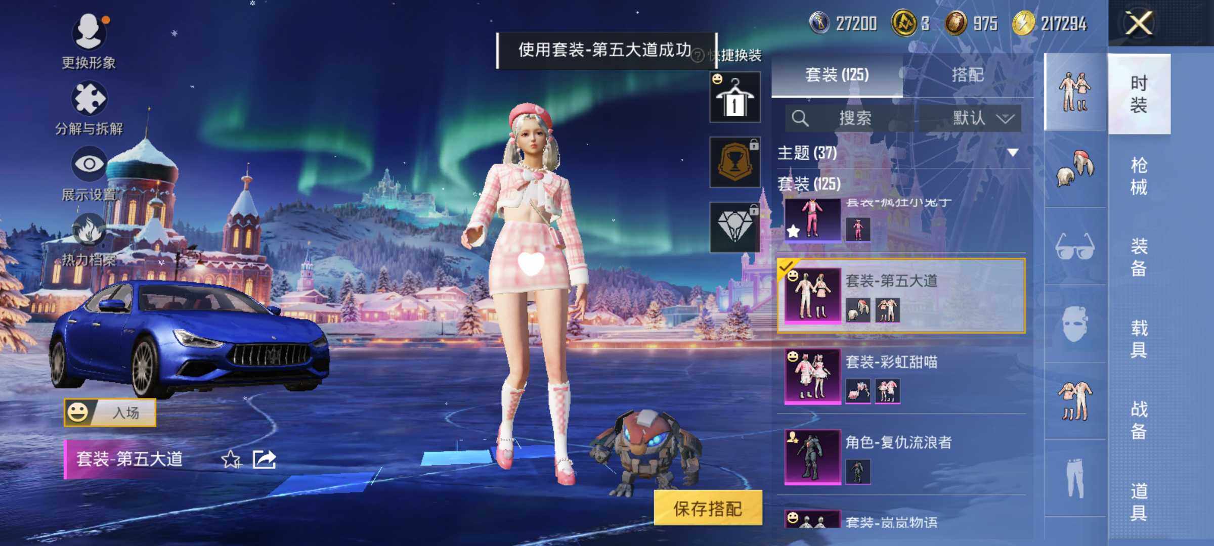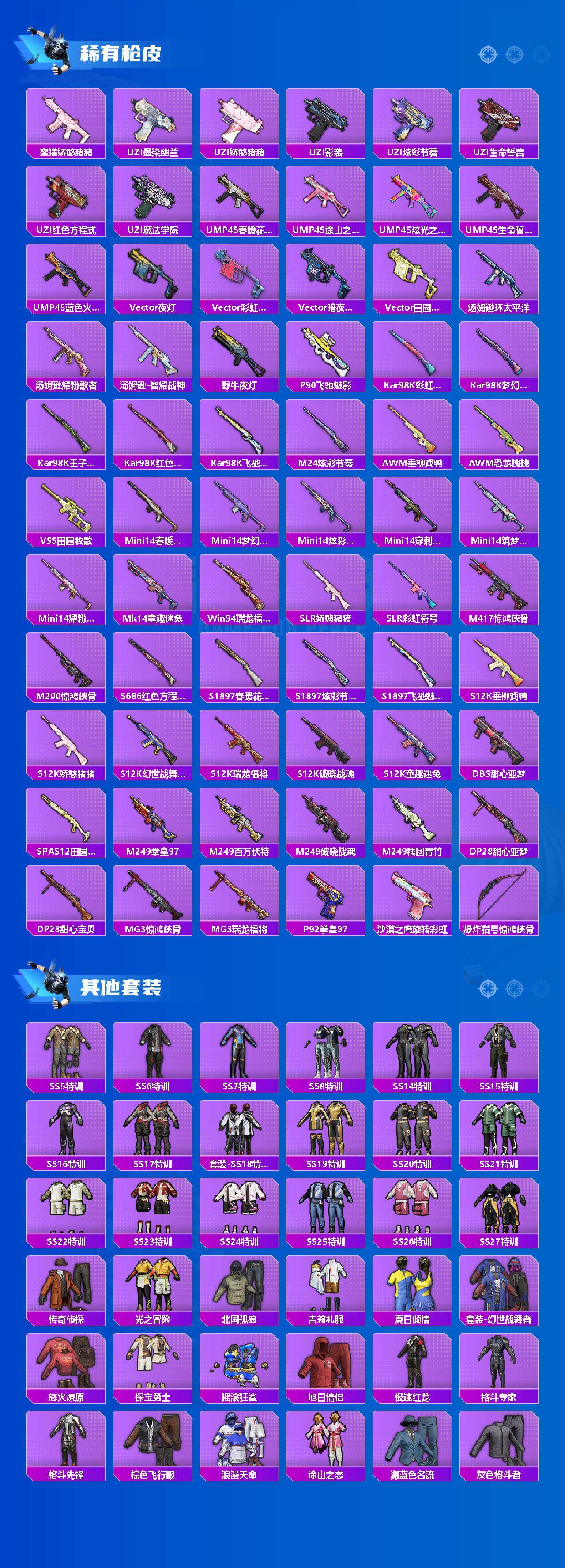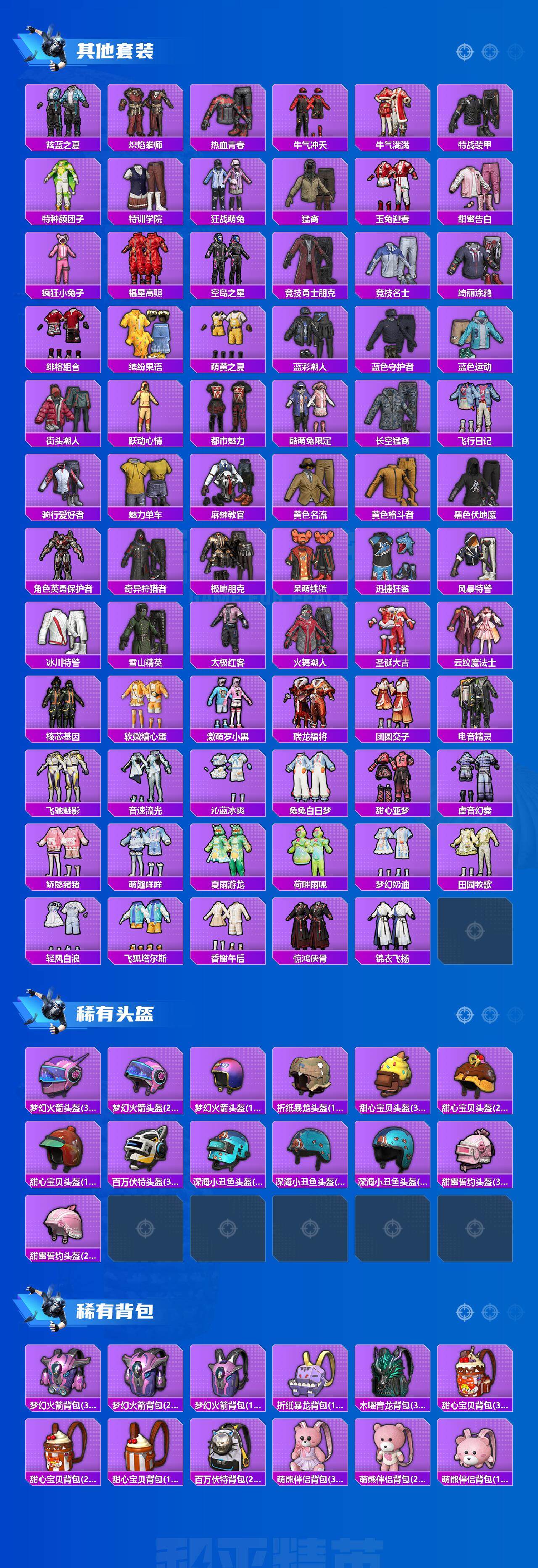 套装-梦幻火箭,套装-缤纷油彩,套装-S1赛事,套装-奇异狩猎者,套装-宝贝奶油派,套装-天使彩虹糖,套装-蝶舞迷情,套装-新星烈龙,套装-炙焰红王,岚岚物语套装,角色-复仇流浪者,套装-彩虹甜喵,套装-第五大道,套装-呆萌铁蟹,套装-迅捷狂鲨,兔兔白日梦套装