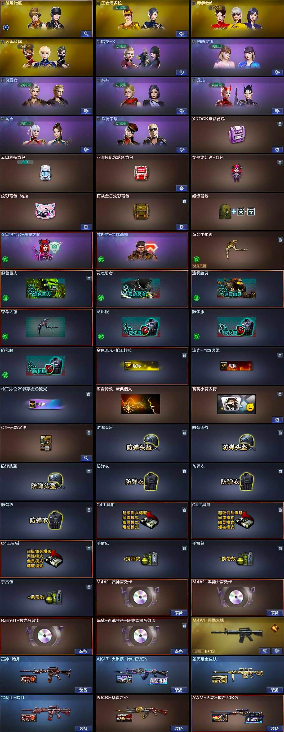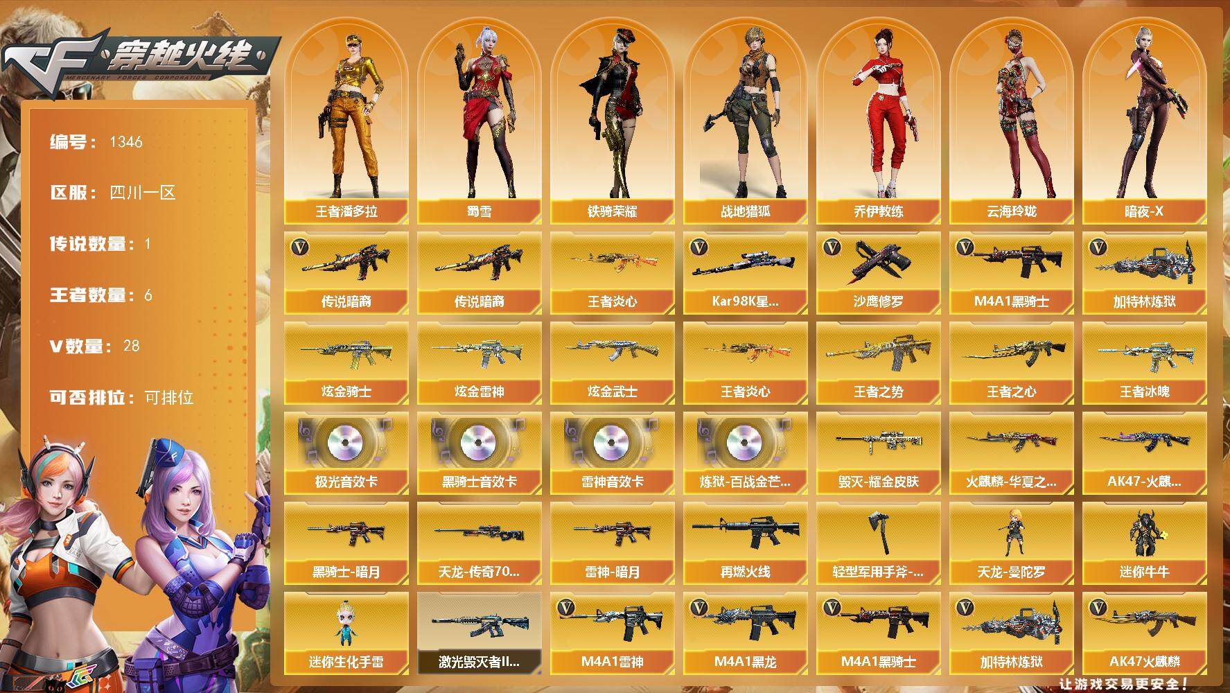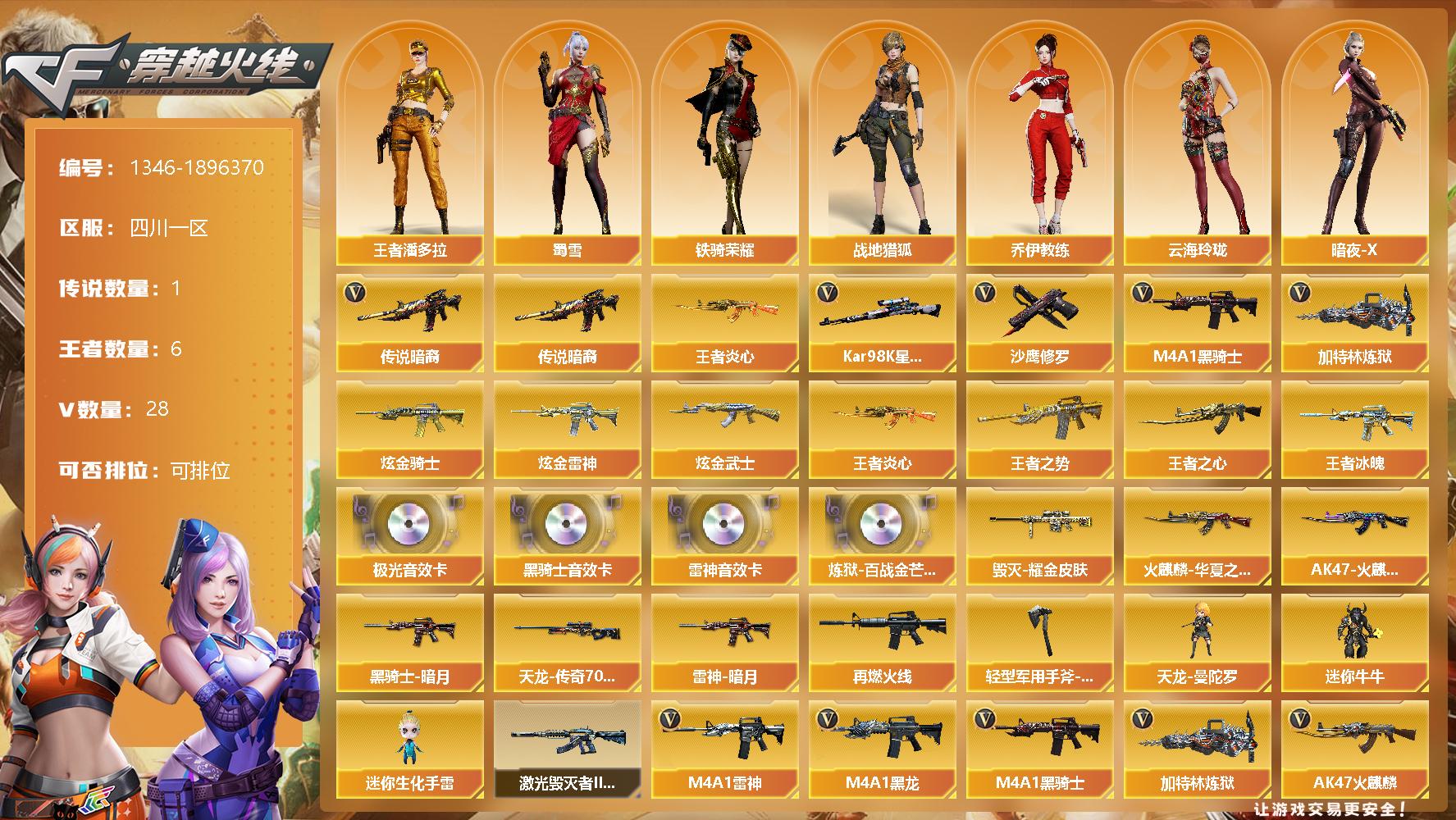 [15266597]四川一区-28V-6王者-4炫金 【传说武器】:传说暗裔 【热门武器】:传说暗裔,王者炎心,Kar98K-星神,M4A1-黑骑士,加特林-炼狱,沙鹰-修罗*6 【王者炫金武器】:王者冰魄,王者炎心,王者之势,王者之心,炫金骑士*2,炫金雷神,炫金武士 【音效卡】:M4A1-雷神音效卡,M4A1-黑骑士音效卡,Barrett-极光音效卡,炼狱-百战金芒-庆典舞曲音效卡 【皮肤】:雷神-暗月,M4