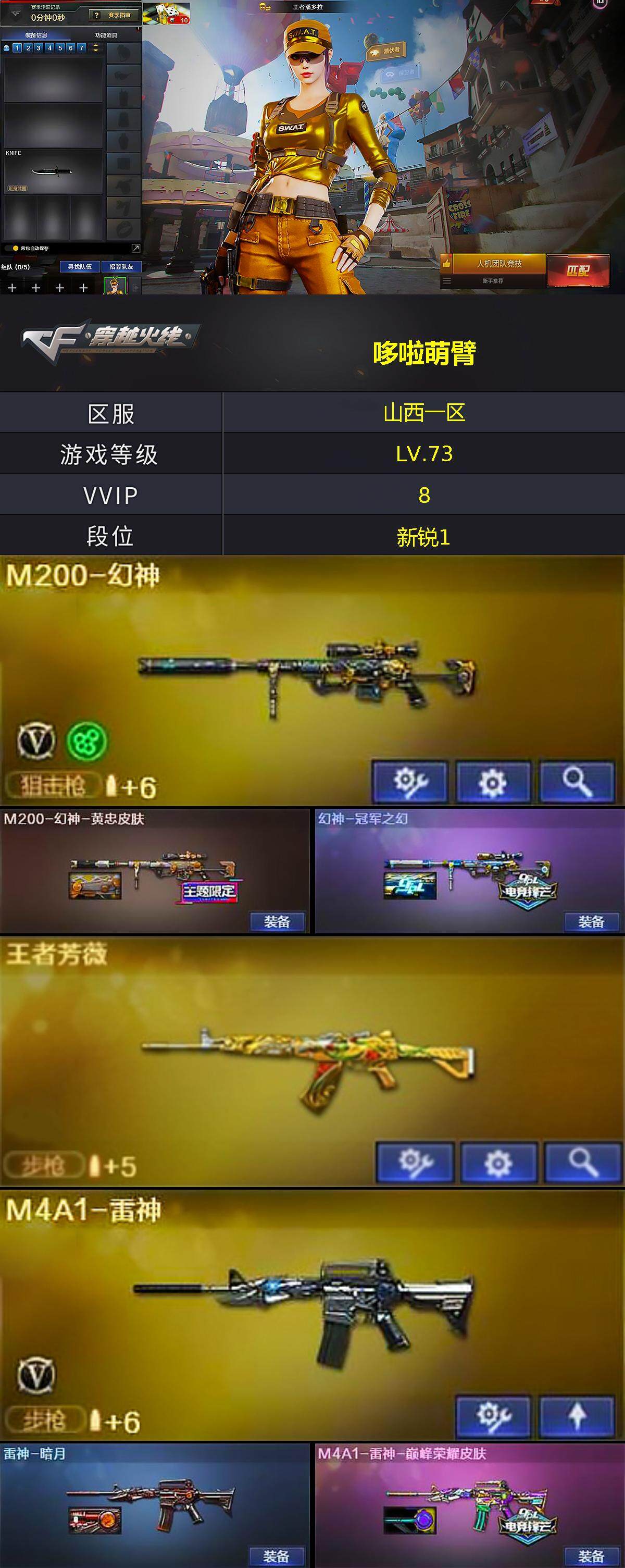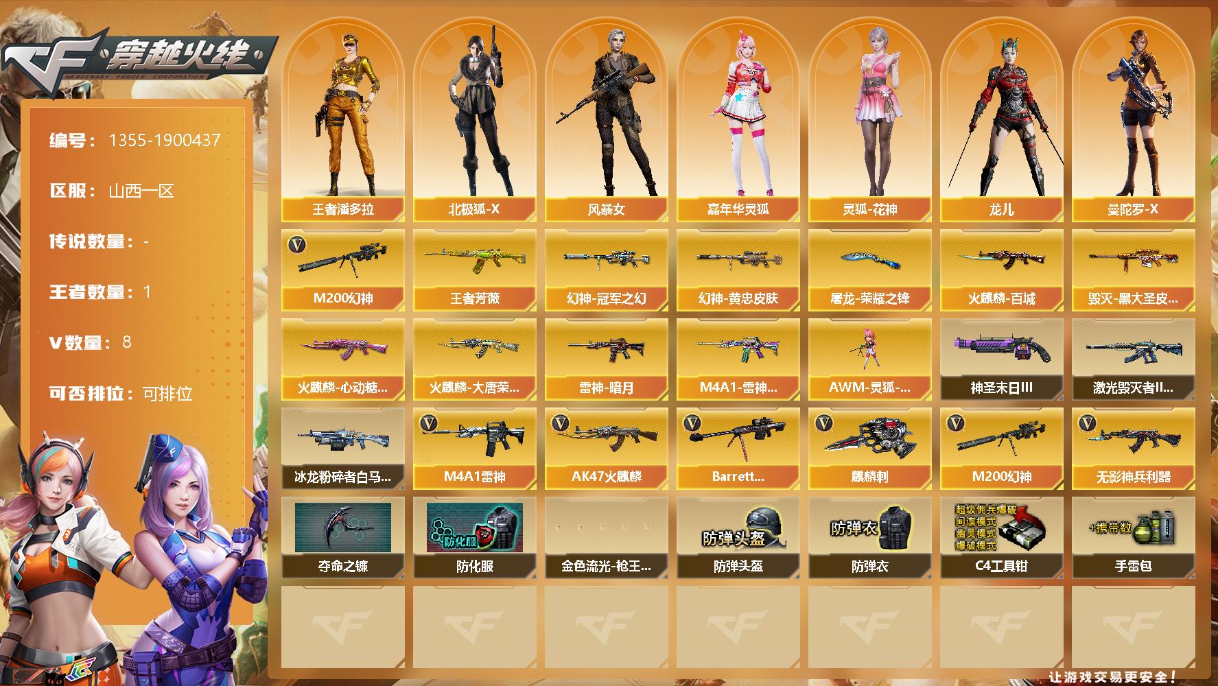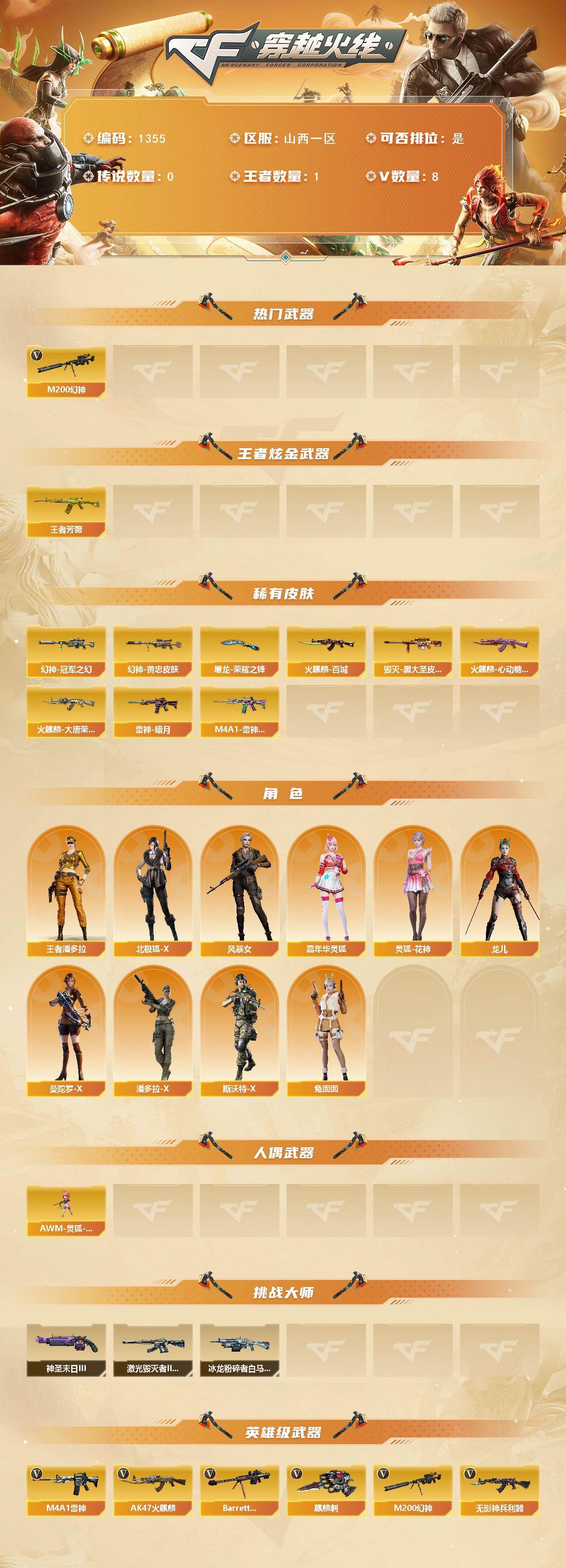 [15267960]山西一区-8V-1王者-0炫金 【热门武器】:M200-幻神 【王者炫金武器】:王者芳薇 【皮肤】:M200-幻神-黄忠皮肤,幻神-冠军之幻,雷神-暗月,M4A1-雷神-巅峰荣耀皮肤,火麒麟-百城,火麒麟-大唐荣光,火麒麟-心动糖果,毁灭-黑大圣皮肤,屠龙-荣耀之锋 【角色】:王者潘多拉,北极狐-X,风暴女,嘉年华灵狐,灵狐-花神,龙儿,曼陀罗-X,潘多拉-X,斯沃特-X,兔囡囡 【人偶武器】