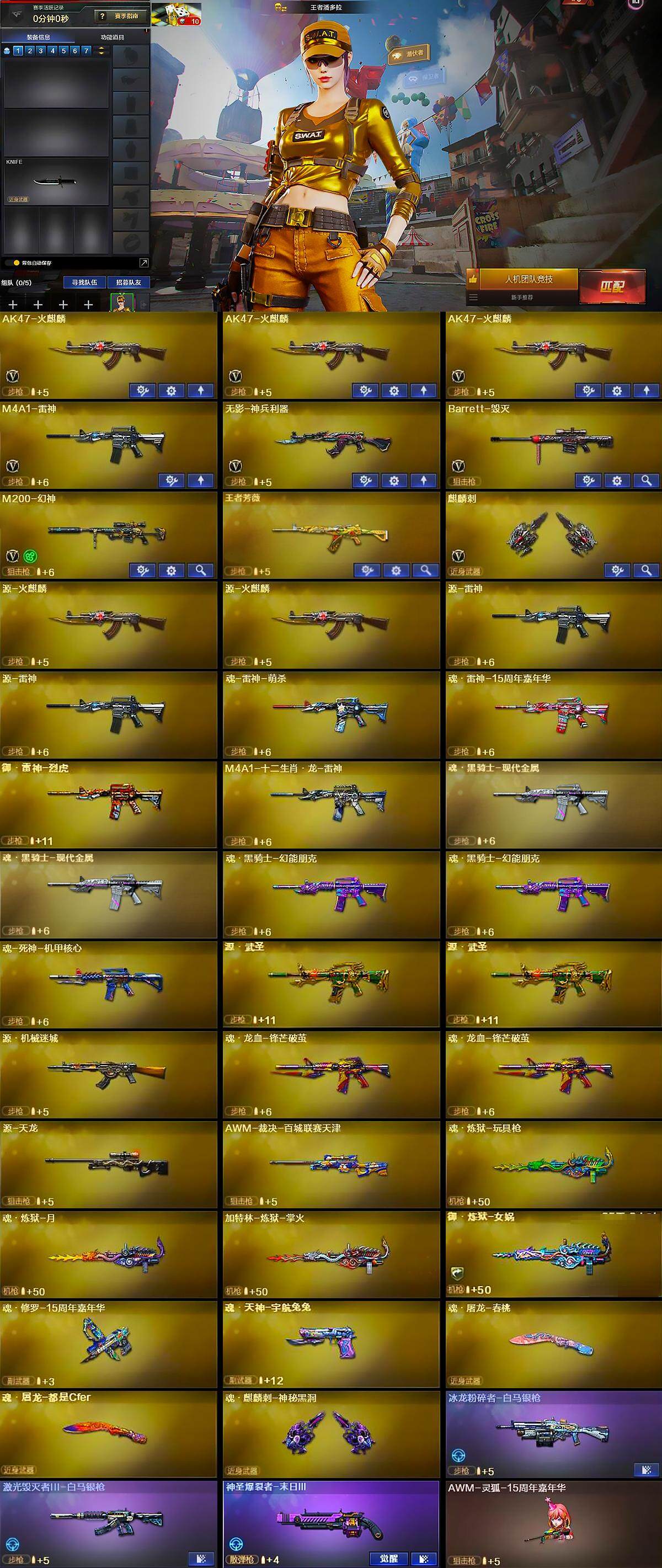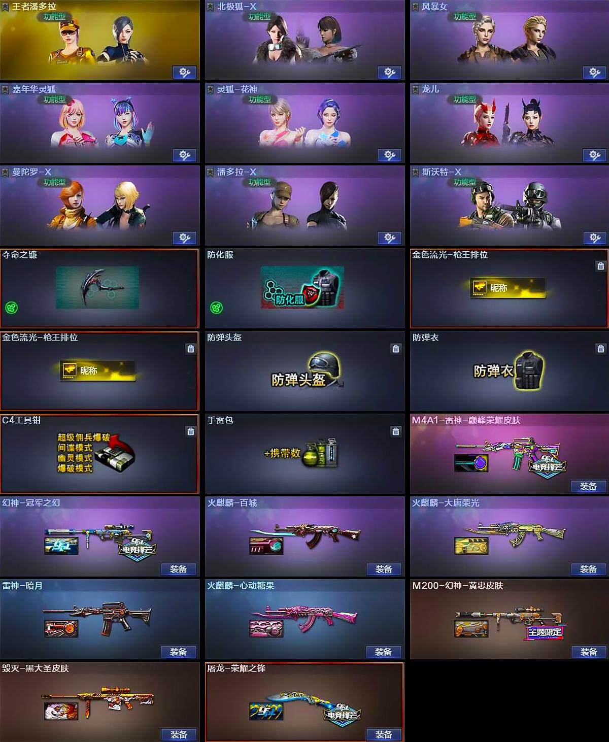 【皮肤】:M200-幻神-黄忠皮肤,幻神-冠军之幻,雷神-暗月,M4A1-雷神-巅峰荣耀皮肤,火麒麟-百城,火麒麟-大唐荣光,火麒麟-心动糖果,毁灭-黑大圣皮肤,屠龙-荣耀之锋