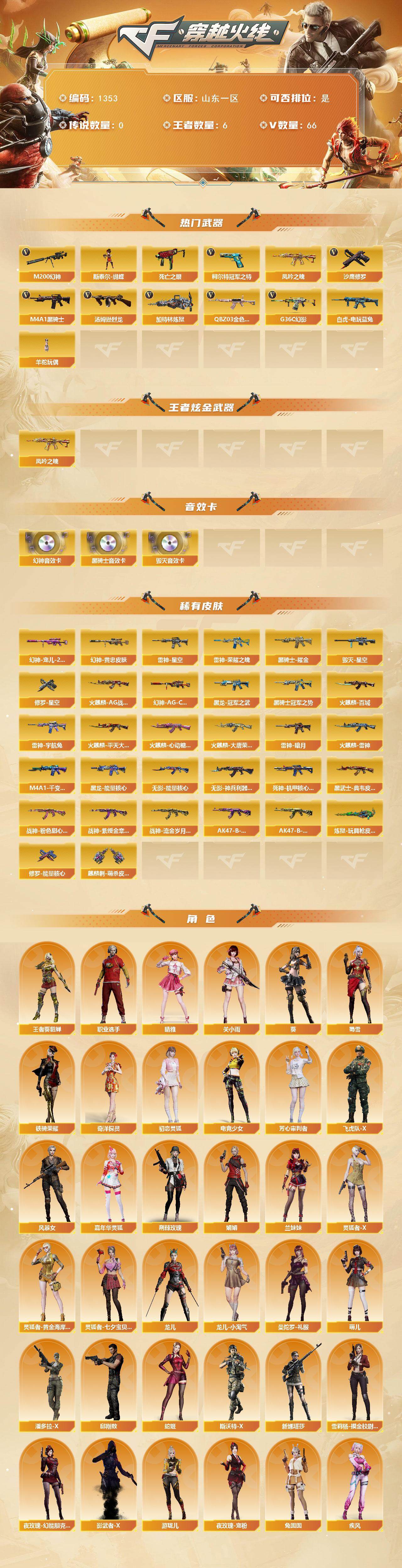 [15268152]山东一区-66V-6王者-0炫金 【热门武器】:G36C-幻影,QBZ03-金色蔷薇,M200-幻神,死亡之眼,凤吟之魄,白虎-电玩蓝兔,柯尔特-冠军之特*2,M4A1-黑骑士,汤姆逊-烈龙*5,加特林-炼狱,斯泰尔-蝴蝶,羊驼玩偶,沙鹰-修罗*3 【王者炫金武器】:凤吟之魄 【音效卡】:M200-幻神音效卡,M4A1-黑骑士音效卡,Barrett-毁灭音效卡 【皮肤】:M200-幻神-黄忠皮