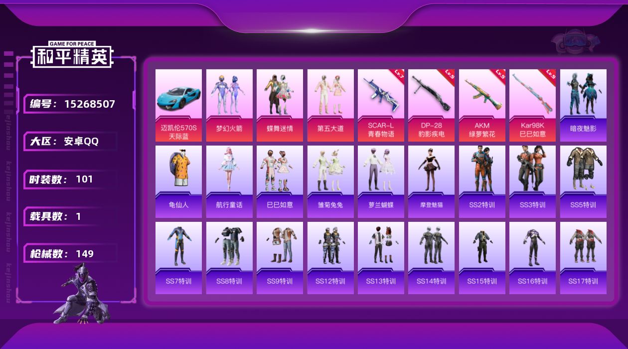 [15268507]安卓 手Q-3粉装-4特效枪-1载具-1粉色飞行器-49249热力值-7王牌印记-101套装-149枪皮【热门品类】:粉装-梦幻火箭,套装-龟仙人【粉色套装】:粉装-蝶舞迷情,粉装-梦幻火箭,粉装-第五大道【粉色枪皮等级】:AKM-绿萝繁花(五级),SCAR-L-青春物语(七级),Kar98K-巳巳如意(五级),DP-28-豹影疾电(五级)【粉色载具】:迈凯伦570S(天际蓝)【粉色枪皮】:AKM-绿萝繁花,SCAR-L-青春物语,Kar98K-巳巳如意,DP-28-豹影疾电