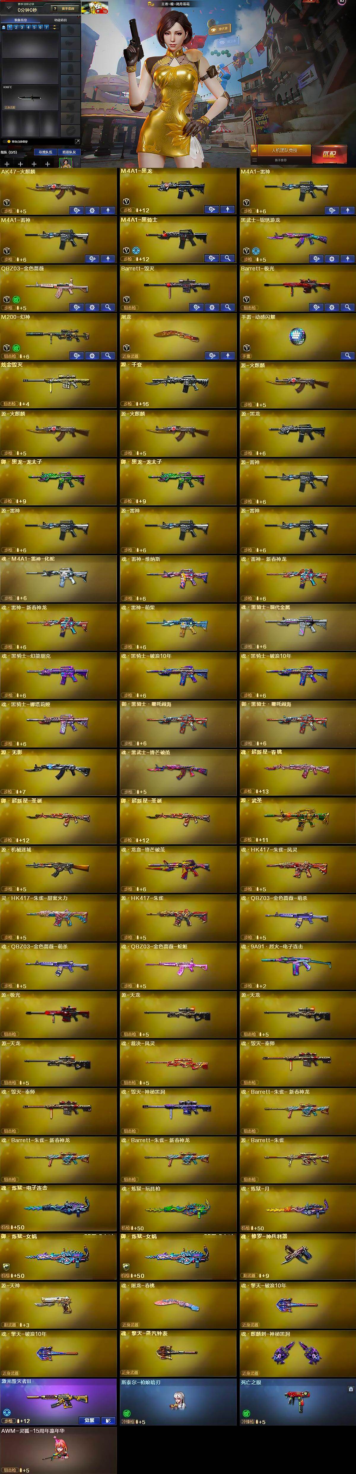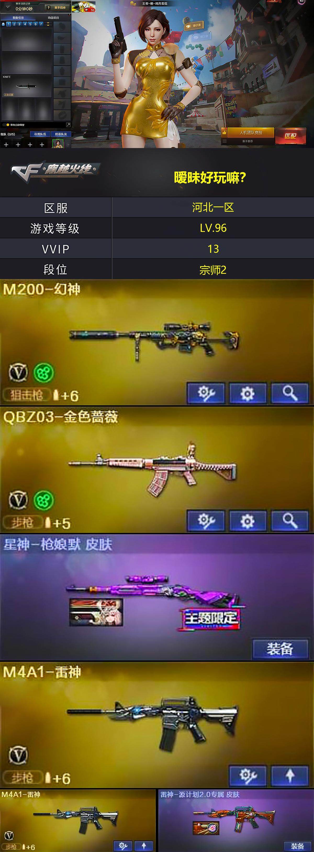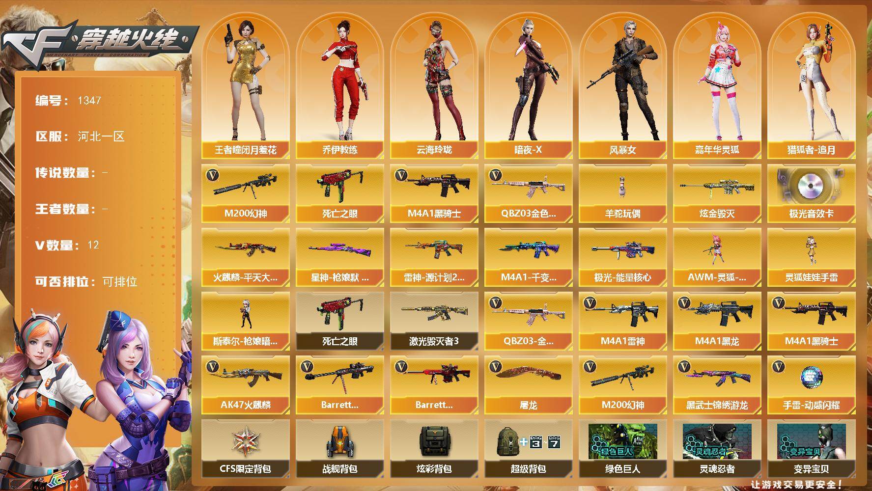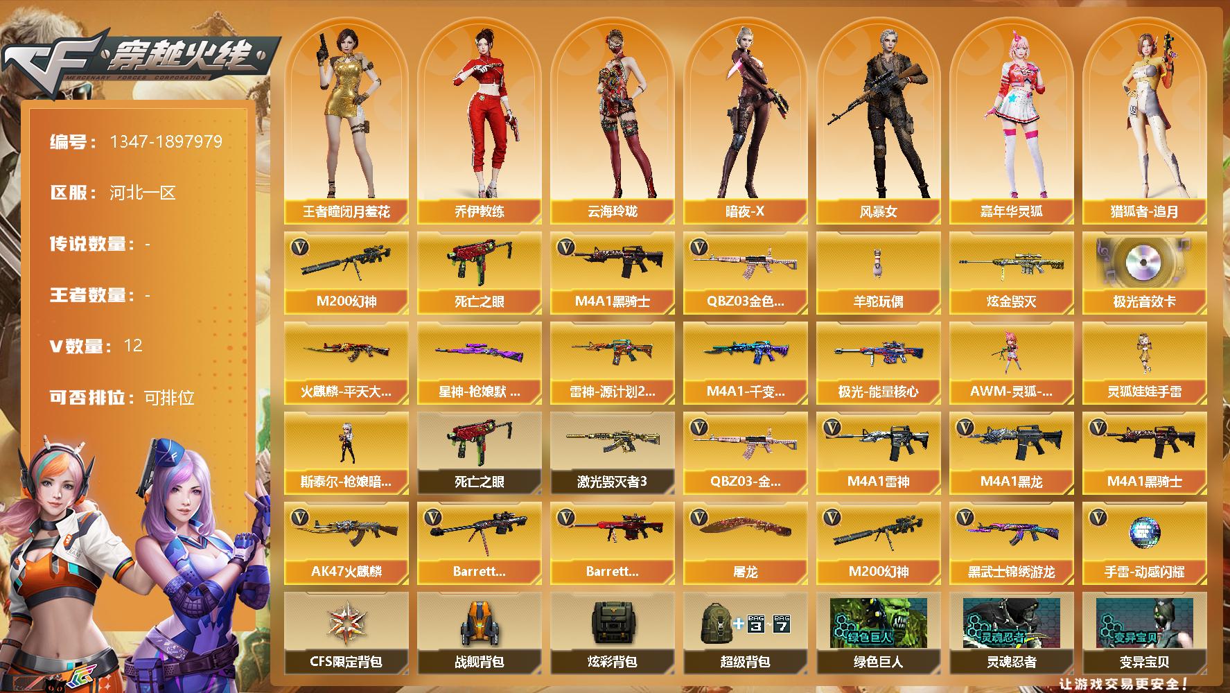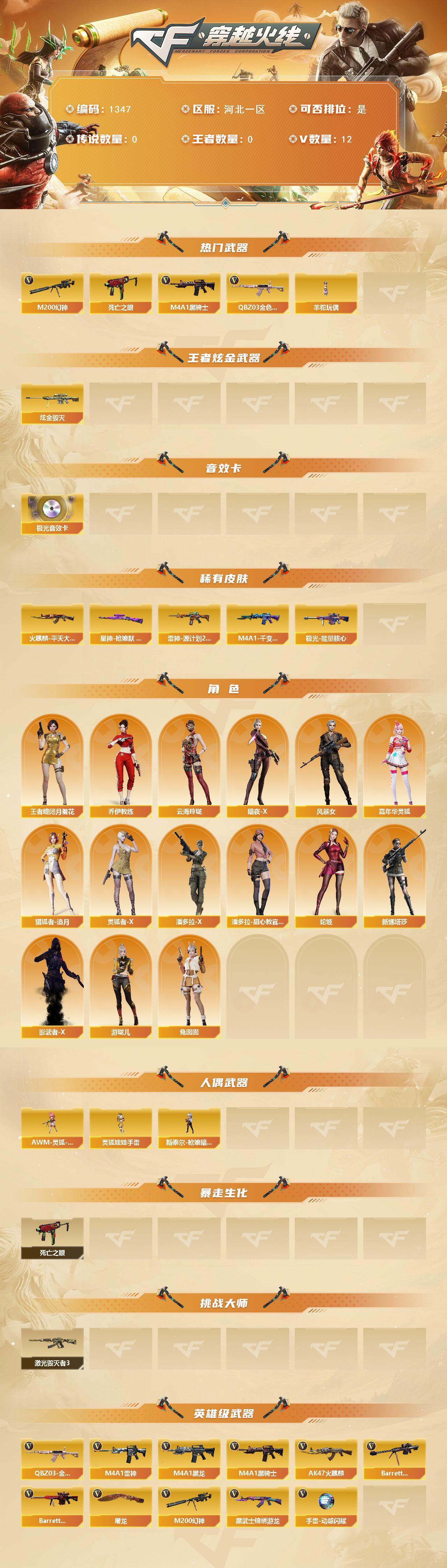 [15269884]河北一区-12V-0王者-1炫金 【热门武器】:QBZ03-金色蔷薇,M200-幻神,死亡之眼,M4A1-黑骑士,羊驼玩偶 【王者炫金武器】:炫金毁灭 【音效卡】:Barrett-极光音效卡 【皮肤】:星神-枪娘默 皮肤,雷神-源计划2.0专属 皮肤,火麒麟-平天大圣,M4A1-千变-孔明皮肤,极光-能量核心 【角色】:王者-瞳-闭月羞花,乔伊教练,云海玲珑,暗夜-X,风暴女,嘉年华灵狐,猎狐