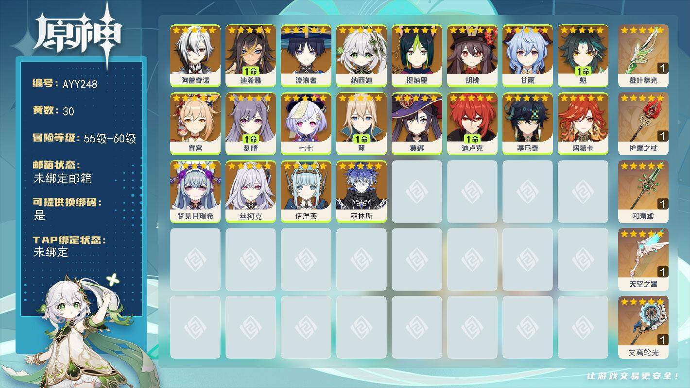 [15271906]57级/30黄/男主/20个五星角色/5个五星武器 0命阿蕾奇诺,1命迪希雅,0命流浪者,0命纳西妲,0命提纳里,0命胡桃,0命甘雨,1命魈,0命宵宫,1命刻晴,0命七七,1命琴,0命莫娜,1命迪卢克,0命基尼奇,0命玛薇卡,0命梦见月瑞希,0命丝柯克,0命伊涅芙,0命菲林斯,精1裁叶萃光,精1护摩之杖,精1和璞鸢,精1天空之翼,精1支离轮光