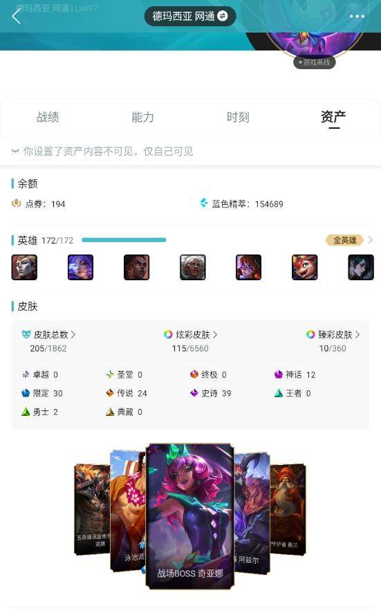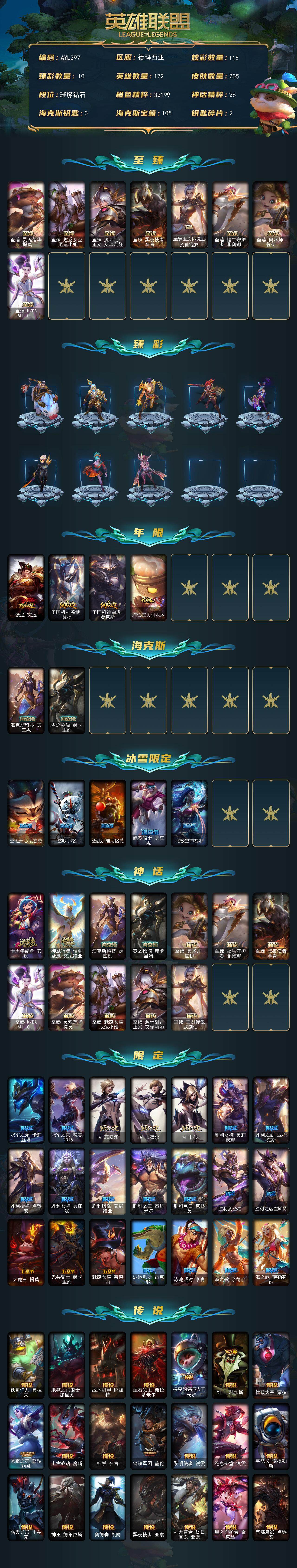 钻石段位-172英雄-205皮肤-115炫彩-0终极-12神话-30限定-24传说-39史诗