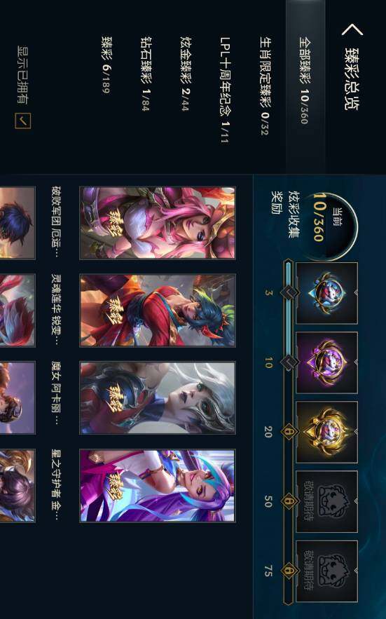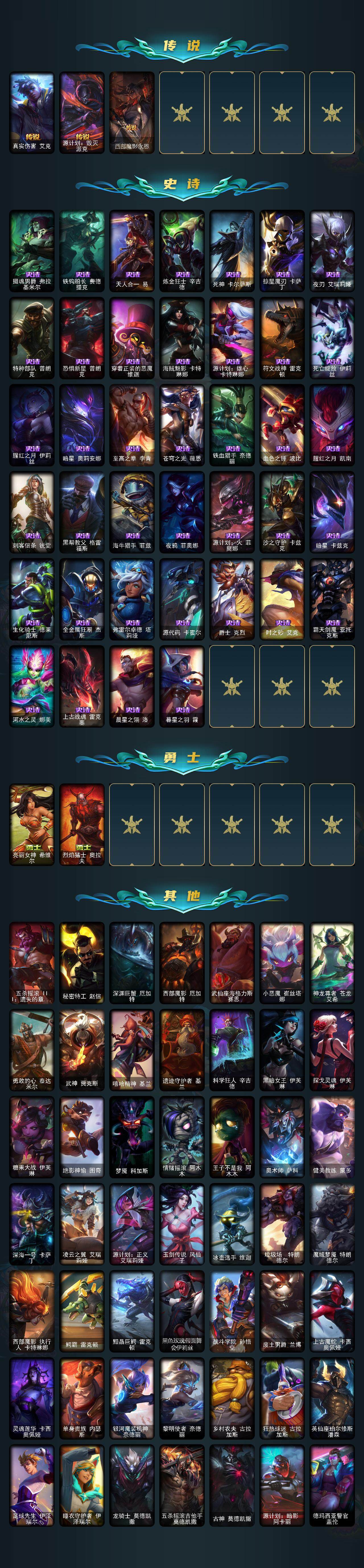 【臻彩皮肤】:无畏骑士瑟庄妮赤子初心,冠军之志瑞兹凯旋圣装,冠军之刃锐雯2016凯旋圣装,神龙尊者圣龙李青龙腾云起,黎明使者锐雯黑夜使者,星之守护者金克丝黑洞,源计划火菲奥娜惩戒,灵魂莲华锐雯流火,破败军团厄运小姐灵岛征伐使,魔女阿卡丽虚荣