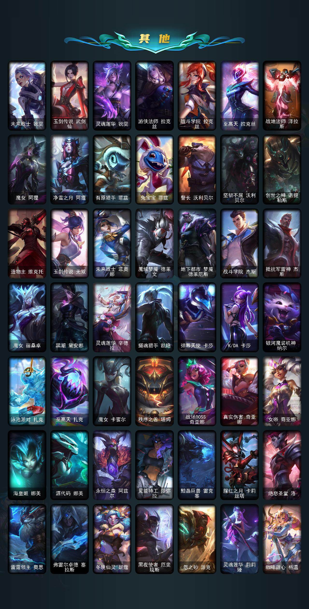 【神话皮肤】:十周年纪念安妮,神凰行者瑞羽圣凰艾尼维亚,海克斯科技瑟庄妮,零之枪骑赫卡里姆,至臻奥术师佐伊,至臻福牛守护者菲奥娜,至臻黑夜使者李青,至臻KDAALLOUT卡莎,至臻灵魂莲华提莫,至臻魅惑女巫厄运小姐,至臻源计划正义艾瑞莉娅,至臻玉剑传说武剑仙