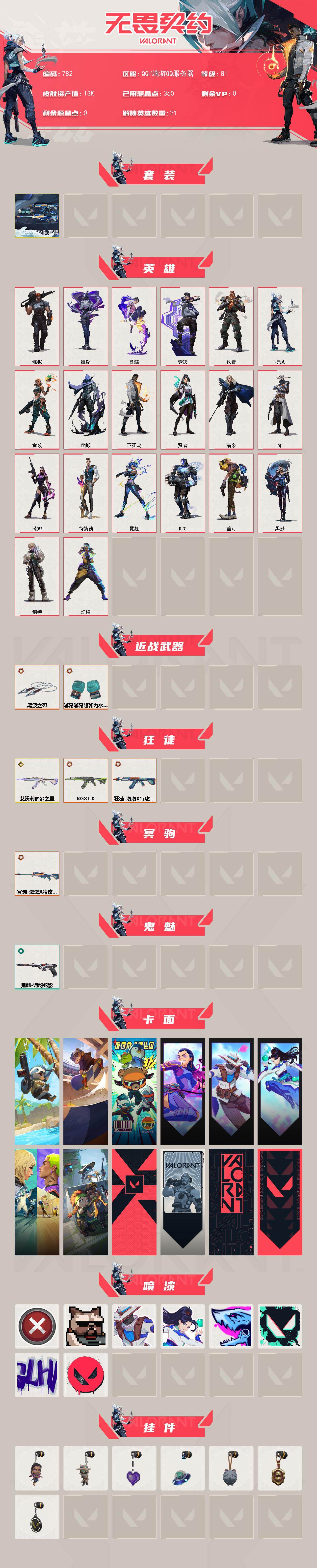 - [12960064]【英雄】:炼狱,暮蝶,钛狐,铁臂,捷风,不死鸟,贤者,猎枭,蝰蛇,零,芮娜,星礈,盖可 【幻影】:幻影-离子武器 【卡面】:南瓜盛典 卡面,梦幻奶茶 卡面,代号红色 卡面,新兵报到 卡面,V契约 卡面,无畏契约 卡面 【喷漆】:胜利属于无畏契约 喷漆,GLHF 喷漆,无畏契约 喷漆 【挂饰】:第九季//第三幕 纪念币 挂饰,第九季//第一幕 纪念币 挂饰,无畏契约 纪念币 挂饰