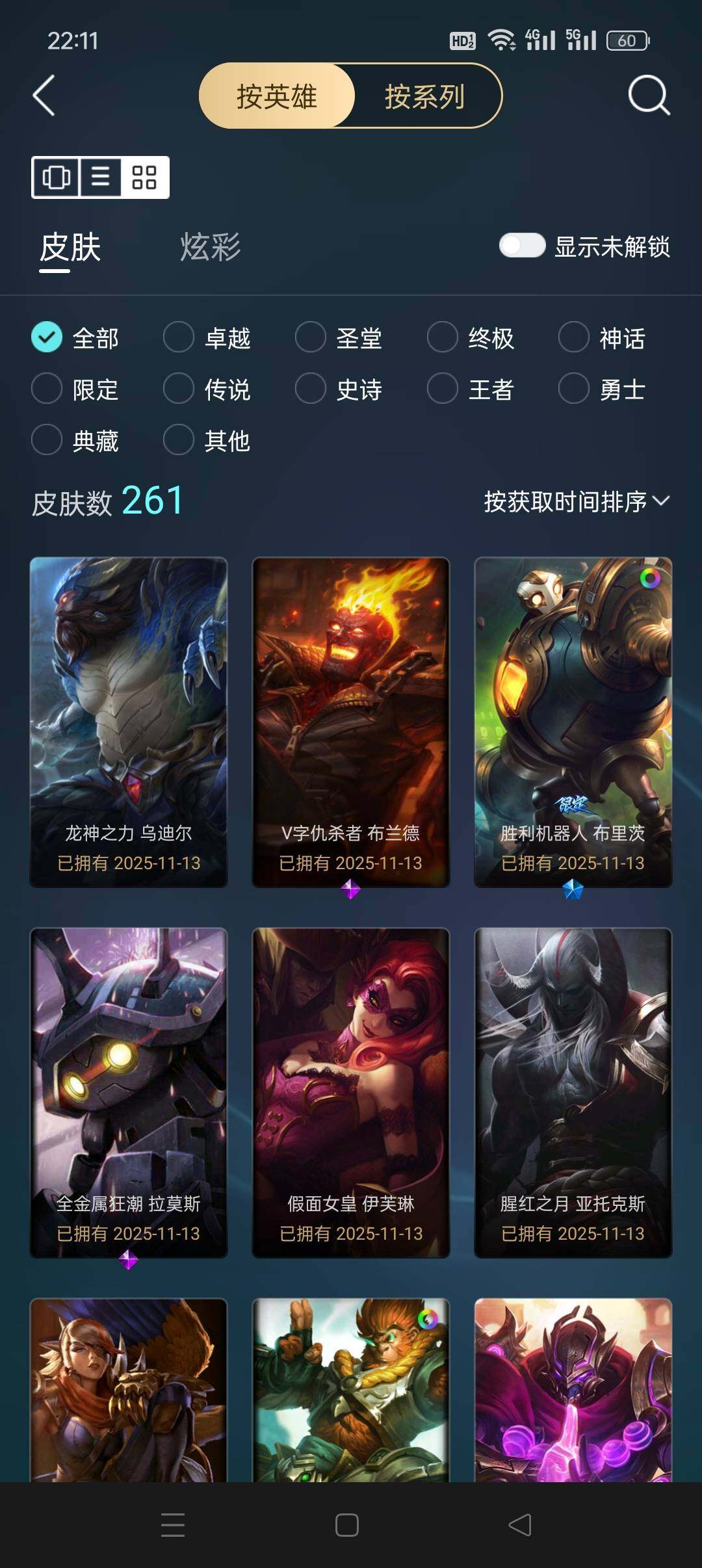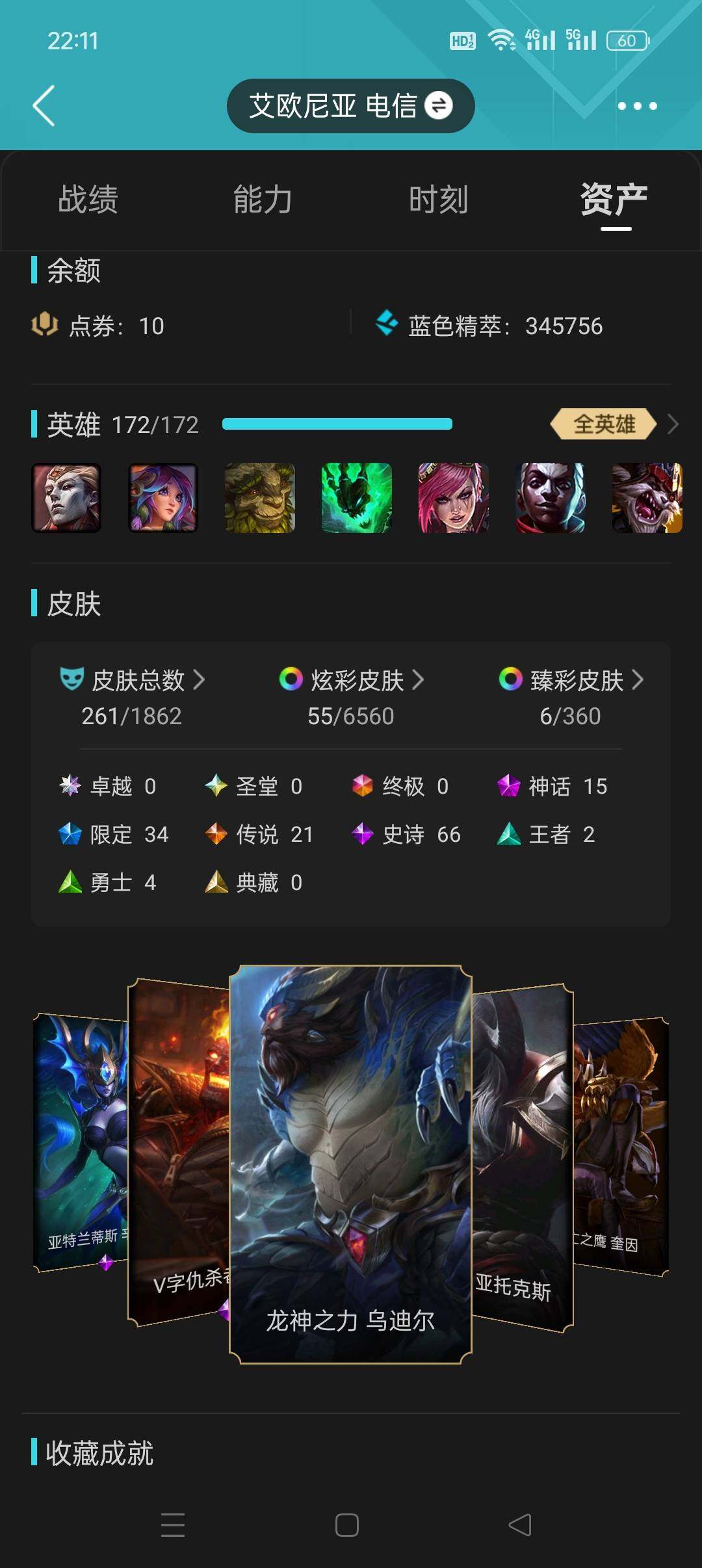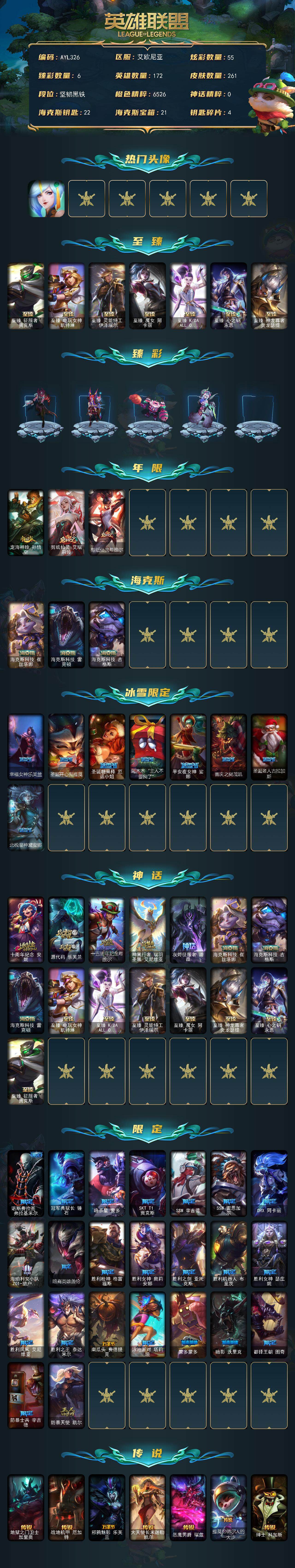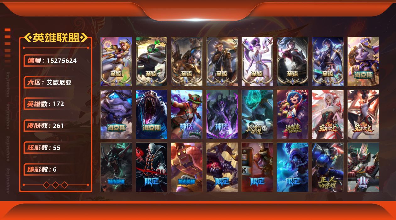 [15275624]【店主推荐捡漏号】未定级段位-172英雄-261皮肤-55炫彩-0终极-15神话-34限定-21传说-66史诗
