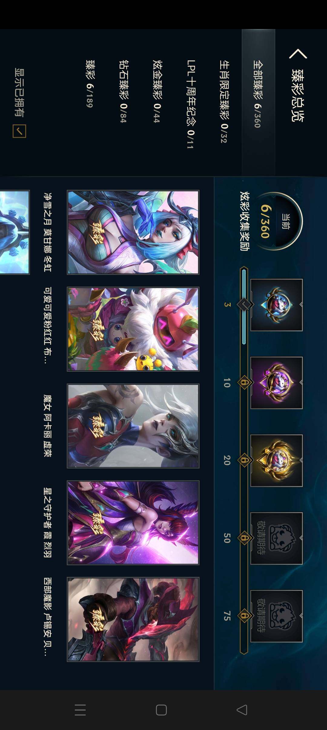 【臻彩皮肤】:西部魔影卢锡安贝利尔之怠,星之守护者霞烈羽,可爱可爱粉红红布里茨,魔女阿卡丽虚荣,净雪之月莫甘娜冬虹,幽梦玫瑰辛德拉纯洁花蕾