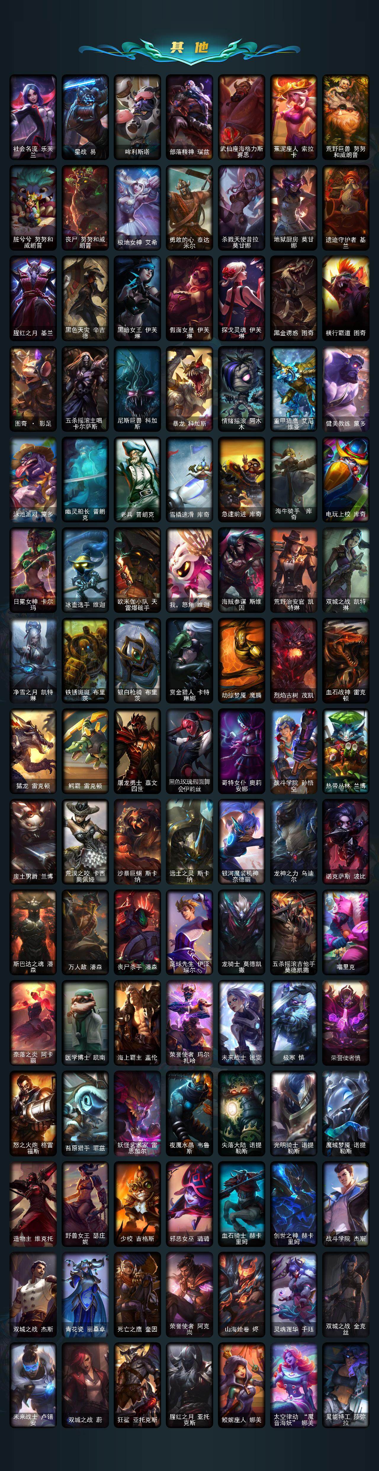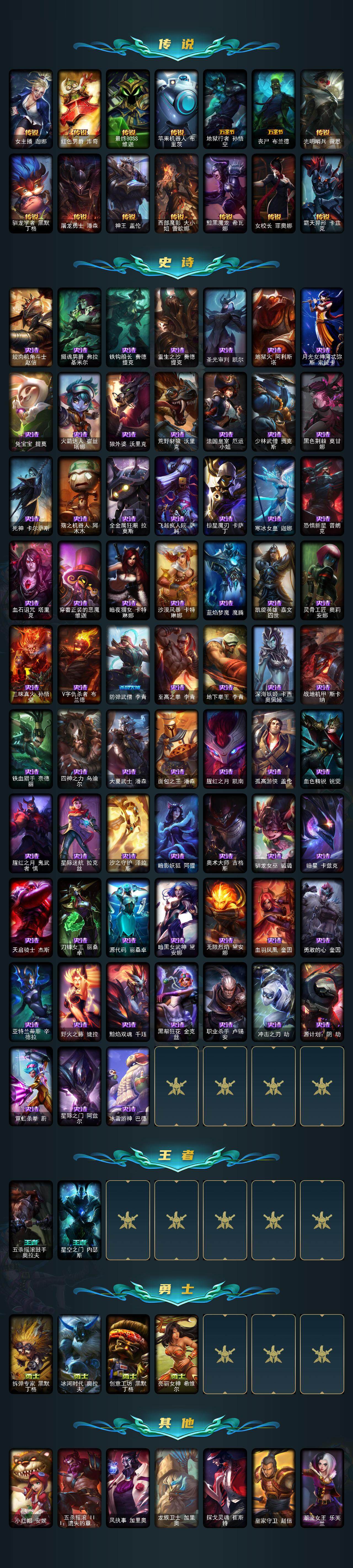 【传说皮肤】:地狱之门卫士加里奥,战地机甲厄加特,邪鸦魅影乐芙兰,大天使长米迦勒凯尔,恶魔男爵瑞兹,提莫约德尔人的一大步,绅士科加斯,女主播迦娜,红色男爵库奇,最终BOSS维迦,苹果机器人布里茨,地狱行者孙悟空,丧尸布兰德,光明哨兵薇恩,驯龙学者黑默丁格,屠龙勇士潘森,神王盖伦,西部魔影大小姐蕾欧娜,黯黑魔龙希瓦娜,女校长菲奥娜,霸天异形卡兹克