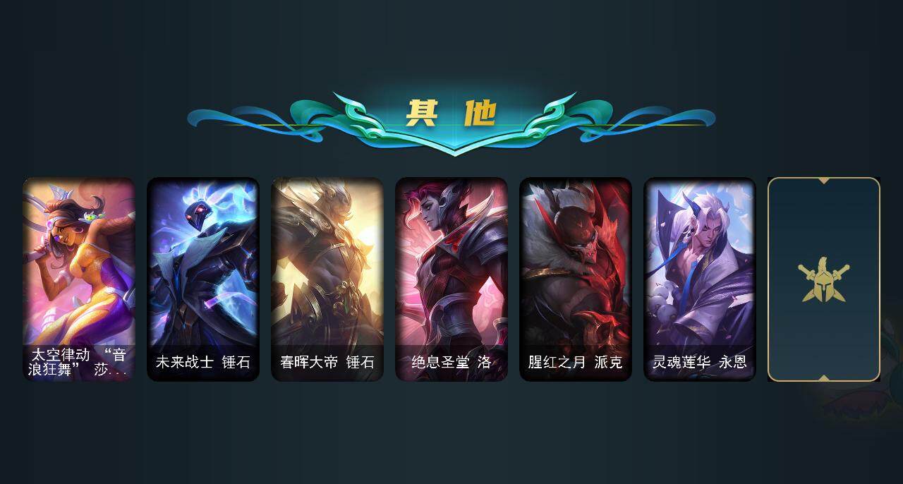 【限定皮肤】:诺斯费拉图弗拉基米尔,冠军典狱长锤石,暗杀星蒙多,SKTT1贾克斯,SSW辛吉德,SSW雷恩加尔,DRX阿卡丽,海珀利安小队Z01猎户座卢锡安,暗裔英雄盖伦,胜利枪神格雷福斯,胜利女神奥莉安娜,胜利之剑亚托克斯,胜利机器人布里茨,胜利女神瑟庄妮,胜利凤凰艾尼维亚,胜利之王泰达米尔,南瓜头费德提克,泳池派对塔莉垭,蒙多蒙多,暗影沃里克,都铎王朝图奇,防暴士兵辛吉德,防暴天使凯尔