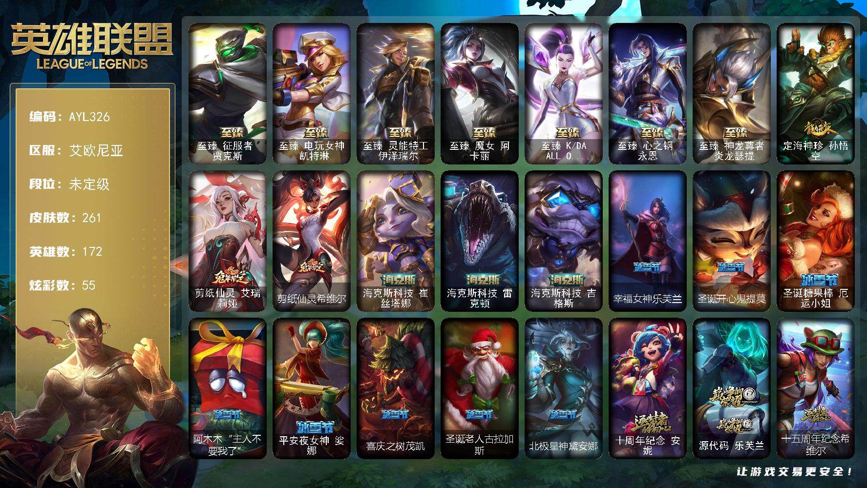 [15275624]【店主推荐捡漏号】未定级段位-172英雄-261皮肤-55炫彩-0终极-15神话-34限定-21传说-66史诗 【热门头像】:春晖神女头像 【至臻皮肤】:至臻征服者贾克斯,至臻电玩女神凯特琳,至臻灵能特工伊泽瑞尔,至臻魔女阿卡丽,至臻KDAALLOUT卡莎,至臻心之钢永恩,至臻神龙尊者炎龙瑟提 【臻彩皮肤】:西部魔影卢锡安贝利尔之怠,星之守护者霞烈羽,可爱可爱粉红红布里茨,魔女阿卡丽虚荣,净雪之月莫甘娜冬虹,幽梦玫瑰辛德拉纯洁花蕾 【年限皮肤】:定海神珍孙悟空,剪纸仙灵艾瑞莉娅,剪纸仙灵希维尔 【海克斯皮肤】:海克斯科技崔丝塔娜,海克斯科技雷克顿,海克斯科技吉格斯 【冰雪限定】:幸福女神乐芙兰,圣诞开心鬼提莫,圣诞糖果棒厄运小姐,阿木木“主人不要我了”,平安夜女神娑娜,喜庆之树茂凯,圣诞老人古拉加斯,北极星神黛安娜 【神话皮肤】:十周年纪念安妮,源代码乐芙兰,十五周年纪念希维尔,神凰行者瑞羽圣凰艾尼维亚,灰烬征服者潘森,海克斯科技崔丝塔娜,海克斯科技吉格斯,海克斯科技雷克顿,至臻征服者贾克斯,至臻电玩女神凯特琳,至臻KDAALLOUT卡莎,至臻灵能特工伊泽瑞尔,至臻魔女阿卡丽,至臻神龙尊者炎龙瑟提,至臻心之钢永恩 【限定皮肤】:诺斯费拉图弗拉基米尔,冠军典狱长锤石,暗杀星蒙多,SKTT1贾克斯,SSW辛吉德,SSW雷恩加尔,DRX阿卡丽,海珀利安小队Z01猎户座卢锡安,暗裔英雄盖伦,胜利枪神格雷福斯,胜利女神奥莉安娜,胜利之剑亚托克斯,胜利机器人布里茨,胜利女神瑟庄妮,胜利凤凰艾尼维亚,胜利之王泰达米尔,南瓜头费德提克,泳池派对塔莉垭,蒙多蒙多,暗影沃里克,都铎王朝图奇,防暴士兵辛吉德,防暴天使凯尔 【传说皮肤】:地狱之门卫士加里奥,战地机甲厄加特,邪鸦魅影乐芙兰,大天使长米迦勒凯尔,恶魔男爵瑞兹,提莫约德尔人的一大步,绅士科加斯,女主播迦娜,红色男爵库奇,最终BOSS维迦,苹果机器人布里茨,地狱行者孙悟空,丧尸布兰德,光明哨兵薇恩,驯龙学者黑默丁格,屠龙勇士潘森,神王盖伦,西部魔影大小姐蕾欧娜,黯黑魔龙希瓦娜,女校长菲奥娜,霸天异形卡兹克 【史诗皮肤】:绞肉机角斗士赵信,摄魂男爵弗拉基米尔,铁钩船长费德提克,重生之沙费德提克,圣光审判凯尔,地狱火阿利斯塔,月光女神阿忒弥斯索拉卡,兔宝宝提莫,火箭达人崔丝塔娜,狼外婆沃里克,荒野豺狼沃里克,法国皇室厄运小姐,少林武