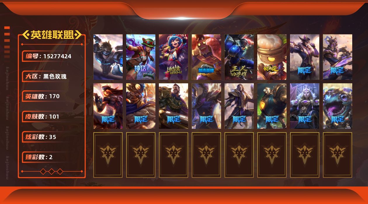 铂金段位-170英雄-101皮肤-35炫彩-1终极-3神话-13限定-6传说-30史诗