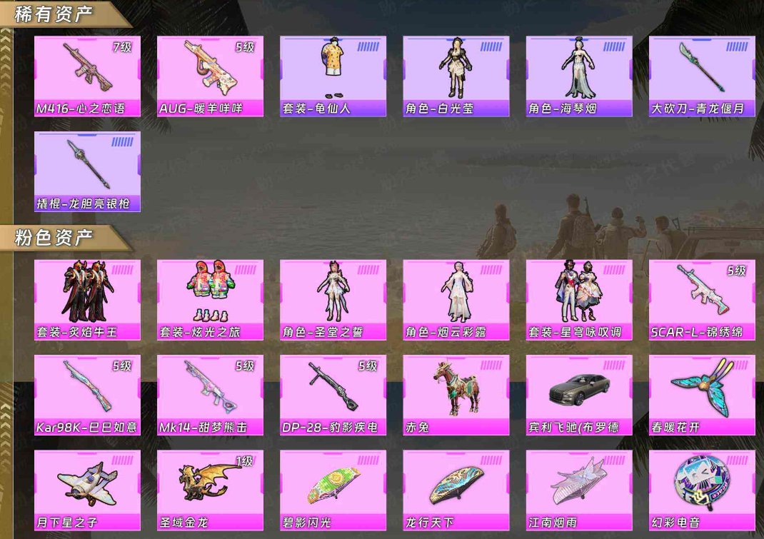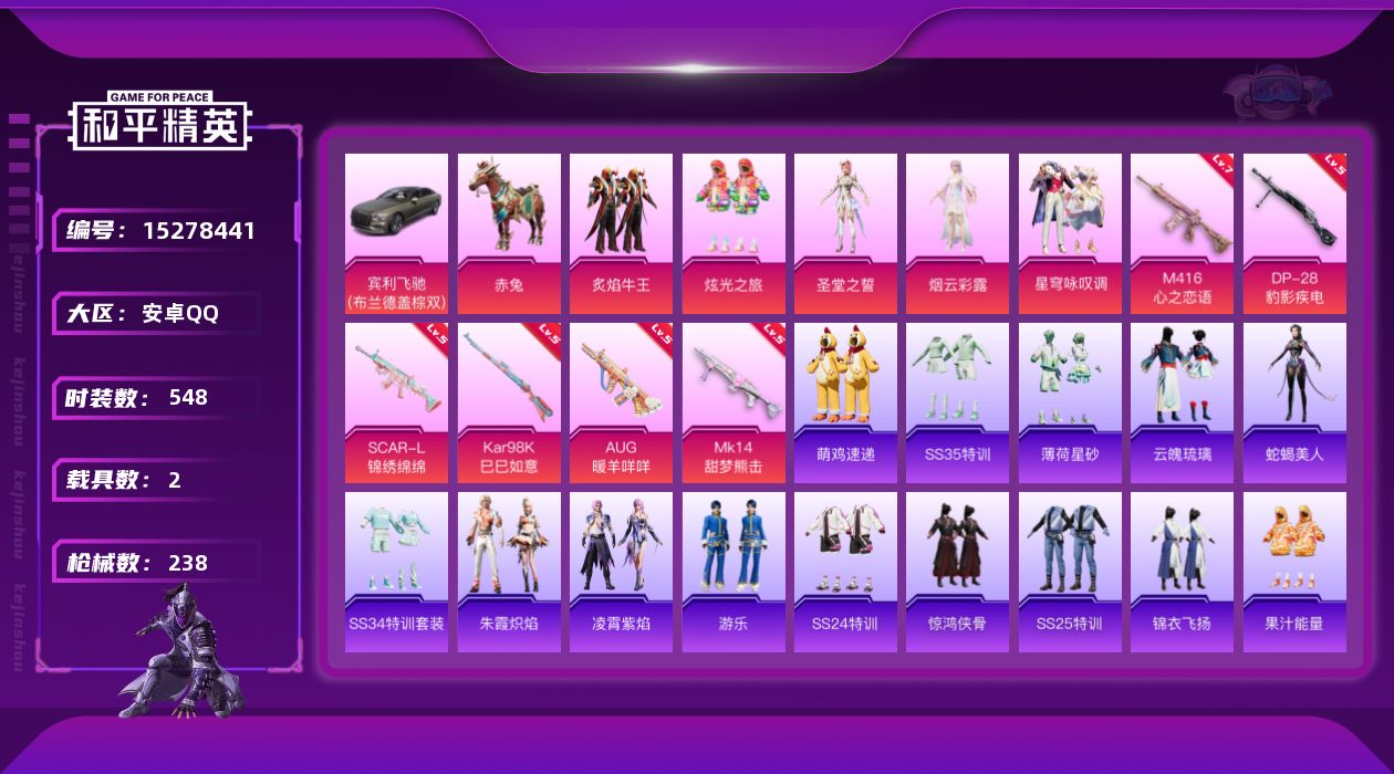 - [15110786]素材身法号 安卓 手Q-31粉装-10特效枪-4载具-4粉色飞行器-9.9w热力值-14王牌印记-202套装-213枪皮【热门品类】:粉装-雪国幻梦,粉装-梦幻火箭,粉装-童趣迷兔,套装-浪漫天命,套装-深海小丑鱼,套装-小丑鱼,套装-奇异狩猎者,角色-军刀雅典娜,套装-龟仙人,套装-暗影哥特,套装-浪漫波比,套装-粉红小猪【粉色载具】:路特斯EVIJA(星际黄),路特斯ELETRE(冰川蓝),玛莎拉蒂Ghibli(蓝),合金龙骨(绿)【粉色套装】:粉装-雪国幻梦,粉装-梦幻火箭,粉装-冰霜白皇,粉装-童趣迷兔,粉装-炙焰红王,粉装-香水柠檬,粉装-飓风飞鹰,粉装-蜜桃特工,粉装-蝶舞蔷薇,角色-洛天依,粉装-海渊国主,角色-2号机款机体服,粉装-青葱仙萝,粉装-幻梦音符,粉装-绚丽摇曳,粉装-闪耀律动,粉装-冷魅冰骑,粉装-赤焰黑爵,粉装-紫电风暴,粉装-筑梦精灵,粉装-炙焰牛王,粉装-圣光天使,角色-复仇流浪者,粉装-绒雪飘舞,粉装-傲雪凌霜,粉装-霁雪冰心,粉装-彩虹甜喵,粉装-霞光圣骑,粉装-寒光使者,角色-烟云彩露,角色-奇迹舞步 美琪【粉色枪皮等级】:AKM-梦之光华(七级),SCAR-L-童趣迷兔(七级),SCAR-L-青春物语(五级),M416-五爪金龙(七级),UZI-筑梦精灵(七级),UMP45-雪国精灵(七级),Vector-环太平洋(七级),Kar98K-巳巳如意(五级),SLR-暗夜玫瑰(四级),DP-28-豹影疾电(四级)【粉色飞行器】:梦幻火箭飞行器,幻梦音符飞行器,冷魅冰骑飞行器,星夜魔法师飞行翼