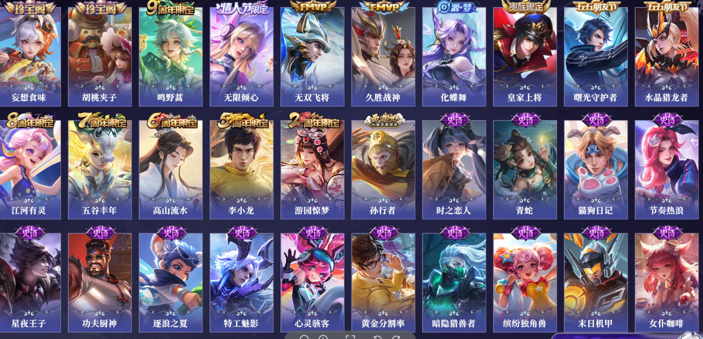 - [11553612]V9 1典藏 6传说 123英雄 245皮肤 可修改实名 女号 优质装备:星域神启(倪克斯贼亮),猫影幻舞,末日机甲-孙尚香(绿蚂蚱),仲夏夜之梦(大飞蛾),琥珀纪元铠 珍宝阁皮:优雅恋人,蔷薇恋人 限定皮:陌上桑,怒海麟威,降魔,五谷丰年,青龙志(铠年限),游园惊梦,梁祝,御风骁将(吕布年限),李小龙,辉光之辰,孙行者,神奇女侠,百木心枪,梦圆繁星 史诗皮:谪仙醉月,琥珀纪元伽罗,紫霞仙子,苍穹之光,电玩小子(小书包),黄金分割率,特工魅影,千年之狐,永昼,江河有灵,百解令(蒙犽),魅语,无限星赏官,晚萤,末日机甲-吕布,猫狗日记-孙策,猫狗日记-大乔,时之恋人-孙尚香,修罗,女仆咖啡,摇滚巨星,水果甜心,绅士熊喵,天才门将,心灵骇客,暗隐猎兽者,幽灵船长,鬼剑武藏,地狱岩魂,纤云弄巧,逐浪之夏,水晶猎龙者,箭羽风息,唤灵魅影,金属风暴,原初追逐者,圣诞恋歌,鹰眼统帅,王者之锤,暗夜贵公子,魅力维加斯,赏金猎手,奇遇舞章,无心