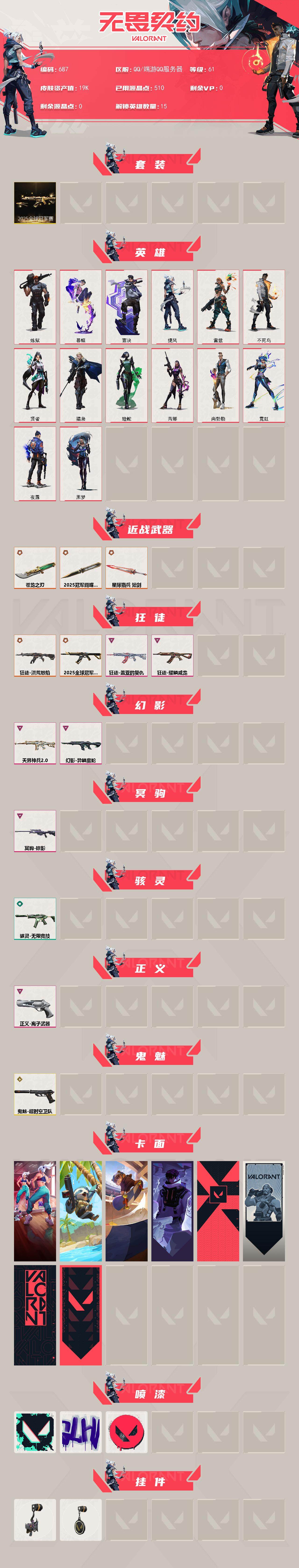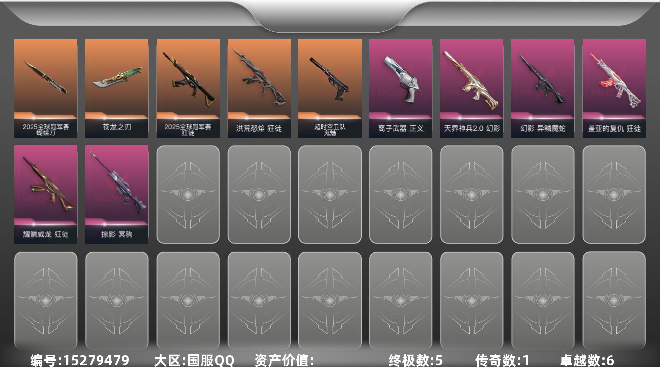 [15279479]【套装】:2025全球冠军赛套装 【英雄】:炼狱,暮蝶,壹决,捷风,雷兹,不死鸟,贤者,猎枭,蝰蛇,芮娜,尚勃勒,霓虹,夜露,黑梦 【近战武器】:近战武器-2025全球冠军赛 蝴蝶刀,近战武器-5周年//公测重制版 苍龙之刃,近战武器-星际猎兵 短剑 【狂徒】:狂徒-2025全球冠军赛,狂徒-洪荒怒焰,狂徒-盖亚的复仇,狂徒-耀鳞威龙 【幻影】:幻影-天界神兵//2.0,幻影-异鳞魔蛇 【冥驹】:冥驹-掠影 【骇灵】:骇灵-无限竞技 【正义】:正义-离子武器 【鬼魅】:鬼魅-超时空卫队 【卡面】:热舞环节 卡面,树懒大作战 卡面,Clutch 卡面,逆向独行 卡面 ,代号红色 卡面,新兵报到 卡面,V契约 卡面,无畏契约 卡面 【喷漆】:胜利属于无畏契约 喷漆,GLHF 喷漆,无畏契约 喷漆 【挂饰】:鱼骨头 挂饰,无畏契约 纪念币 挂饰