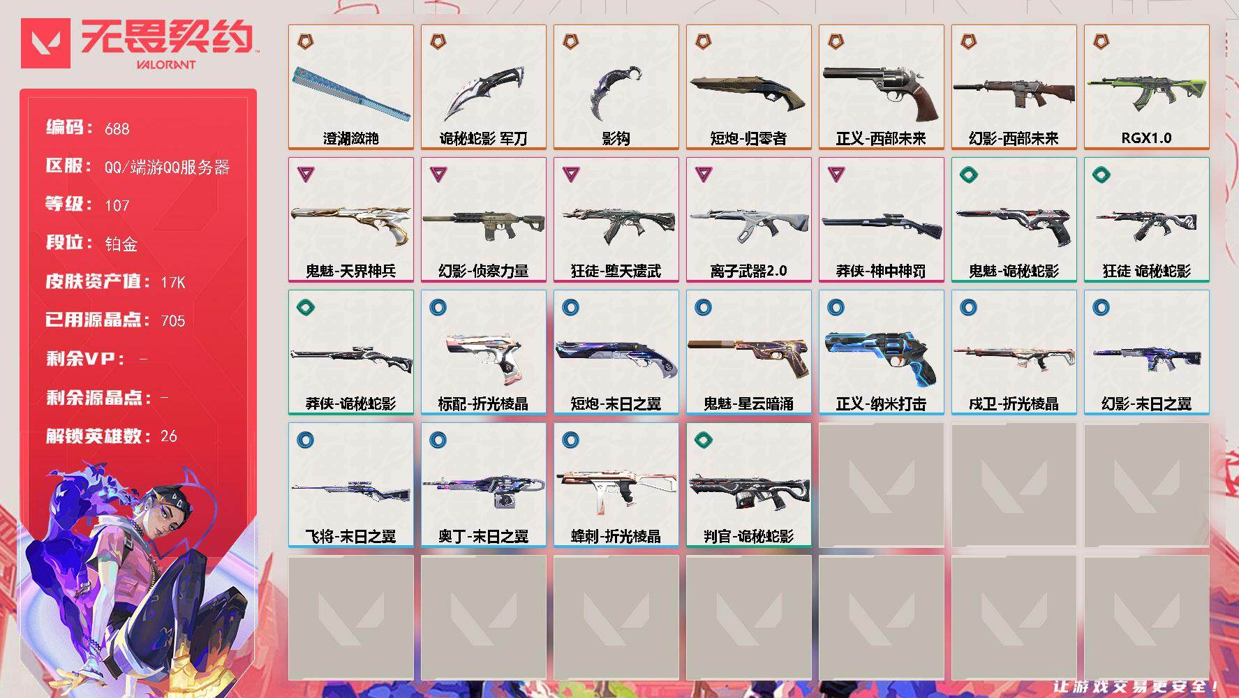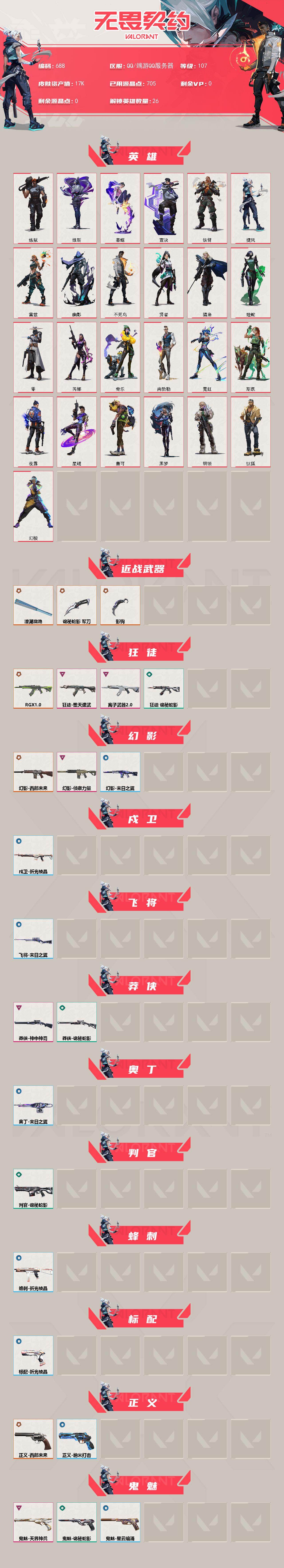 [15279640]【英雄】:幻棱,炼狱,维斯,暮蝶,钛狐,壹决,铁臂,捷风,雷兹,幽影,不死鸟,贤者,猎枭,蝰蛇,零,芮娜,奇乐,尚勃勒,霓虹,斯凯,夜露,星礈,盖可,黑梦,钢锁 【近战武器】:近战武器-影钩,近战武器-澄湖潋滟,近战武器-诡秘蛇影 军刀 【狂徒】:狂徒-RGX 11z Pro,狂徒-堕天遗武,狂徒-离子武器//2.0,狂徒-诡秘蛇影 【幻影】:幻影-西部未来,幻影-侦察力量,幻影-末日之翼,幻影-西部未来 【戍卫】:戍卫-折光棱晶 【飞将】:飞将-末日之翼 【莽侠】:莽侠-神中神罚,莽侠-诡秘蛇影 【奥丁】:奥丁-末日之翼 【判官】:判官-诡秘蛇影 【蜂刺】:蜂刺-折光棱晶 【标配】:标配-折光棱晶 【正义】:正义-西部未来,正义-纳米打击 【鬼魅】:鬼魅-天界神兵,鬼魅-诡秘蛇影,鬼魅-星云暗涌 【短炮】:短炮-归零者,短炮-末日之翼 【卡面】:终章:激斗汉堡 卡面,进入射程 卡面,《双城之战》拥抱 卡面,精灵大战 卡面,欢迎来到底城 卡面,南瓜盛典 卡面,热舞环节 卡面,梦幻奶茶 卡面,无畏契约GO!第一卷:芮娜 卡面,无畏契约GO!第一卷:零 卡面,《双城之战》金克丝 卡面,暗枪 卡面,代号红色 卡面,新兵报到 卡面,V契约 卡面,无畏契约 卡面 【喷漆】:嗨宝南瓜灯 喷漆,嘭! 喷漆,都算到了 喷漆,控场勿近 喷漆,买装还是存钱 喷漆,胜利属于无畏契约 喷漆,GLHF 喷漆,无畏契约 喷漆 【挂饰】:终章:猫猫木乃伊 挂饰,悠闲鸡块 挂饰,伞绳 挂饰,《双城之战》小蛋糕 挂饰,第九季//第三幕 纪念币 挂饰,天外飞客 挂饰,好运福爪 挂饰,无畏契约 纪念币 挂饰