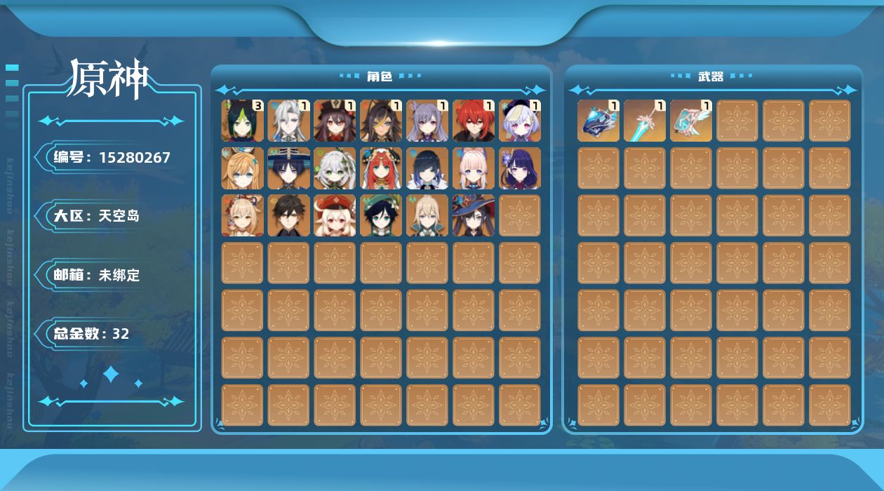- [15187127]57级/27黄/男主/15个五星角色/4个五星武器 0命芙宁娜,1命迪希雅,0命流浪者,0命纳西妲,3命提纳里,1命夜兰,0命荒泷一斗,0命枫原万叶,0命神里绫华,0命钟离,0命宵宫,0命刻晴,1命七七,1命琴,0命迪卢克,精1最初的大魔术,精1四风原典,精1天空之脊,精2阿莫斯之弓