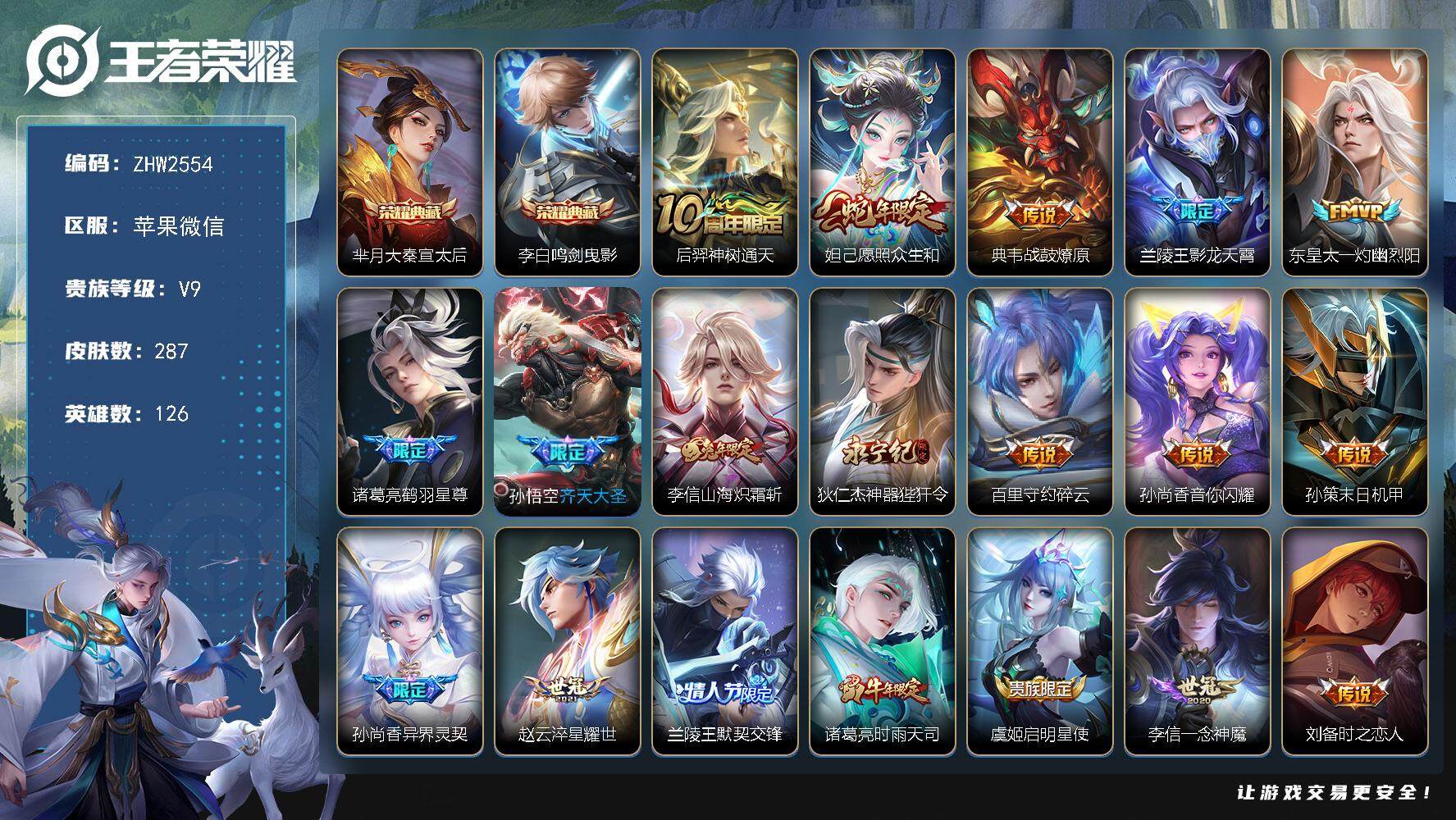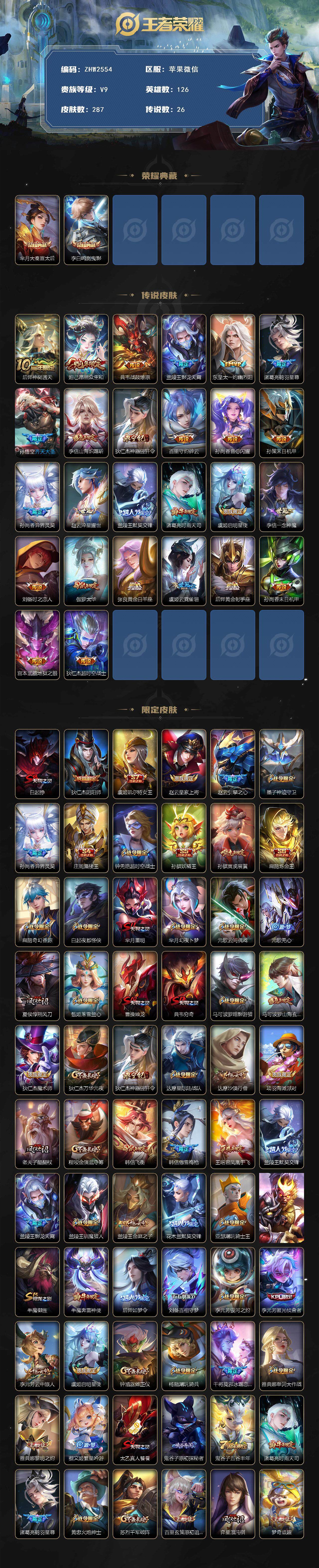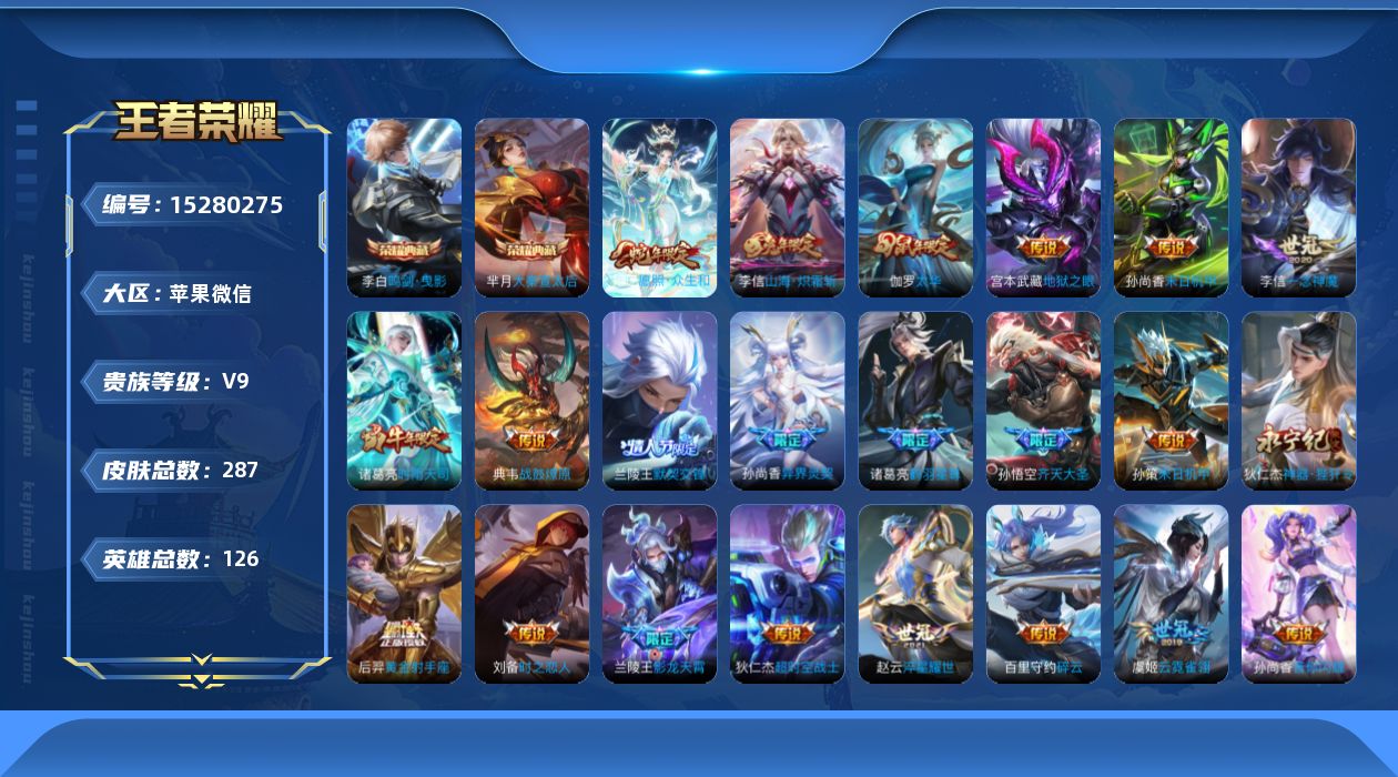 [15280275]苹果WX-发育路40段!136933积分!V9-126英雄-287皮肤-2典藏皮肤-26传说-93史诗-2星元 【英雄全皮】:李信全皮,空空儿全皮 【荣耀典藏】:芈月大秦宣太后,李白鸣剑曳影 【传说皮肤】:后羿神树通天,妲己愿照众生和,典韦战鼓燎原,兰陵王影龙天霄,东皇太一灼幽烈阳,诸葛亮鹤羽星尊,孙悟空齐天大圣,李信山海炽霜斩,狄仁杰神器狴犴令,百里守约碎云,孙尚香音你闪耀,孙策末日机甲,孙尚香异界灵契,赵云淬星耀世,兰陵王默契交锋,诸葛亮时雨天司,虞姬启明星使,李信一念神魔,刘备时之恋人,伽罗太华,张良黄金白羊座,虞姬云霓雀翎,后羿黄金射手座,孙尚香末日机甲,宫本武藏地狱之眼,狄仁杰超时空战士 【限定皮肤】:白起狰,狄仁杰阴阳师,虞姬凯尔特女王,赵云皇家上将,赵云引擎之心,墨子神迹守卫,孙尚香异界灵契,庄周蜃楼王,钟无艳超时空战士,孙膑妖精王,孙膑寅虎展翼,扁鹊炼金王,扁鹊奇幻香踪,白起夜都怪侠,芈月重明,芈月幻夜卜梦,元歌云间偶戏,元歌无心,夏侯惇朔风刀,甄姬落雪兰心,曹操烛龙,典韦穷奇,马可波罗暗影游猎,马可波罗山海玄木吟,狄仁杰魔术师,狄仁杰万华元夜,狄仁杰神器狴犴令,达摩星际陆战队,达摩沙漠行僧,项羽海滩派对,老夫子醍醐杖,程咬金演武夺筹,韩信飞衡,韩信傲雪梅枪,王昭君凤凰于飞,兰陵王默契交锋,兰陵王影龙天霄,兰陵王驯魔猎人,兰陵王金庭之子,花木兰默契交锋,亚瑟潮玩骑士王,孙悟空齐天大圣,牛魔御旌,牛魔奔雷神使,后羿如梦令,刘备百相守梦,李元芳银河之约,李元芳匿光侦查者,李元芳云中旅人,虞姬启明星使,钟馗驱傩正仪,杨戬潮玩骑兵,干将莫邪冰霜恋舞曲,雅典娜单词大作战,雅典娜黎明之约,蔡文姬繁星吟游,太乙真人饕餮,鬼谷子原初探秘者,鬼谷子五谷丰年,诸葛亮时雨天司,诸葛亮鹤羽星尊,黄忠火炮绅士,苏烈千军破阵,百里玄策原初追逐者,弈星混沌棋,梦奇顽趣,沈梦溪星空之诺,明世隐疑决卦,明世隐吟游魔法,裴擒虎李小龙,裴擒虎擒涛扼浪,狂铁御狮,米莱狄御霄,米莱狄胡桃异想国,瑶山海碧波行,云中君纤云弄巧,李信山海炽霜斩,伽罗太华,伽罗天狼溯光者,猪八戒西部大镖客,上官婉儿梁祝,上官婉儿天狼绘梦者,嫦娥拒霜思,嫦娥暖冬兔眠,西施玲珑珍味,蒙犽狂想玩偶喵,鲁班大师探海日志,桑启海盐诗旅,戈娅驭风魔法,艾琳女武神,艾琳流音漫舞,张良古海寻踪,蒙恬荣光圣徽 【年限皮肤】:孙膑寅