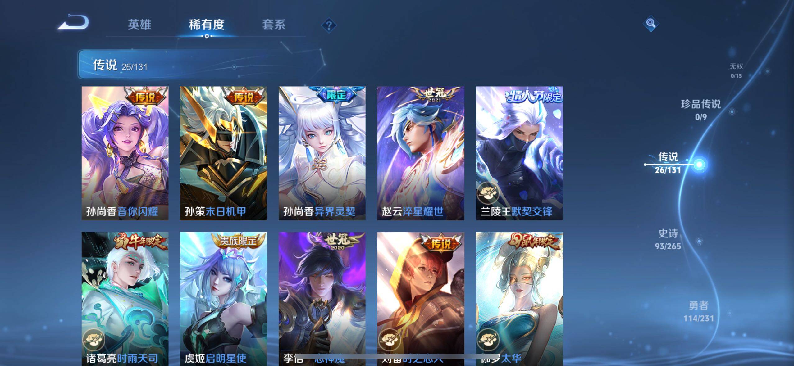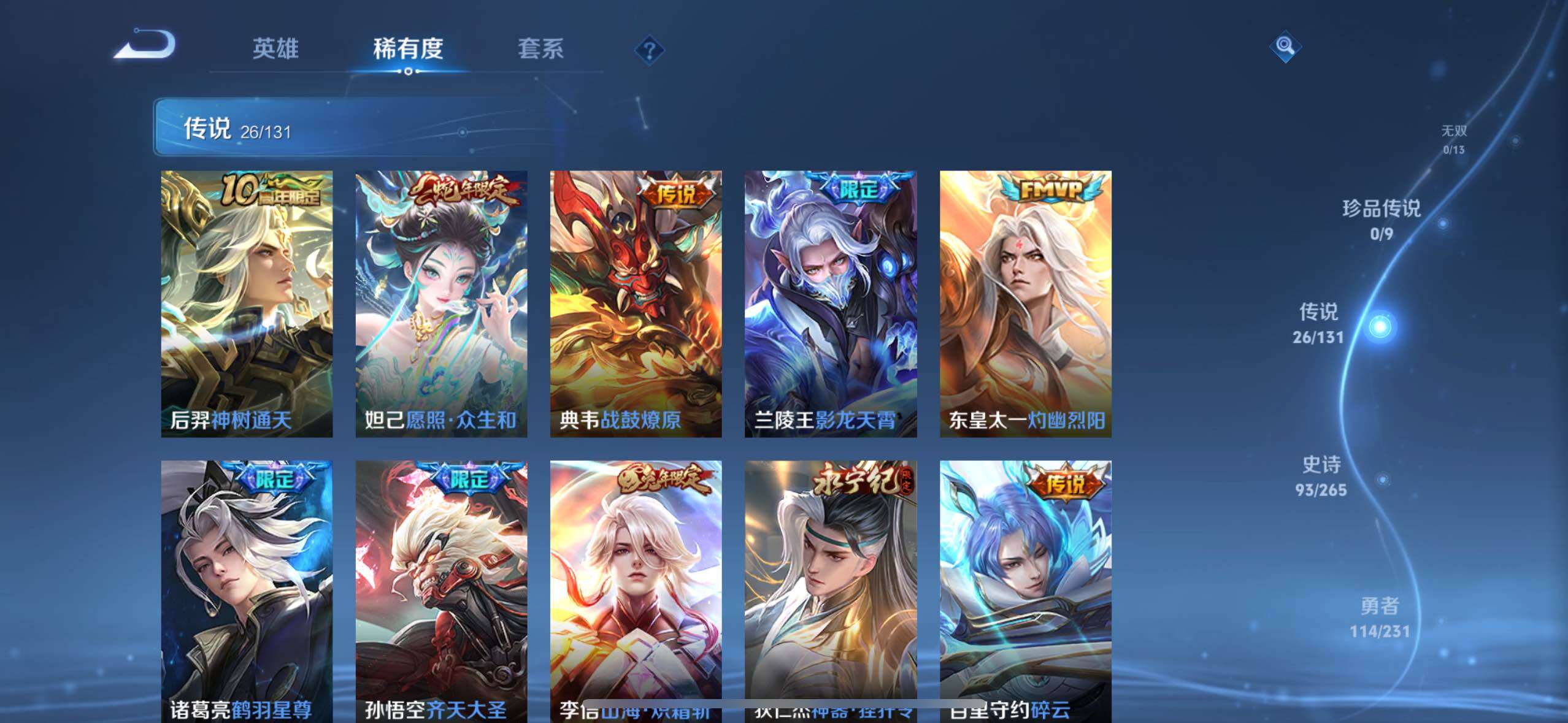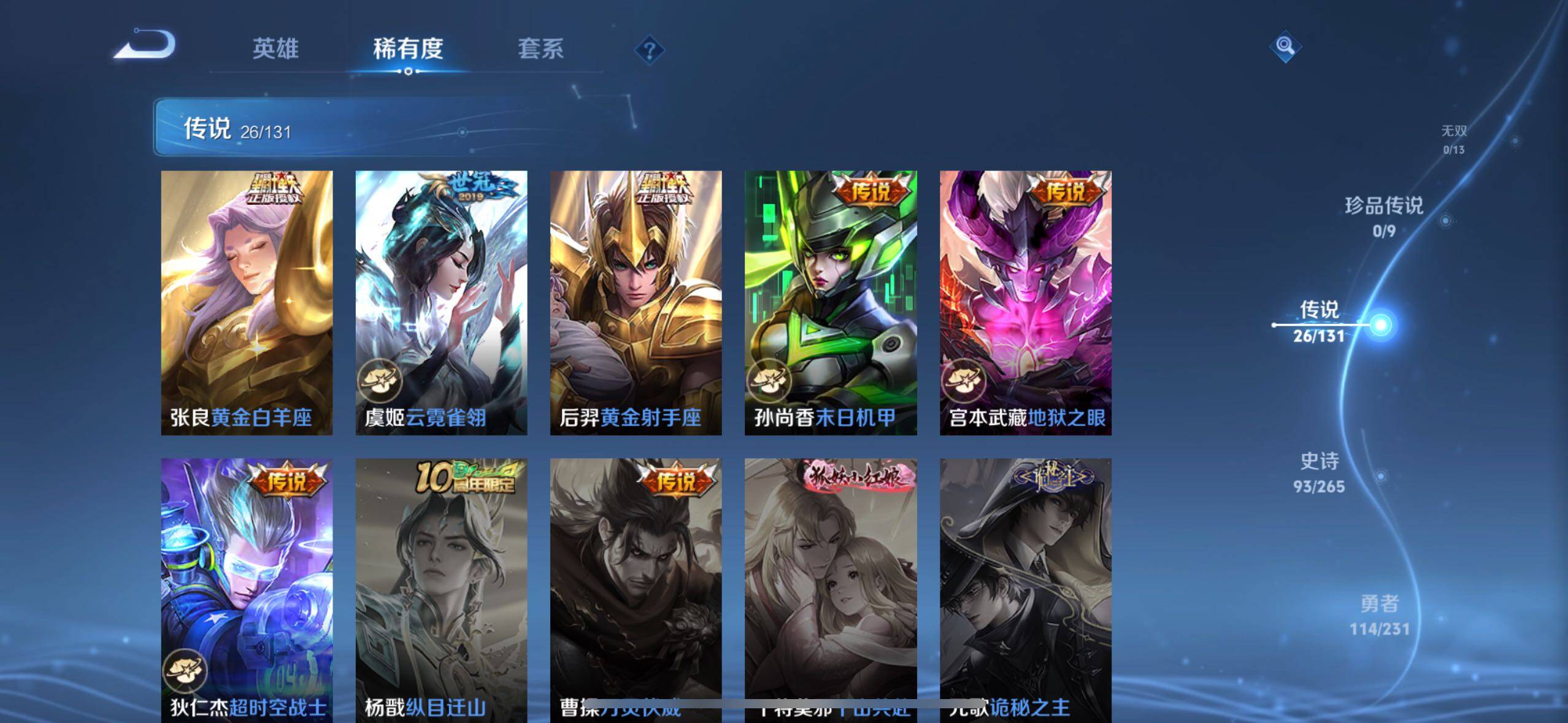 【传说皮肤】:后羿神树通天,妲己愿照众生和,典韦战鼓燎原,兰陵王影龙天霄,东皇太一灼幽烈阳,诸葛亮鹤羽星尊,孙悟空齐天大圣,李信山海炽霜斩,狄仁杰神器狴犴令,百里守约碎云,孙尚香音你闪耀,孙策末日机甲,孙尚香异界灵契,赵云淬星耀世,兰陵王默契交锋,诸葛亮时雨天司,虞姬启明星使,李信一念神魔,刘备时之恋人,伽罗太华,张良黄金白羊座,虞姬云霓雀翎,后羿黄金射手座,孙尚香末日机甲,宫本武藏地狱之眼,狄仁杰超时空战士