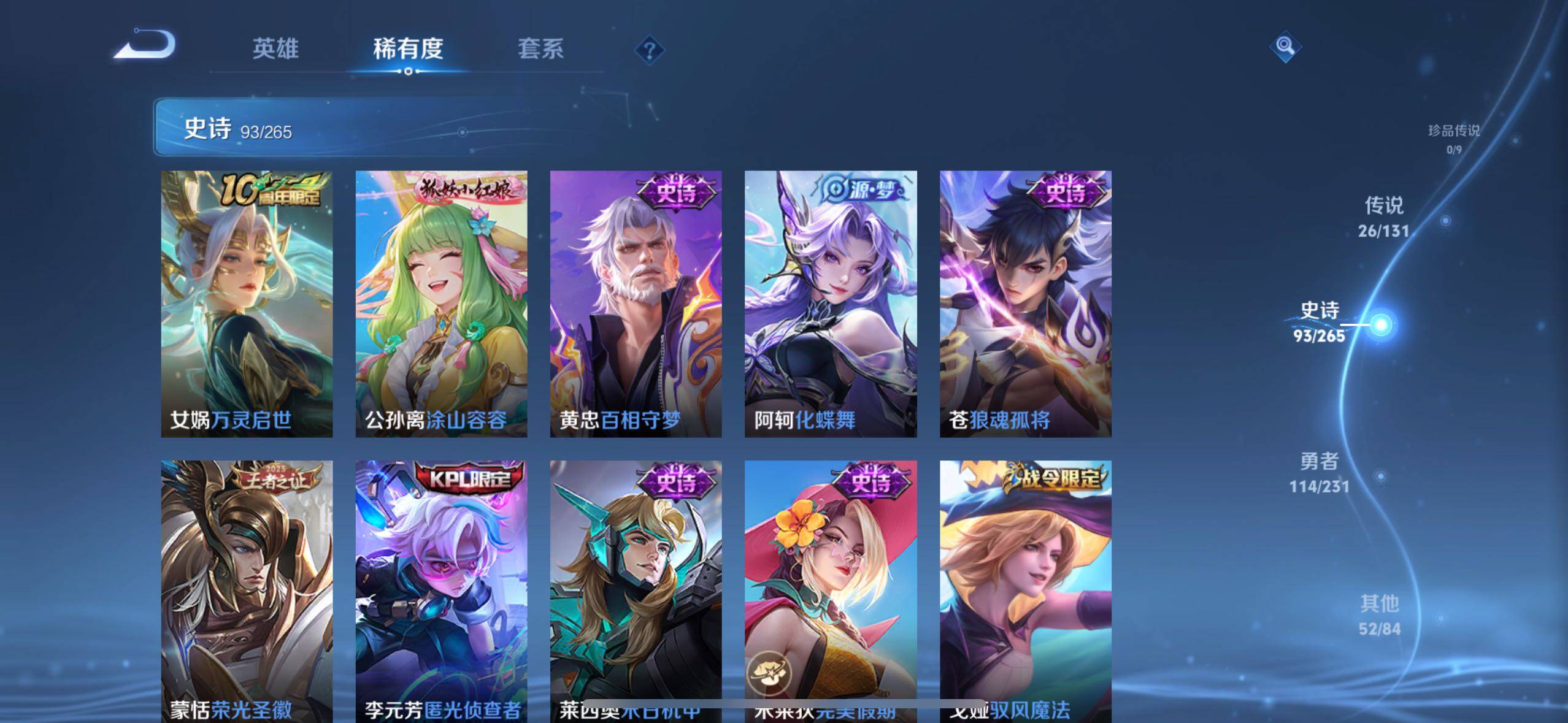庄周蜃楼王,孙膑妖精王,扁鹊炼金王,虞姬凯尔特女王,白起狰,太乙真人饕餮,曹操烛龙,芈月重明,典韦穷奇,狂铁御狮,米莱狄御霄,牛魔御旌,夏侯惇朔风刀,明世隐疑决卦,老夫子醍醐杖,鬼谷子原初探秘者,狄仁杰万华元夜,程咬金演武夺筹,钟馗驱傩正仪,苏烈千军破阵,沈梦溪星空之诺,李元芳银河之约,马可波罗暗影游猎,蒙犽狂想玩偶喵,元歌云间偶戏,弈星混沌棋,达摩沙漠行僧,兰陵王金庭之子,李元芳云中旅人,桑启海盐诗旅,裴擒虎擒涛扼浪,鲁班大师探海日志,张良古海寻踪