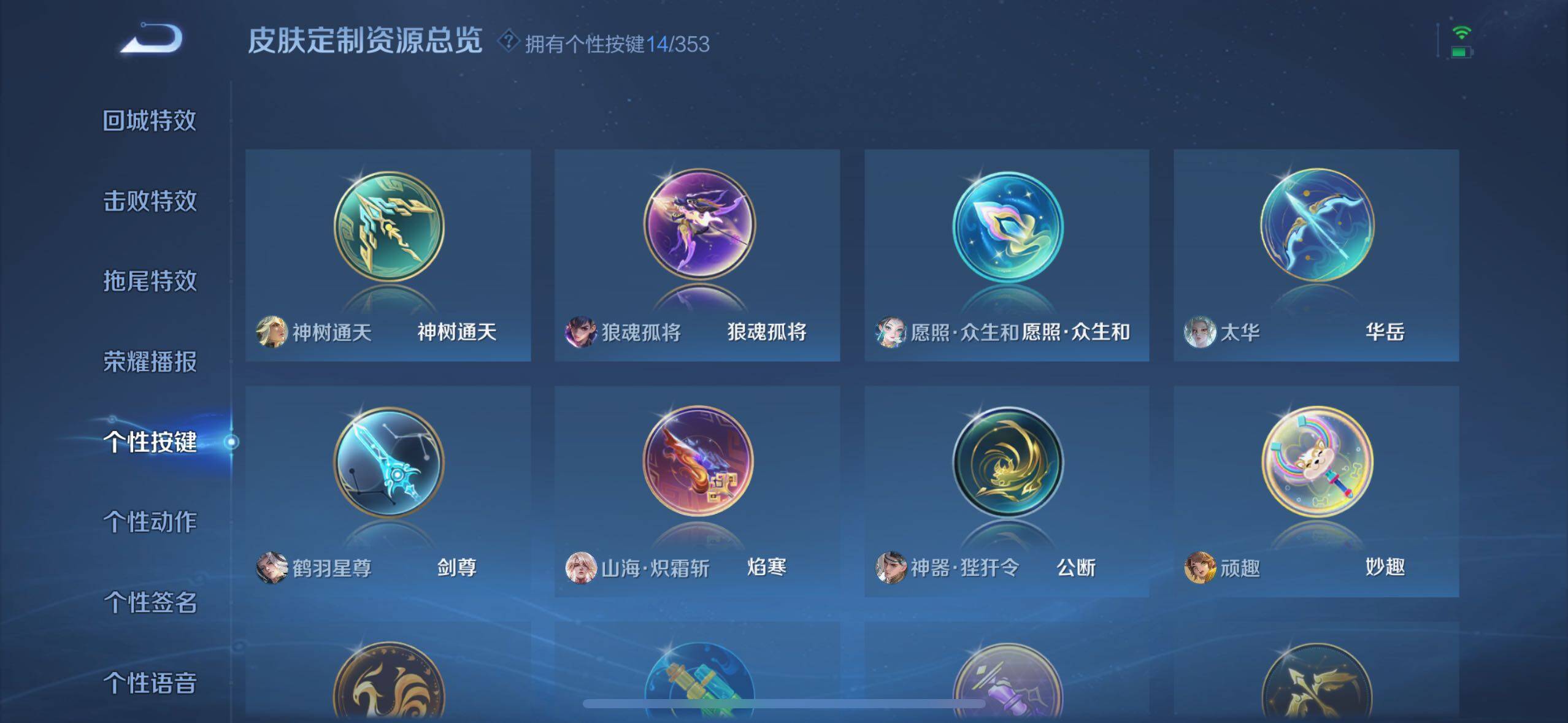 裴擒虎李小龙,上官婉儿梁祝,牛魔奔雷神使,诸葛亮时雨天司,韩信飞衡,伽罗太华,上官婉儿天狼绘梦者,伽罗天狼溯光者,王昭君凤凰于飞,花木兰默契交锋,兰陵王默契交锋,后羿如梦令,干将莫邪冰霜恋舞曲,赵云引擎之心,孙尚香异界灵契,韩信傲雪梅枪,孙膑寅虎·展翼,马可波罗山海·玄木吟,瑶山海·碧波行,兰陵王影龙天霄,妲己愿照·众生和