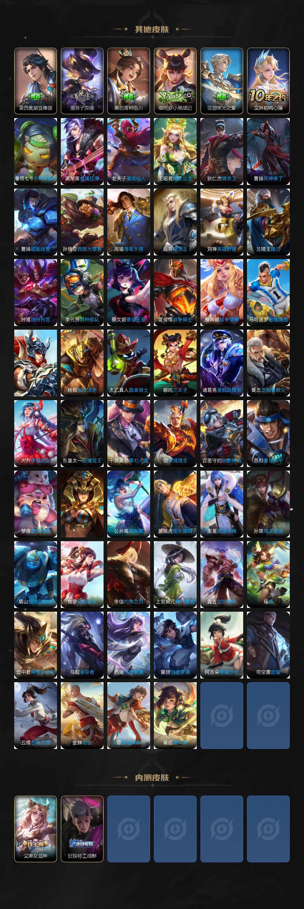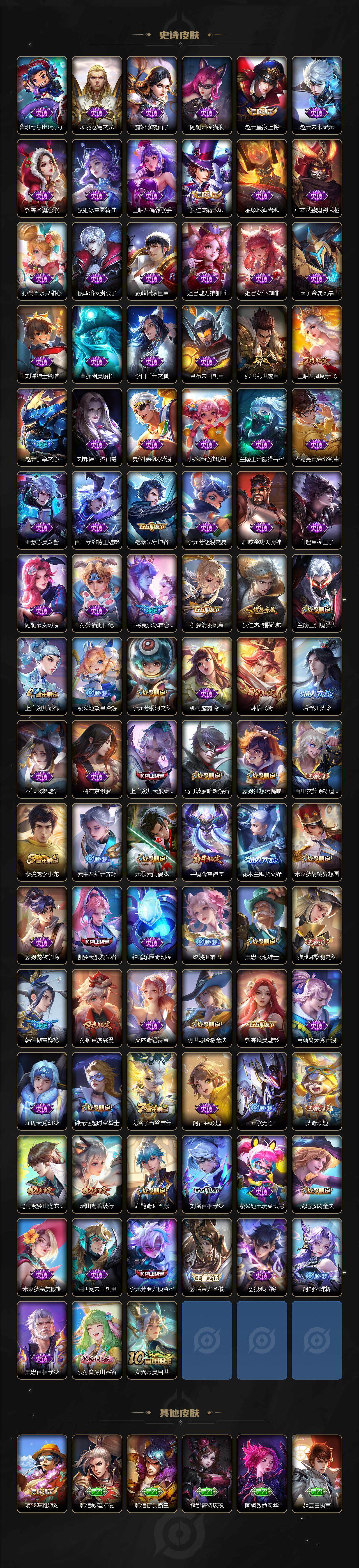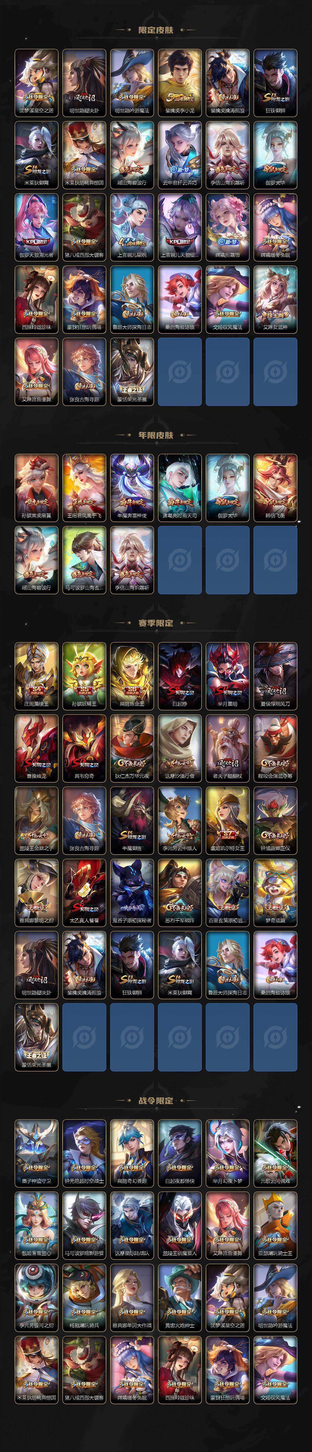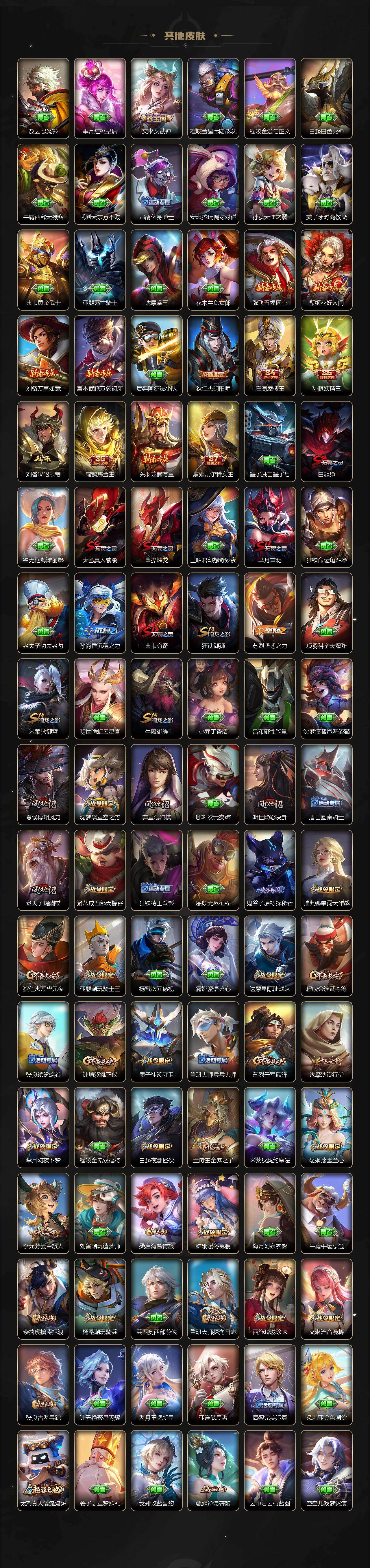 【限定皮肤】:白起狰,狄仁杰阴阳师,虞姬凯尔特女王,赵云皇家上将,赵云引擎之心,墨子神迹守卫,孙尚香异界灵契,庄周蜃楼王,钟无艳超时空战士,孙膑妖精王,孙膑寅虎展翼,扁鹊炼金王,扁鹊奇幻香踪,白起夜都怪侠,芈月重明,芈月幻夜卜梦,元歌云间偶戏,元歌无心,夏侯惇朔风刀,甄姬落雪兰心,曹操烛龙,典韦穷奇,马可波罗暗影游猎,马可波罗山海玄木吟,狄仁杰魔术师,狄仁杰万华元夜,狄仁杰神器狴犴令,达摩星际陆战队,达摩沙漠行僧,项羽海滩派对,老夫子醍醐杖,程咬金演武夺筹,韩信飞衡,韩信傲雪梅枪,王昭君凤凰于飞,兰陵王默契交锋,兰陵王影龙天霄,兰陵王驯魔猎人,兰陵王金庭之子,花木兰默契交锋,亚瑟潮玩骑士王,孙悟空齐天大圣,牛魔御旌,牛魔奔雷神使,后羿如梦令,刘备百相守梦,李元芳银河之约,李元芳匿光侦查者,李元芳云中旅人,虞姬启明星使,钟馗驱傩正仪,杨戬潮玩骑兵,干将莫邪冰霜恋舞曲,雅典娜单词大作战,雅典娜黎明之约,蔡文姬繁星吟游,太乙真人饕餮,鬼谷子原初探秘者,鬼谷子五谷丰年,诸葛亮时雨天司,诸葛亮鹤羽星尊,黄忠火炮绅士,苏烈千军破阵,百里玄策原初追逐者,弈星混沌棋,梦奇顽趣,沈梦溪星空之诺,明世隐疑决卦,明世隐吟游魔法,裴擒虎李小龙,裴擒虎擒涛扼浪,狂铁御狮,米莱狄御霄,米莱狄胡桃异想国,瑶山海碧波行,云中君纤云弄巧,李信山海炽霜斩,伽罗太华,伽罗天狼溯光者,猪八戒西部大镖客,上官婉儿梁祝,上官婉儿天狼绘梦者,嫦娥拒霜思,嫦娥暖冬兔眠,西施玲珑珍味,蒙犽狂想玩偶喵,鲁班大师探海日志,桑启海盐诗旅,戈娅驭风魔法,艾琳女武神,艾琳流音漫舞,张良古海寻踪,蒙恬荣光圣徽
