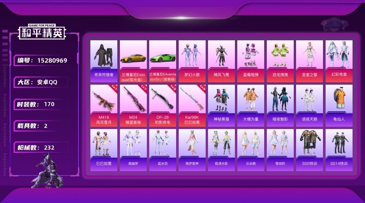 [15280969]【店主推荐捡漏号!可直接换绑】安卓 手Q-6粉装-4特效枪-2载具-6粉色飞行器-79988热力值-12王牌印记-170套装-232枪皮【热门品类】:粉装-梦幻火箭,套装-奇异狩猎者,套装-龟仙人【粉色载具】:兰博基尼Aventador SVJ(翡翠绿),兰博基尼Estoque(炫光金)【粉色套装】:粉装-梦幻火箭,粉装-飓风飞鹰,粉装-蓝莓炮弹,粉装-恐龙拽拽,角色-圣堂之誓,粉装-幻彩电音【粉色枪皮等级】:M416-风花雪月(七级),Kar98K-巳巳如意(五级),M24-暗星紫秘(七级),DP-28-豹影疾电(五级)【粉色枪皮】:M416-风花雪月,Kar98K-巳巳如意,M24-暗星紫秘,DP-28-豹影疾电【粉色飞行器】:梦幻火箭飞行器,神秘黑猫飞行器,齐天大圣飞行器,青春物语飞行器,繁龙极客飞行器