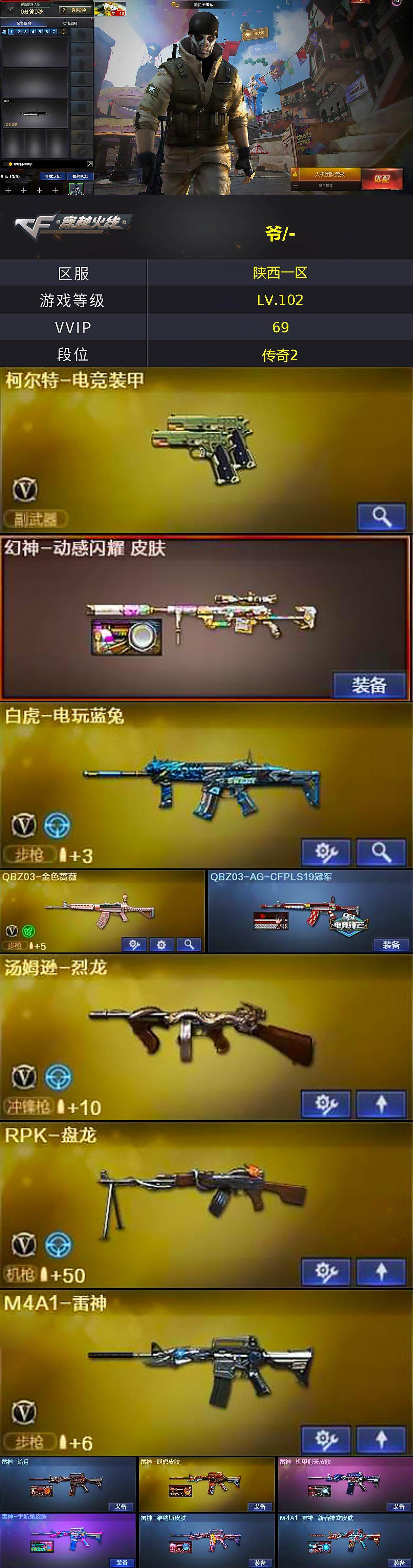 【皮肤】:幻神-动感闪耀 皮肤,QBZ03-AG-CFPLS19冠军,雷神-暗月,雷神-烈虎皮肤,雷神-机甲刑天皮肤,雷神-宇航兔皮肤,雷神-维纳斯皮肤,M4A1-雷神-新春神龙皮肤,火麒麟-雷神,火麒麟-轻羽皮肤,火麒麟-平天大圣*2,火麒麟-百城,火麒麟-心动糖果,毁灭-黑大圣皮肤*2,毁灭-风暴*2,毁灭-神秘黑洞皮肤,M4A1-千变-孔明皮肤,黑龙-能量核心,黑龙-墨子皮肤,黑骑士-暗月,黑骑士耀金皮肤,黑骑士-电玩青兔皮肤,黑骑士-破浪10年皮肤,死神-秘银,战神-粉色甜心皮肤,天龙-能量核心,AWM-天龙-传奇70KG,修罗-CF STAR,修罗-能量核心