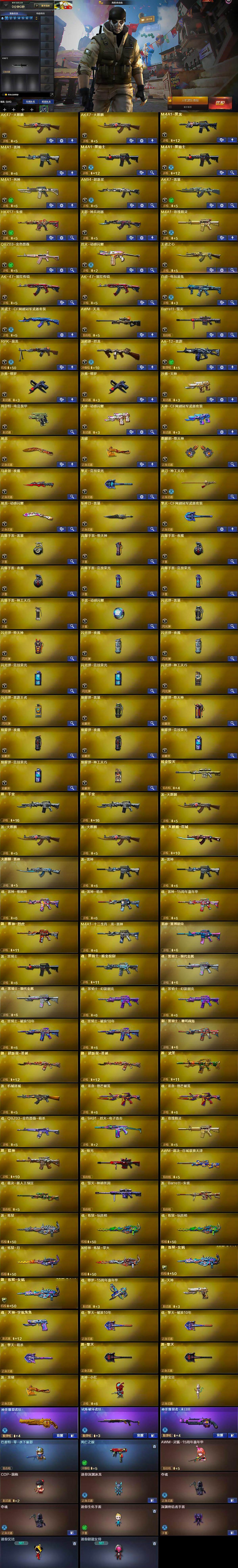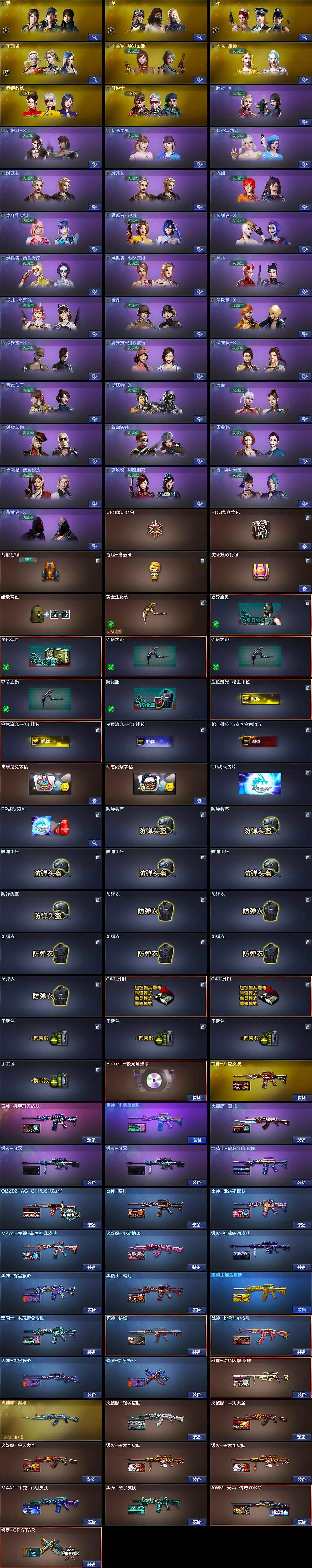 【英雄级武器】:AK47-火麒麟*2,M4A1-黑龙,M4A1-雷神,M4A1-黑骑士*2,M4A1-死神,AN94-超新星,AK47-雷暴,HK417-朱雀,无影-神兵利器,M4A1-玫瑰精灵,QBZ03-金色蔷薇,烈火-动感闪耀,王者之心-觉醒版,AK-47-猩红传说*2,白虎-电玩蓝兔,黑武士-CF网剧冠军,AWM-天龙,Barrett-毁灭,RPK-盘龙,汤姆逊-烈龙,AA-12-雷霆,沙鹰-修罗*2,沙鹰-天神,柯尔特-电竞装甲,天神-动感闪耀,天神-CF网剧冠军