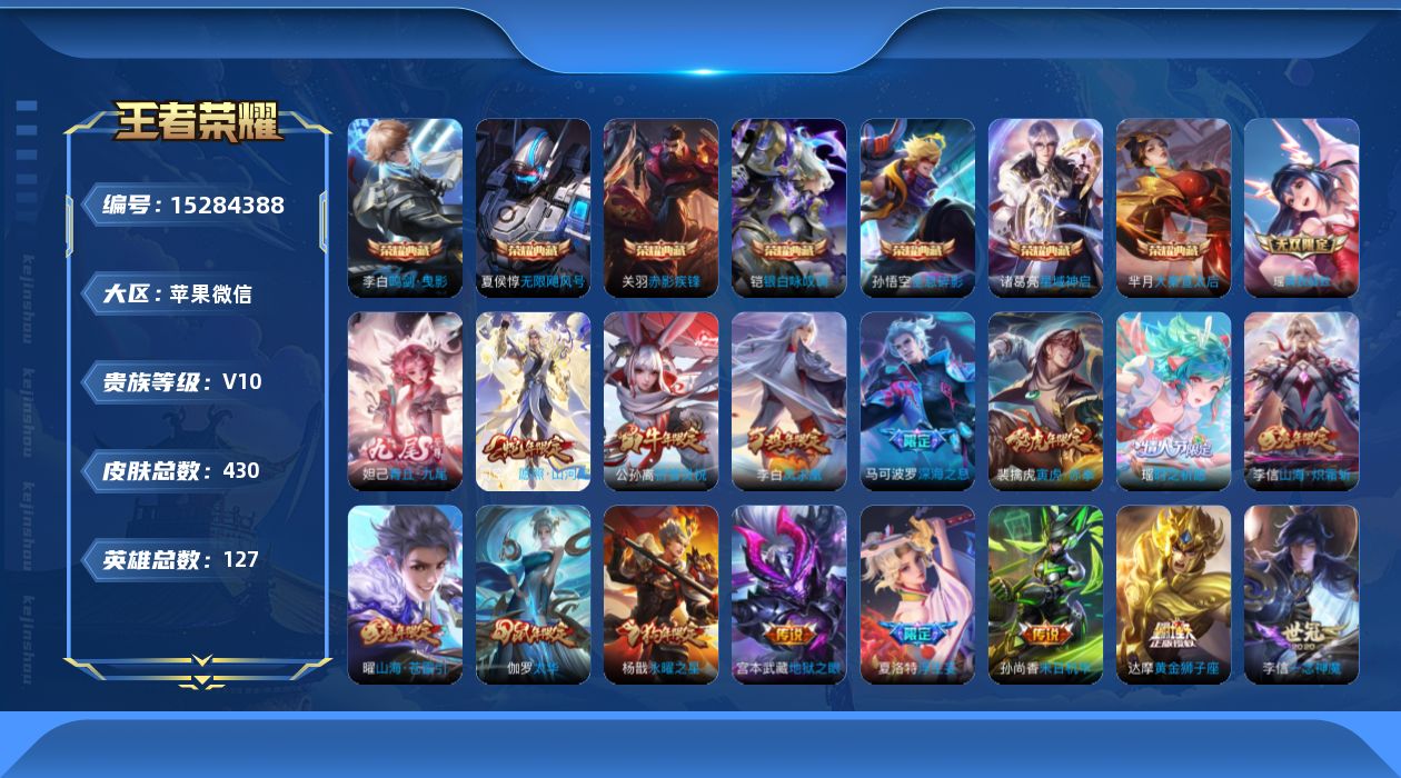 [15284388]苹果WX-V10-最强王者段位-127英雄-430皮肤-7典藏皮肤-2无双-59传说-147史诗-4星传