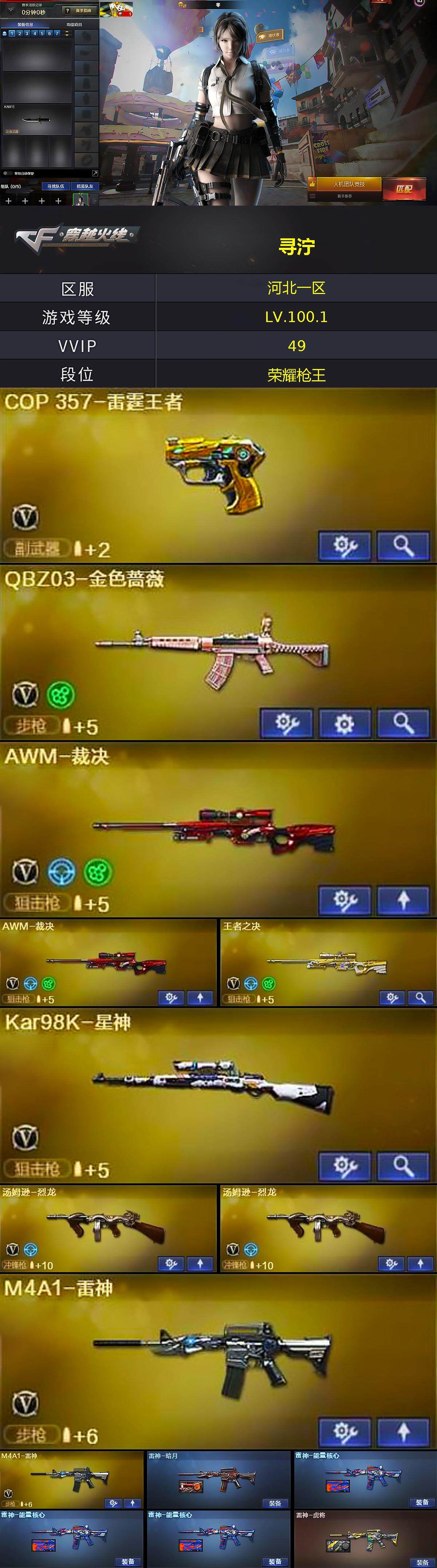- [11521528]1传说角色 6王者武器 1炫金武器 40V武器 可二次 可修改实名 优质装备:M200-幻神,王者幻神,M200-竞技荣光,AK47-火麒麟,M4A1-雷神,M4A1-黑骑士,M4A1-黑龙,M4A1-青龙,Barrett-毁灭,AWM-裁决,AA-12-雷霆,AN94-超新星,沙鹰-修罗,柯尔特-竞技荣光,擎天-竞技荣光,传说幽冥,龙啸-烈火龙威,天神-动感闪耀,屠龙-动感闪耀,AK47-黑武士-锦绣游龙,无影-神兵利器,修罗-古蛇迷踪 排位资格:有 V武器:AK47-黑鲨 王者武器:QBZ-03-王者蔷薇-觉醒版,王者之翼-觉醒版,王者之幻-觉醒版 炫金武器:炫金无影 热门武器:牛牛-AK47